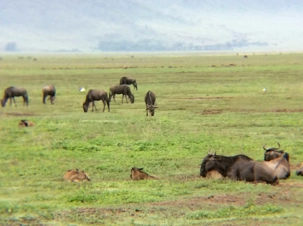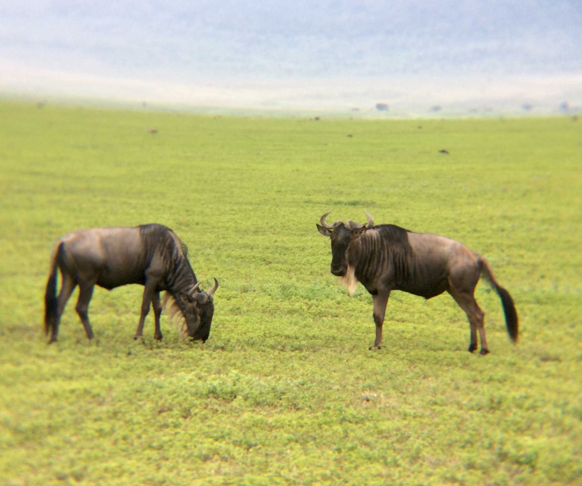Après un excellent déjeuner, 6h30, le soleil se lève à peine, nous montons à bord de nos jeeps pour entreprendre notre descente vers les plaines du cratère. Le ciel est nuageux avec l’espoir d’un dégagement! L’odeur d’humidité et la fraicheur matinale réveillent agréablement nos sens. Nous sommes tout de même à 2300m et nous nous apprêtons à descendre au niveau du cratère à 1600m. Ce dernier couvre plus de 260 km carrés. Au fait, il s’agit plutôt d’une caldera : un ancien volcan gigantesque qui s’est effondré il y a près de 2.5 millions d’années.