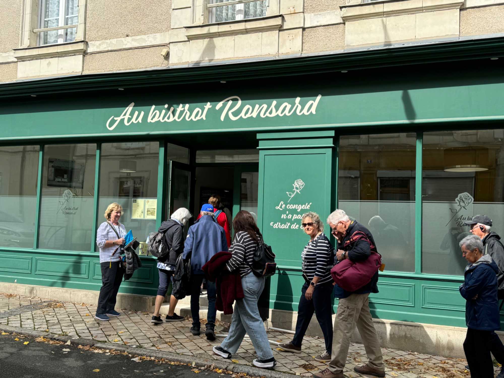 Nous nous rendons à l’Hôtel de Ville du village puisque nous sommes attendus pour un vin d’honneur en compagnie de madame Le Maire. Cette invitation est à la demande de David avec qui Louise travaille dans la préparation de voyages et qui est né à Lude. Des petits fours salés préparés avec des produits du terroir nous sont servis accompagnés de jus de pomme, de cidre ou d’un vin blanc. Par la suite, nous allons au Bistrot Ronsard pour le dîner avant de retourner à Tours.