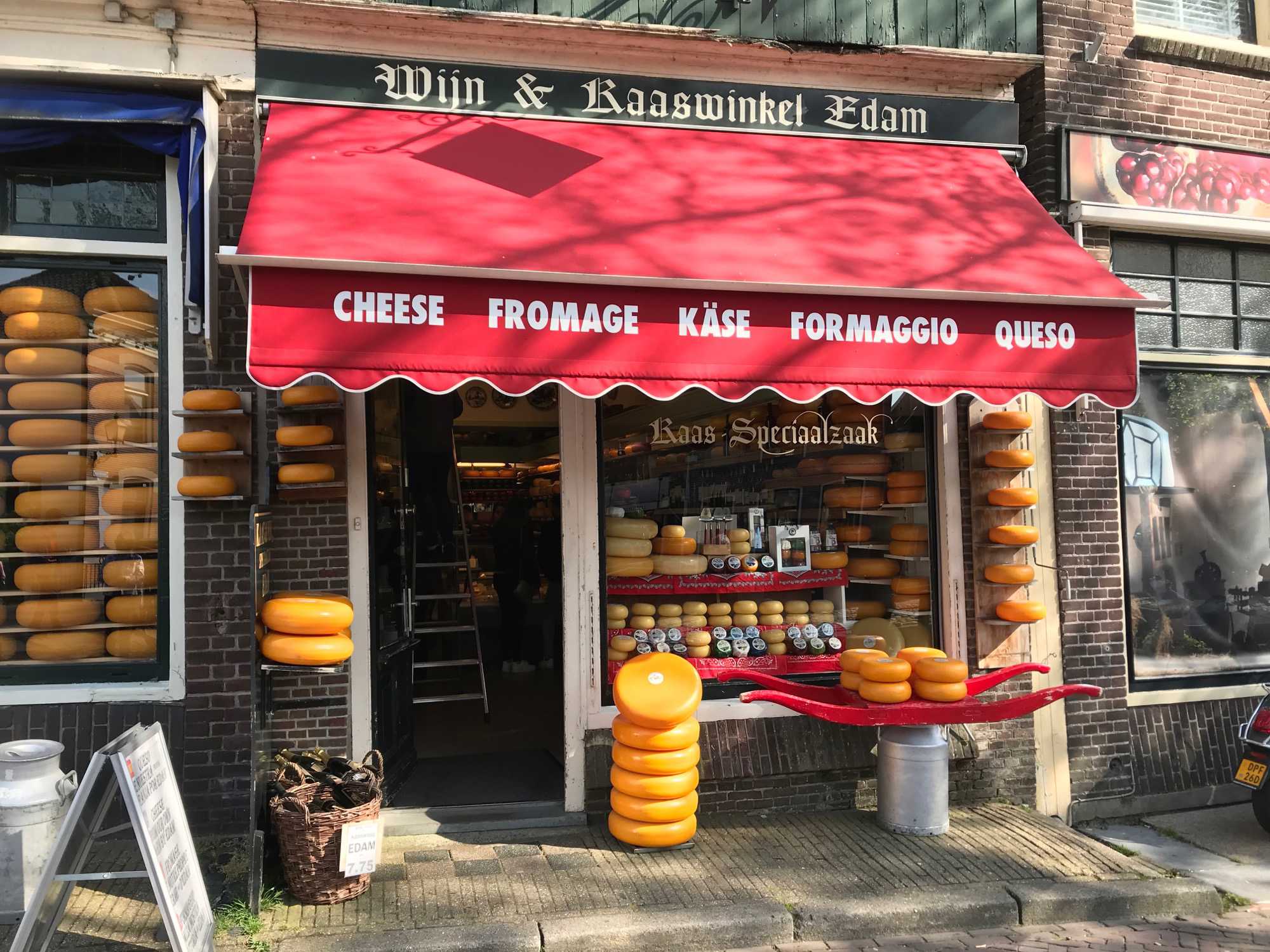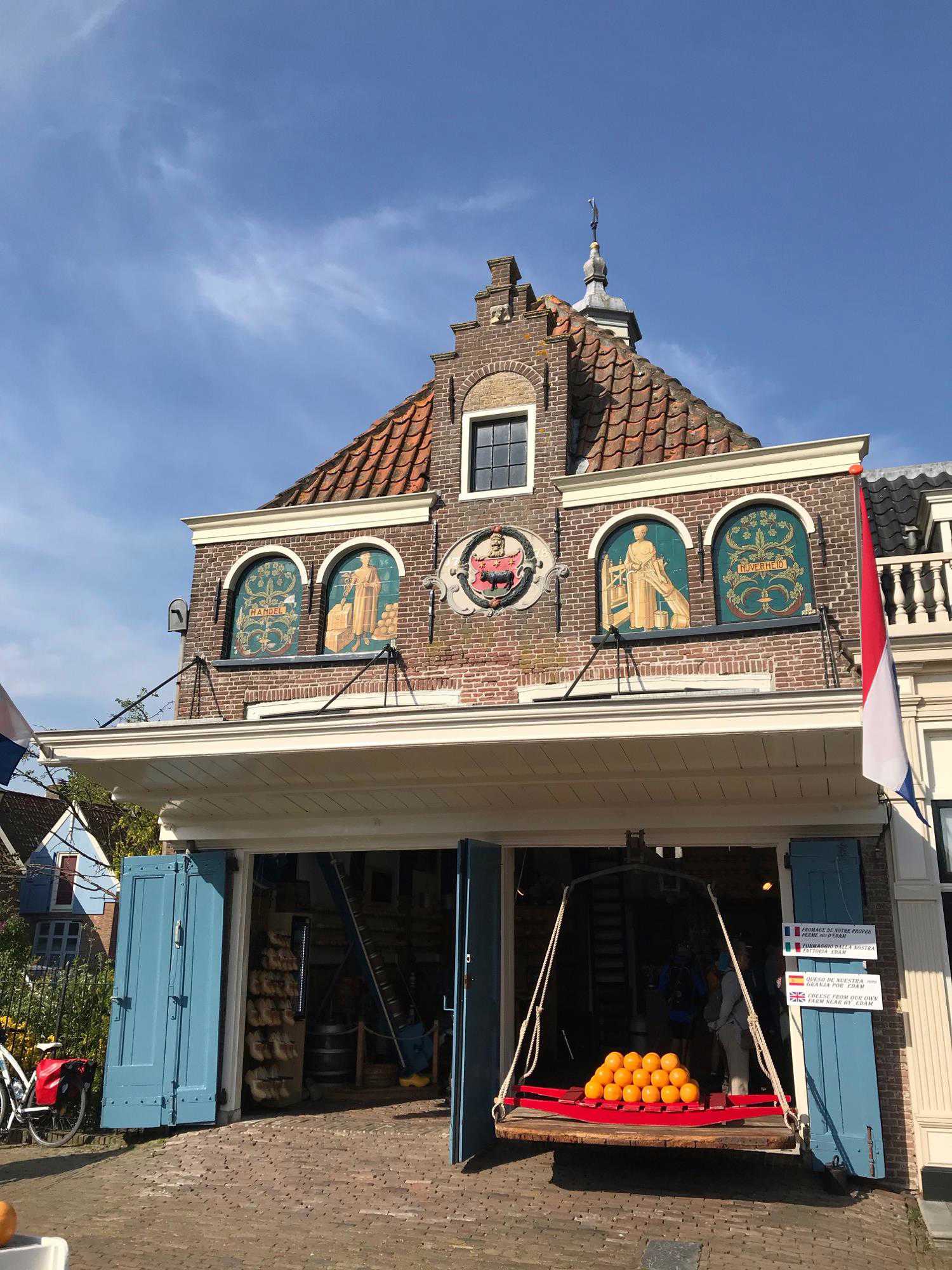 Puis nous poursuivons notre balade vers la petite ville d’Edam, située à seulement 5 km de Volendam. Edam est bien sûr réputée pour ses fromages ronds éponymes. Edam a beau être une petite ville, nous y retrouvons plusieurs très belles maisons, des ponts, des places, des entrepôts et des églises. Je trouve qu’Edam est une très jolie petite ville, pas touristique et empreinte d'authenticité. Beaucoup de personnes ont eu un coup de coeur pour ce petit village. On a fait une belle promenade avec notre guide, toute zen. Nous sommes lundi saint, et il y a très peu de monde dans la ville tôt le matin et pas beaucoup sur les routes aussi.