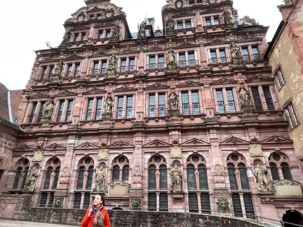 Situé près du vieux pont sur la rivière Neckar, l’impressionnante ruine du château est une des attractions les plus prisées de l’Allemagne et un point de repère majeur de Heidelberg. Le château a été construit à partir du grès rose de la vallée du Neckar pendant le 13ème siècle comme une forteresse et plus tard a servi de résidence pour l’électeur de Heidelberg jusqu’à sa destruction en 1689, pendant la guerre de Neuf Ans. Au fil des siècles, il avait été reconstruit par divers électeurs et aujourd’hui montre des éléments stylistiques distinctes de trois périodes. Ce sont tout de même des ruines très bien conservées et il y a encore beaucoup d’éléments à admirer! Le château d’Heidelberg est franchement impressionnant : on ne se rend pas forcément compte de sa taille en le regardant d’en bas, mais il est énorme. Nous découvrons l’extérieur de ce magnifique château de grès rose partiellement en ruine. Depuis la fin du XVIIIème siècle, les ruines du château inspirèrent les peintres et les poètes qui y voyaient un symbole de la grandeur et de la décadence des oeuvres humaines. Goethe, Hölderlin, Uhland et Eichendorff ont célébré le paysage du château tandis que de nombreux peintres le choisissaient pour motif. L’un des plus grands tonneaux en bois du monde qui, autrefois, a été rempli de vin (228000 litres), se trouve dans la cave du château. Il est impossible de le sortir de cette pièce, il ne passe pas par la porte! Surplombant la ville, nous avons eu une magnifique vue lorsque nous nous sommes promenés le long de ses terrasses. Le château compte quelques bâtiments rénovés, mais aussi des parties authentiques qui sont un peu plus en ruines. Même les ruines du château, majestueuses encore, semblent témoigner de la puissance et de la splendeur de ses anciens habitants, les Wittelbach. Construit vers 1300 pour être un bastion muni de tours, de casemates et de fossés, le château devint, au cours des siècles, l’emblème féodal de différents princes électeurs du Palatinat.