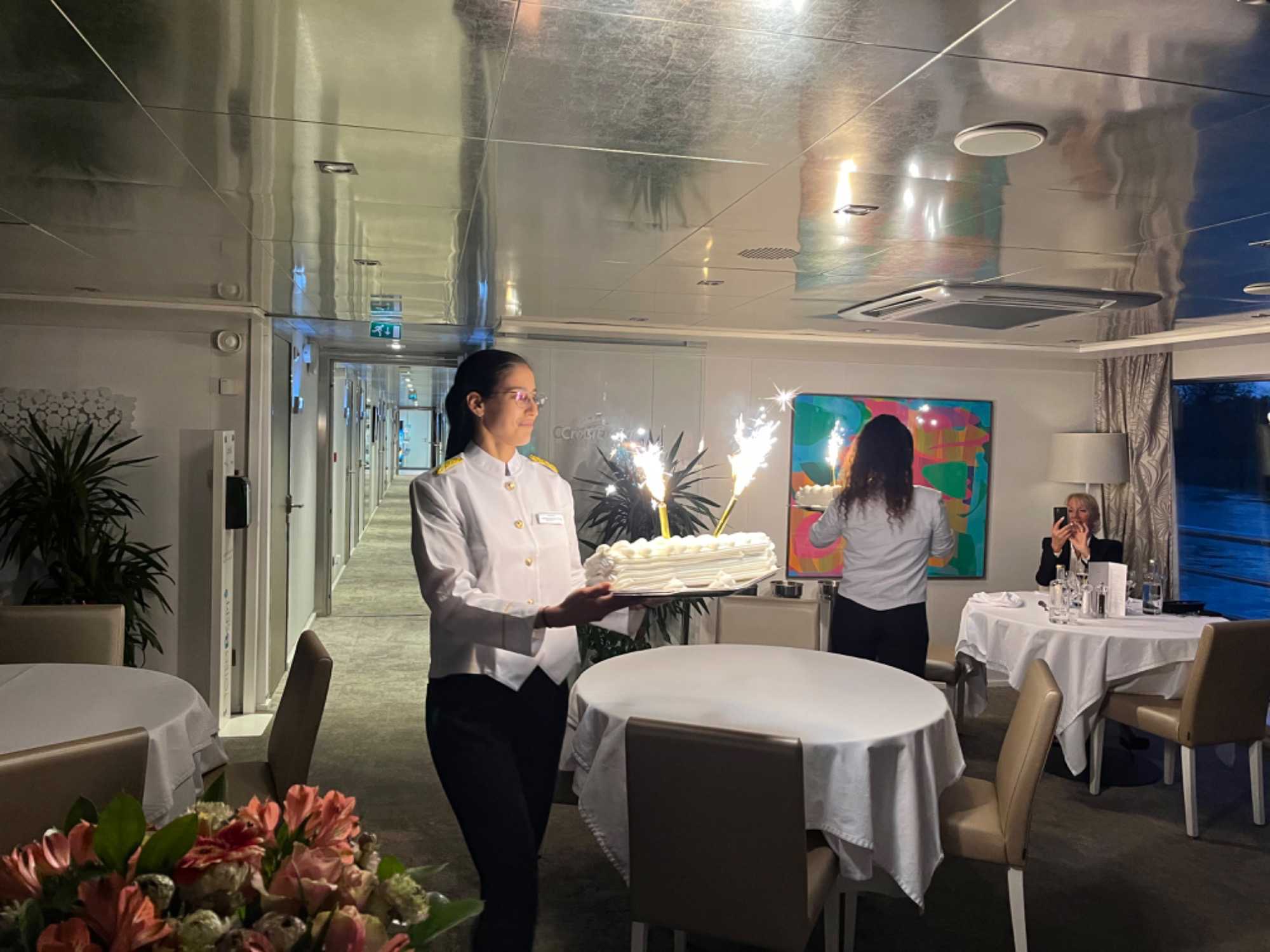 De retour au navire pour le souper. Les voyageurs adorent ce style de voyage. Dès notre embarquement, nous poursuivons notre navigation vers Strasbourg. Après cette belle journée de découvertes, un souper de gala nous attend! Déjà que les repas précédents nous ont fait apprécier grandement la fine cuisine française, imaginez comment nous avons été choyés par ce souper de cinq services avec toute l’attention d’un grand chef français. Quel délice, allez voir nos photos pour en avoir une bonne idée. Tout le monde est en forme et apprécie grandement son voyage.