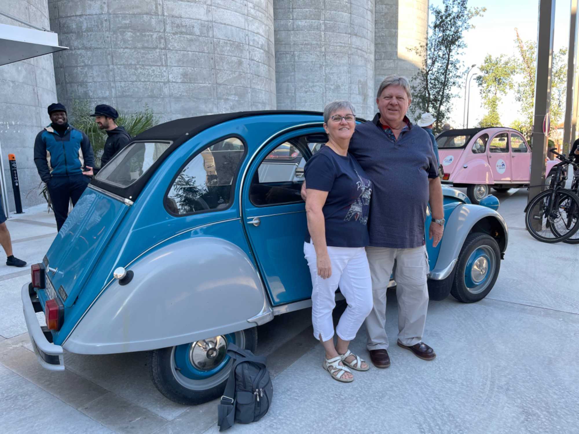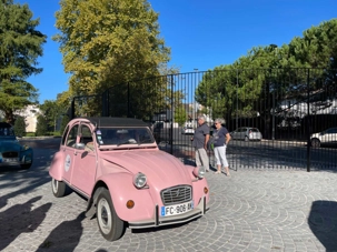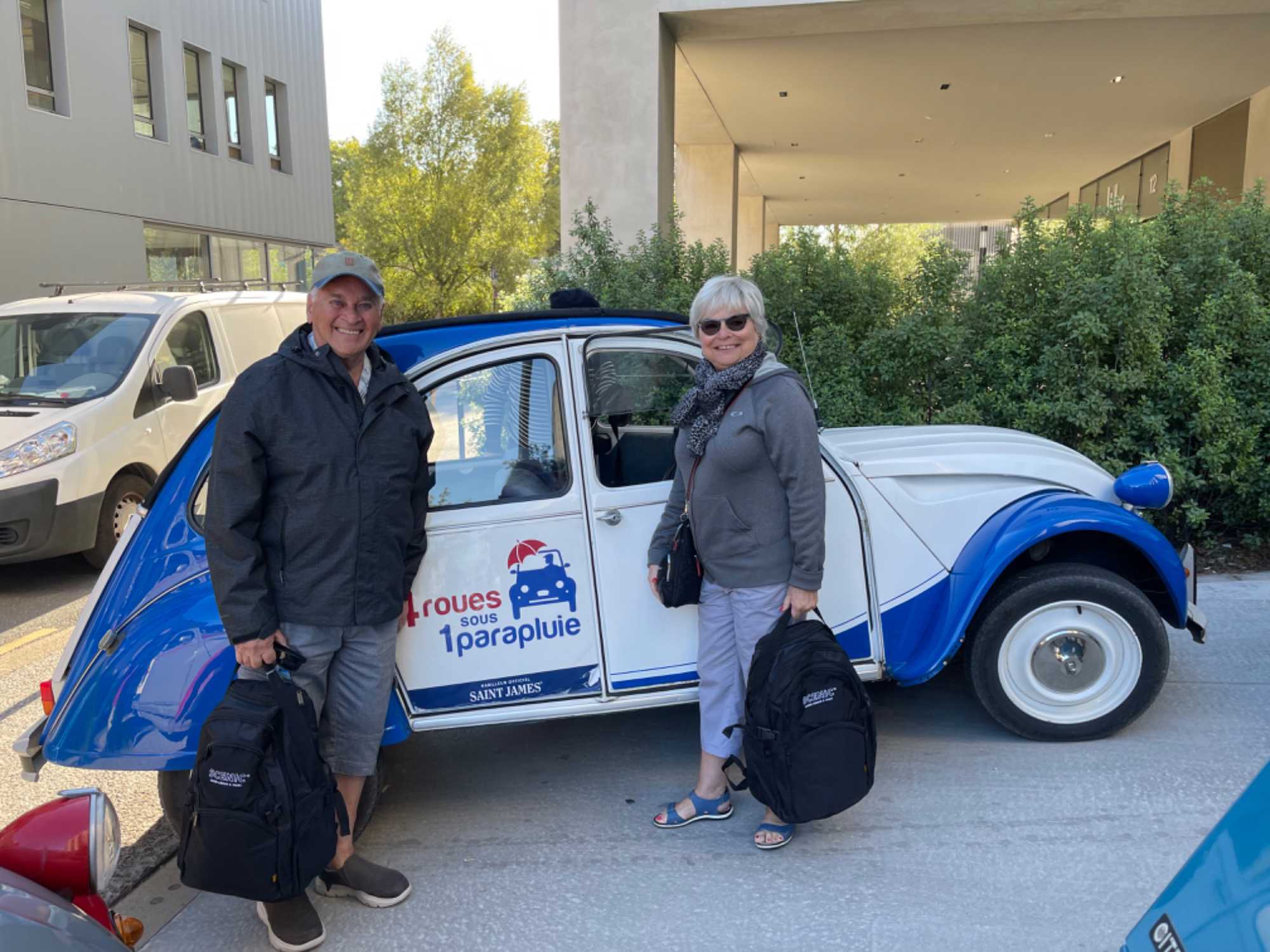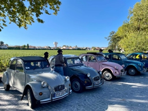 Et oui encore une le soleil est au rendez-vous pour notre plus grande joie. J’ai un super groupe qui sont d’excellents voyageurs. Je suis comblée de voyager en leur compagnie et de pouvoir m’amuser avec eux durant ce périple au pays des vins de Bordeaux. Ce matin, j’ai une petite surprise pour eux, et tous se demandent ce que sera cette surprise. Découvrir une ville c’est souvent la marcher et s’y perdre. Afin de ne pas juste marcher mais de pouvoir circuler dans les ruelles de la ville, mon ami Nicolas avait planifié pour mon groupe une découverte de Bordeaux inusité. Pour ce faire, comme c’était une surprise pour tout le groupe, mes voyageurs attendaient patiemment leur surprise devant notre hôtel. Et voilà que la première petite voiture 2CV arrive à notre hôtel. Et oui ces voitures mythiques de la compagnie Citroën qui ont vus le jour le 7 octobre 1948, lorsqu’elle a été présentée au Salon de l'automobile. Devenue voiture mythique de la marque Citroën, elle a permis de démocratiser l'automobile et fait encore rêver les Français et le monde entier. C’est l’un des véhicules les plus vendus de l’histoire avec plus de 5,1 millions de voiture 2 chevaux vendus dans le monde. C’était amusant de voir la réaction de mes voyageurs qui prenaient place dans ces voitures anciennes. J’ai profité pour faire de belles photos que j’appelais mes photos de mariage en prenant les photos de mes couples assis à l’arrière de leur voiture. Nous sommes donc partis à la découverte de la ville et de sa campagne environnante. Quelle belle balade amusante nous avons fait. Une autre surprise nous attendait une dégustation privée dans un vignoble réputé situé sur la frontière de la ville. Nous étions sur une appellation de Pessac-Léognan.