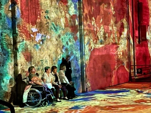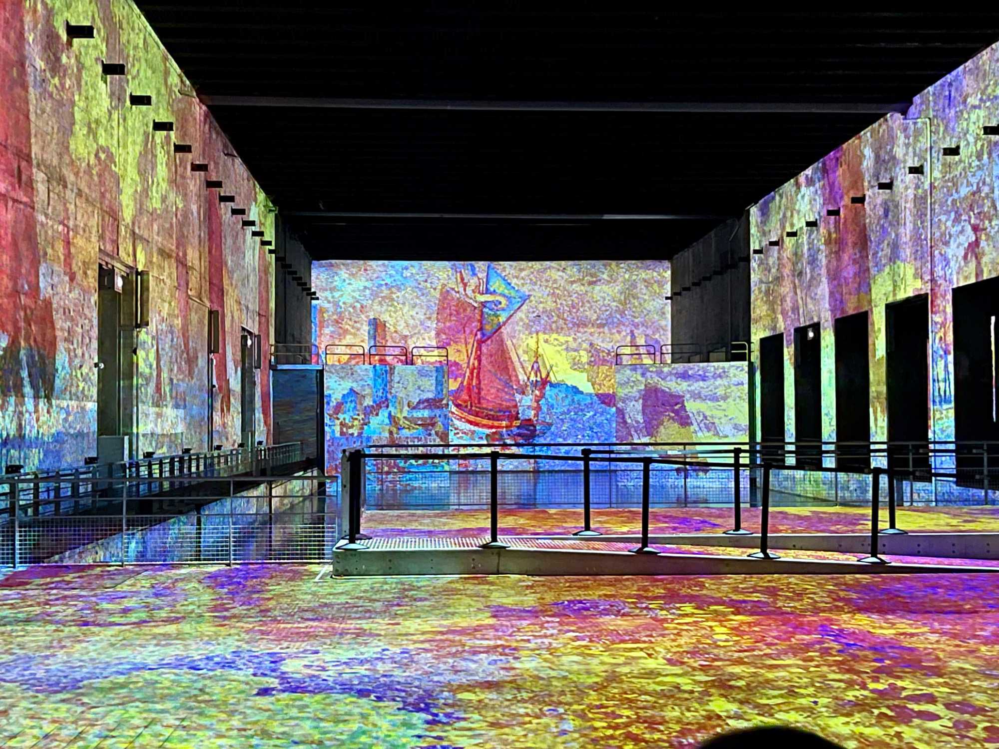 Les Quais Rive Gauche et Quai des Marques : Les quais de Bordeaux constituent l'un des plus magnifiques patrimoines urbains du monde, avec leurs façades 18e siècle dont de nombreux édifices sont classés ou inscrits au titre de monuments historiques. Toute l'agglomération bordelaise, se façonne un nouvel art de vivre autour de multiples escales. Sur les pelouses, dans les parcs et jardins, le long de la Garonne, les quais se veulent escales de détente, de magasinage et de promenade, à pied ou à vélo. Le Quai des Marques avec ses Hangars, c’est l’adresse idéale pour “magasiner” en famille… prendre l’air et boire un verre face à la Garonne. Les Bordelais ne s’y trompent pas : comment résister à la tentation des prix « usine » en bord de la Garonne? Toutes les marques y sont représentées à prix défiant toutes concurrences. « Dépenser moins, c’est tellement chic » est leur slogan! Autre avantage, le parking ou l’arrêt de tram à proximité. Et si vous n’étiez pas encore convaincu, la majesté du nouveau pont Jacques Chaban-Delmas vaut à lui seul le déplacement. Après notre promenade plusieurs ont décidé de rester en ville pour magasiner ou pour y flâner. De retour en fin d’après-midi car personne ne voulait manquer la dégustation des huîtres d’Arcachon que Scenic avait organisé pour nous. Nous avons été choyés et nous le serons à nouveau lors de notre séjour d’une nuit à Arcachon. Elles étaient délicieuses ces huîtres! Ce soir, notre souper était prévu très tôt car nous avons une soirée magnifique qui nous attend. Une soirée organisée par Scenic et privatisé au Bassins de lumières de Bordeaux. Les Bassins de lumières, le plus grand centre d'art numérique au monde, est situés dans les quatre premières alvéoles de la Base sous-marine de Bordeaux. Ils présentent des expositions numériques immersives monumentales dédiées aux grands artistes de l'Histoire de l'art et à la création contemporaine. C’est autour des quatre immenses bassins qui sera présenté en continu un cycle d'expositions numériques et immersives alternant une création longue, consacrée aux grands artistes de l'Histoire de l'art, et une création plus moderne, d'une durée plus courte.