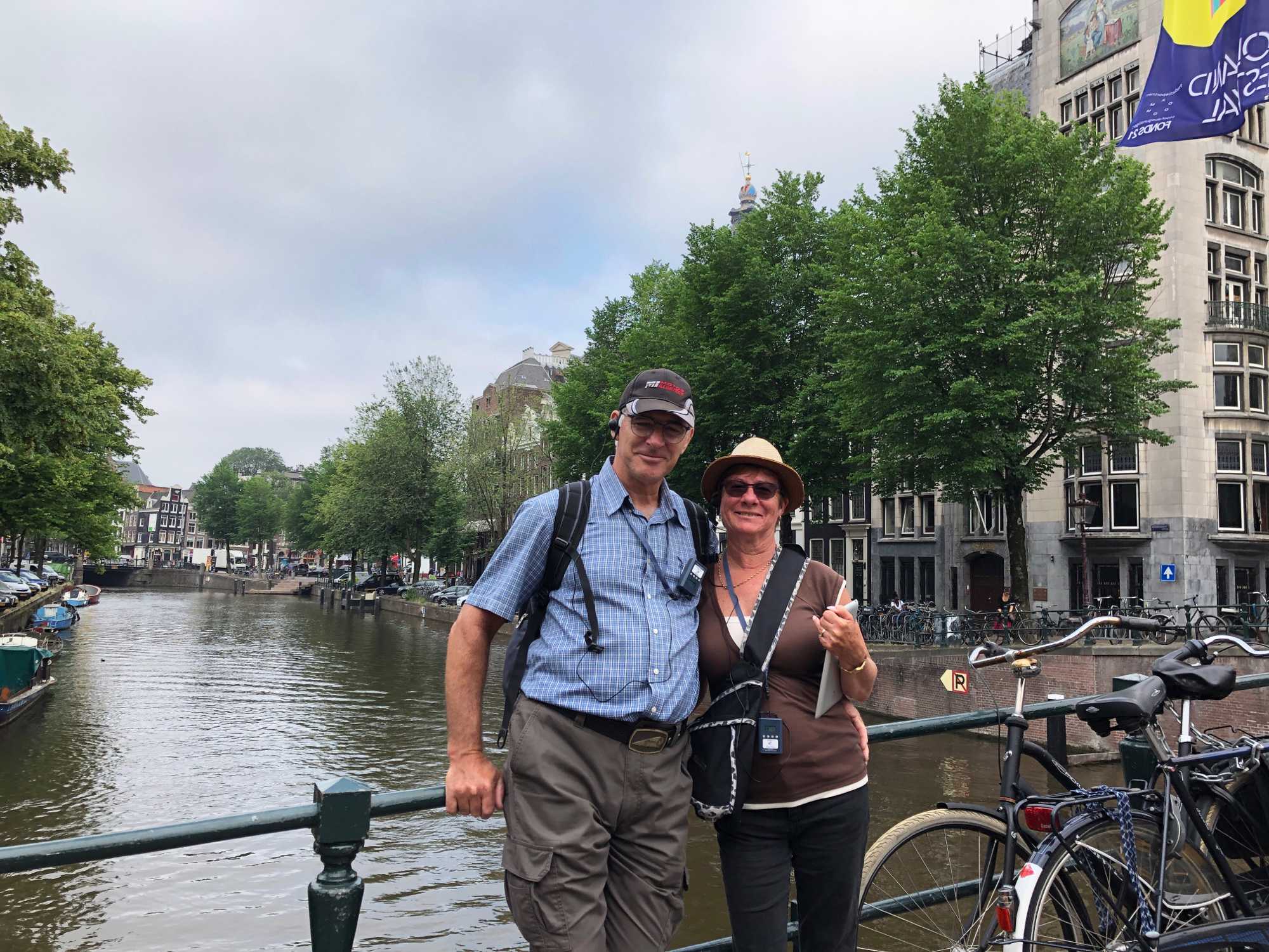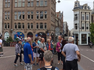 Nous prenons un copieux déjeuner à l’hôtel et rapidement nous sommes prêts pour la suite de notre visite de la belle ville d’Amsterdam. Ce matin, nous partons à pied avec deux guides, Erick et Jenny, pour visiter la vieille ville. Les découvertes s’enchaînent les unes après les autres. La balade nous permet de constater l’ampleur des nombreux canaux et des ponts ayant servis de moyen de transport dès la création de cette belle ville. Quatre grands canaux en demi-lune ferment le vieux centre à l’ouest et notre canal est le premier. Ils ont été creusés au XVIIe siècle. Maintenant, ce sont surtout les vélos qui sont utilisés pour se déplacer. Apparement, il y a un million de vélos pour environ 800 000 habitants. Nous devons porter une attention particulière lorsque vient le temps de traverser la voie réservée aux cyclistes parce qu’ils passent vraiment rapidement.
