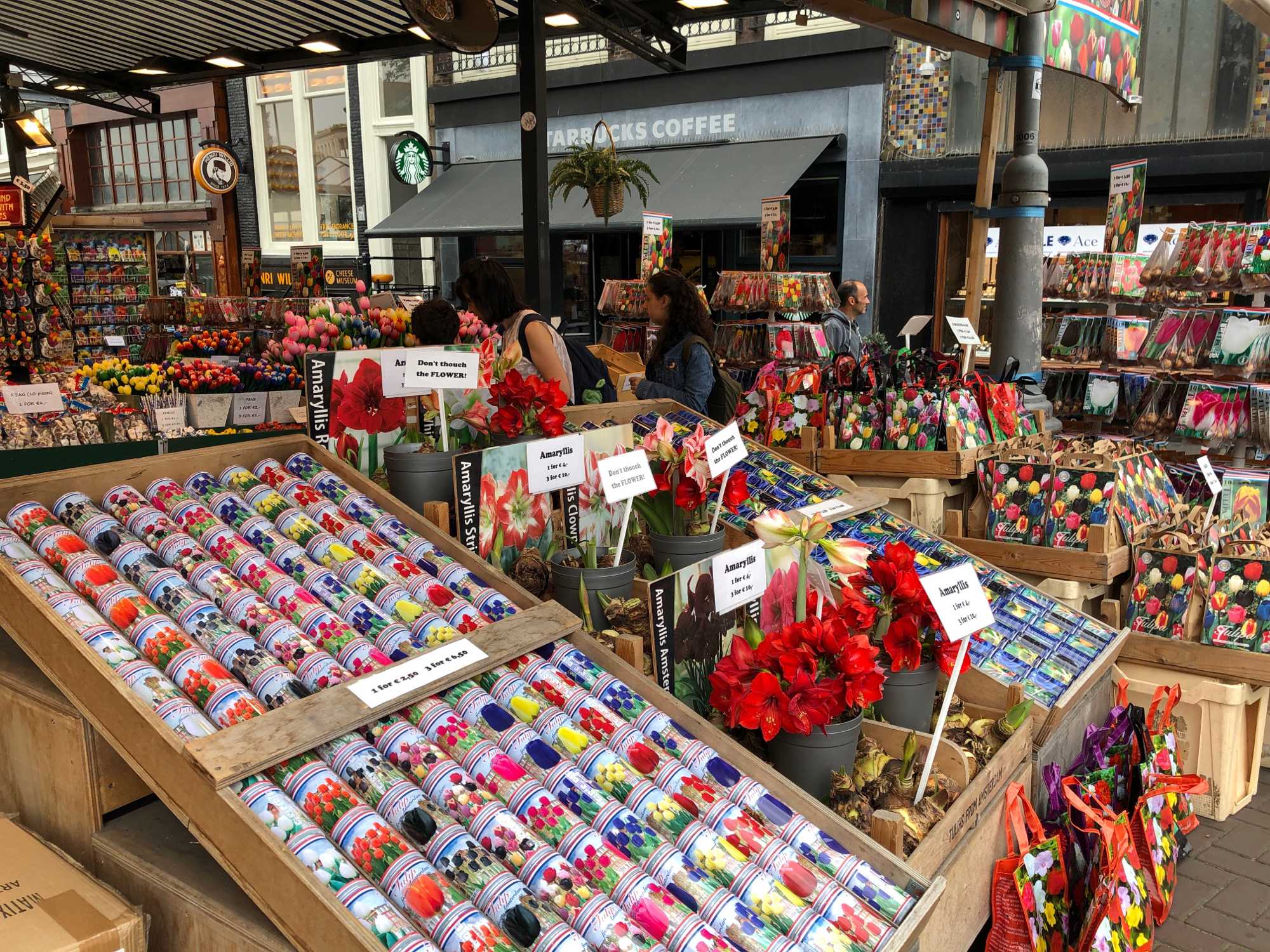 Nous allons au Marché aux fleurs qui nous fait rêver aux tulipes. Il symbolise la passion locale, la bulbiculture, pratiquée depuis le XVIe siècle. Ce célèbre Marché aux Fleurs borde l'un des plus anciens canaux de la ville d'Amsterdam, le Sigel. C'est un marché permanent qui a été créé au XIXe siècle. On y trouve plusieurs types de fleurs et de plantes à bulbes comme les tulipes, les crocus, les jacinthes ou encore les amaryllis qui règnent en vedettes incontestées. La tulipe, reine du marché, s'y trouve sous toutes les formes, toutes les couleurs, à planter ou en bouquet.