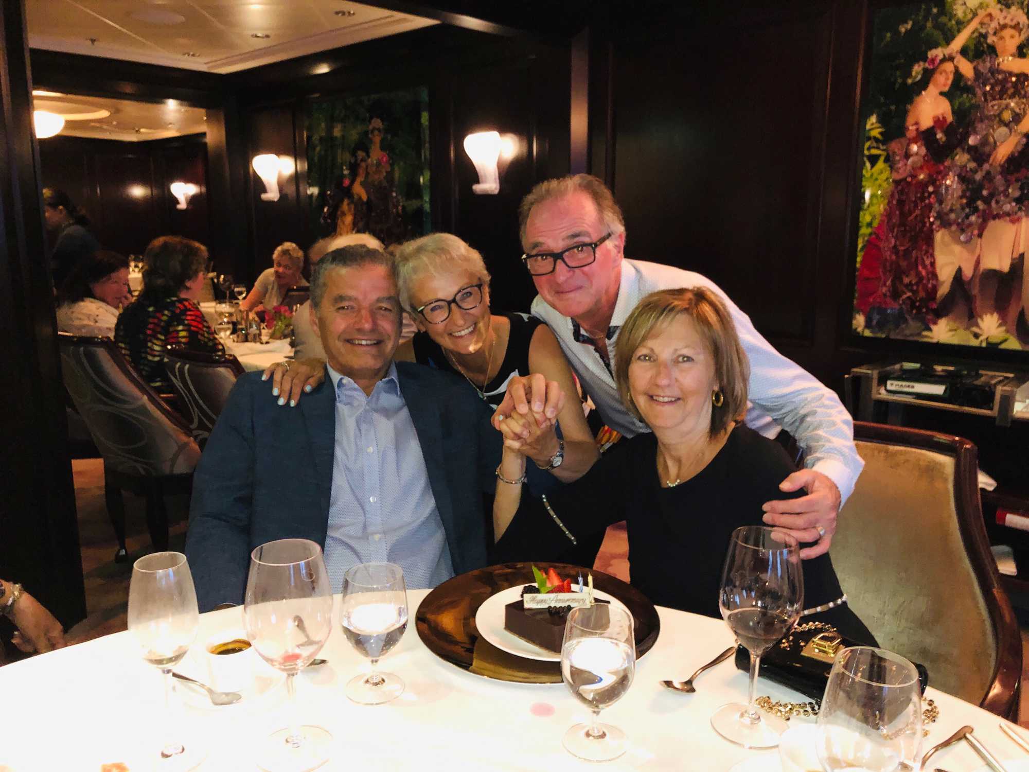Ce soir, nous allons au restaurant Murano pour déguster un repas exceptionnel offert en cadeau par Louise Drouin. Tous les voyageurs se sont régalés et désirent remercier Louise pour cette belle initiative. À la fin du repas, nous en profitons pour célébrer l’anniversaire de naissance de Suzanne et les anniversaires de mariage de Micheline et Daniel, de Lucie et Alain, et de Suzanne et Pierre; il y avait beaucoup de gâteaux de fête! Nous avons passé une excellente soirée en très agréable compagnie. Tous et toutes profitons pleinement de chaque instant de ce magnifique voyage. Tout le monde s’entend très bien et passe du bon temps ensemble. Ce soir rien ne presse pour aller se coucher puisque demain nous serons en mer toute la journée.