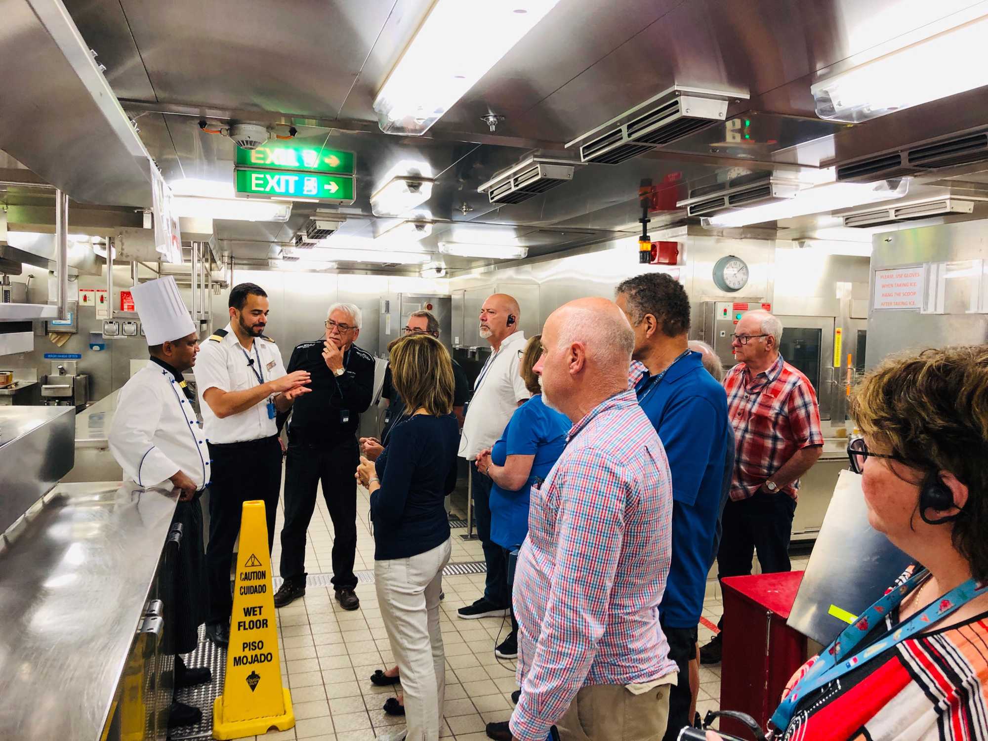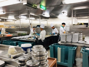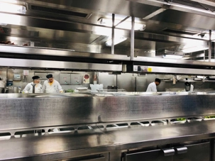 Ce matin, à 11H00, nous avons rendez-vous avec le sous-chef du nom de Joe, pour la visite des cuisines. Nous sommes plusieurs à profiter de cette belle visite. Nous allons dans la cuisine utilisée pour la salle à manger Opus. La propreté des lieux nous impressionne dès notre entrée dans la pièce. Avec tous ces comptoirs en acier inoxydable, on dirait une salle d’opération, allez voir les photos associées à ce récit! Joe nous montre le secteur de la préparation des repas chauds, des pâtisseries, de la boulangerie, des salades, etc. Tout est bien compartimenté et même la tablette réservée aux serveurs permet d’avoir des secteurs séparés pour chaque type d’aliments afin d’éviter la contamination croisée d’un plat à un autre. Pouvez-vous imaginer que 45 personnes y travaillent à l'heure du souper et que 45 serveurs y entrent et en ressortent sans interruption? Le tout demande beaucoup de coordination et de discipline de leur part en plus d'avoir les compétences et la bonne approche-client.