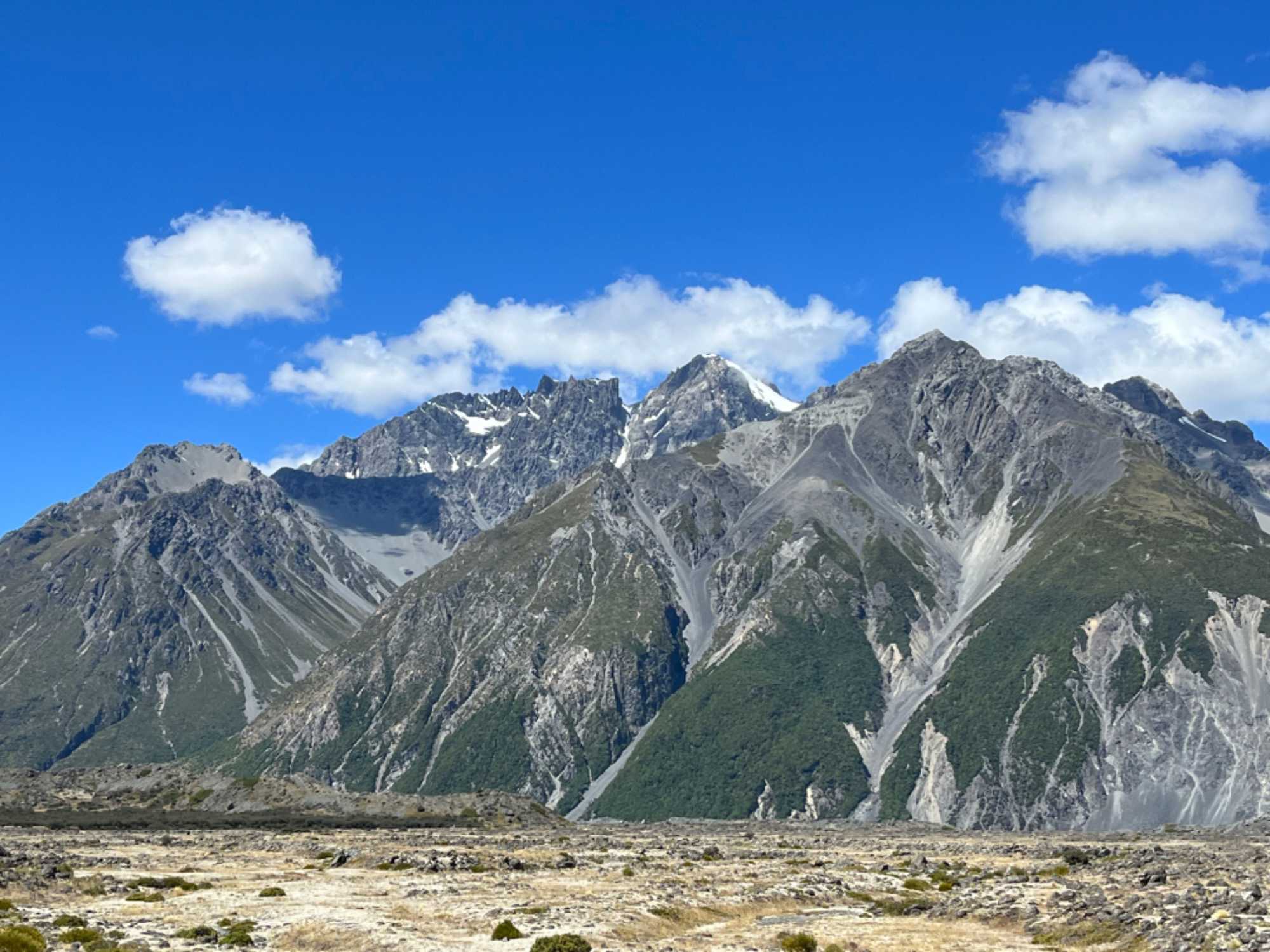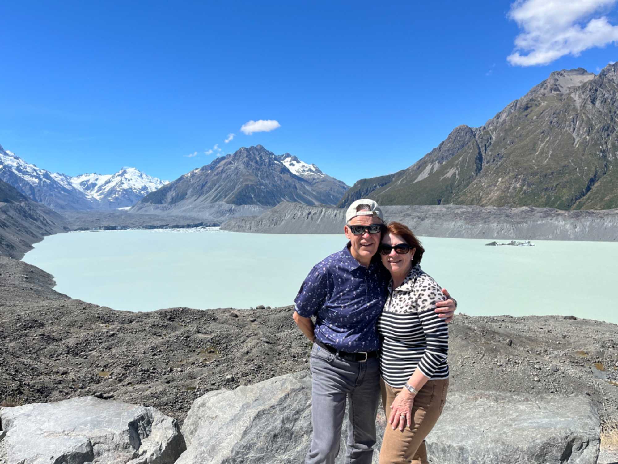 Long de 27 km, le glacier Tasman serpente les Alpes du Sud et le Parc national d’Aoraki-Mt Cook et prend fin dans le lac Tasman. Ce glacier est le plus grand de la Nouvelle-Zélande. Sa face sud s’effondre par pans de glace qui restent en flottaison dans un lac de couleur gris sombre. Ces icebergs donnent sur le lac des allures d’expédition polaire. Très peu de glaciers prennent fin dans des lacs et sont encore moins accessibles par les voyageurs. Nous avons tout le loisir de marcher et de venir jusqu’au lac pour l’admirer. Tout est très calme et nous pouvons admirer les icebergs qui se détachent régulièrement de ce glacier. C’était magique de voir le sommet du mont Cook au soleil pour notre grand bonheur. Nous avons pris plusieurs photos que nous vous partageons avec joie.