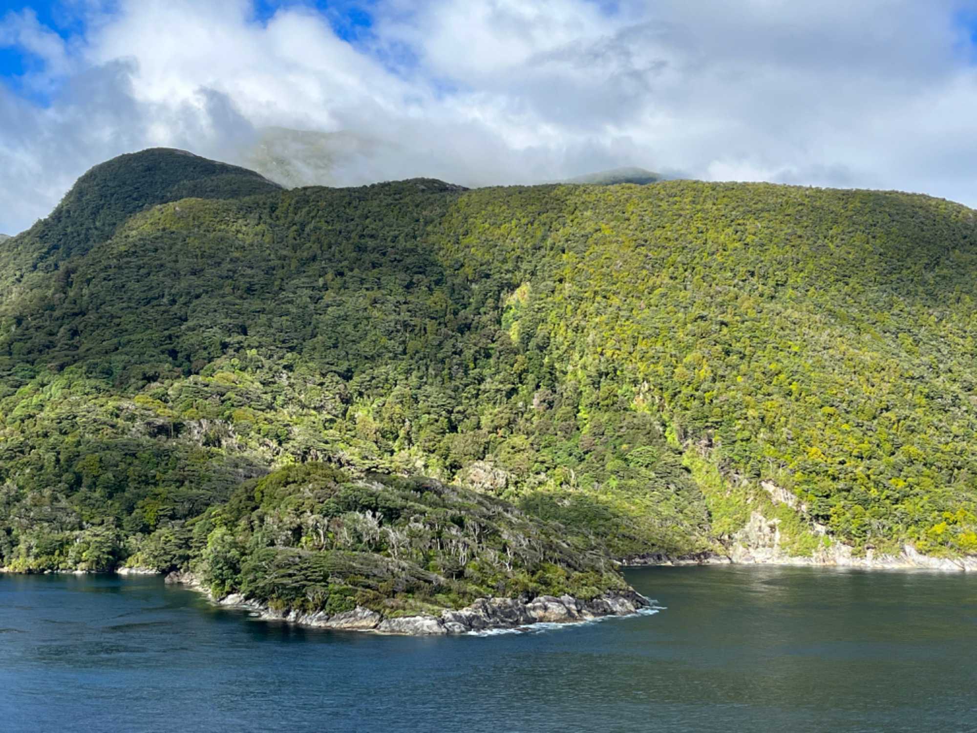 Le Dusky Sound est situé dans la pointe sud de l’île du Sud et il est le plus long fjord de Nouvelle-Zélande. Il est aussi considéré par plusieurs comme le plus beau en raison de ses nombreuses îles boisées et bras de mer. Il a été nommé ainsi par le capitaine Cook, alors qu’il voguait sur ses eaux à la tombée de la nuit lors de son premier voyage en 1770. On y retrouve également quelques chutesmajestueuses. Notre navire a donc fait son entrée sous un ciel partiellement nuageux. Les montagnesles plus élevées de l'endroit sont abruptes et le très haut taux de précipitations dans la région amène des centaines de chutes qui se dirigent vers le fjord, la saison des pluies venue. Nous étions à la recherche de la faune sauvage aquatique, comme les dauphins et les phoques. Tout d’un coup, des jolis dauphins sont venus à notre rencontre. Ils ont escorté le navire en s’amusant pour notre grand bonheur. Les paysages étaient vraiment spectaculaires.