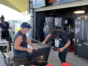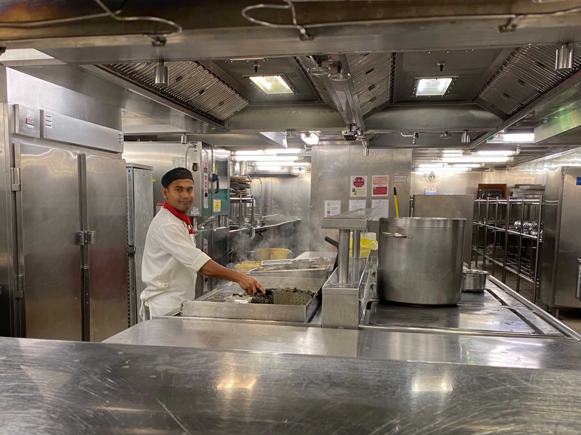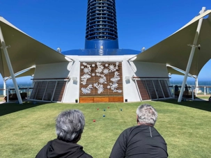 Quelques voyageurs font une partie de boccia sur le pont 15, à l’extérieur du navire, sur la pelouse naturelle. Les grands gagnants après plusieurs rondes très serrées sont Alain, Esther et Daniel. Bravo pour vos talents de lanceurs et votre précision. Pendant ce temps, des spécialistes verriers fabriquent des vases colorées à l’atelier de verre soufflé juste à côté de l’aire du boccia.