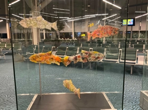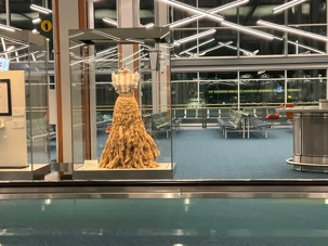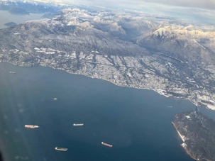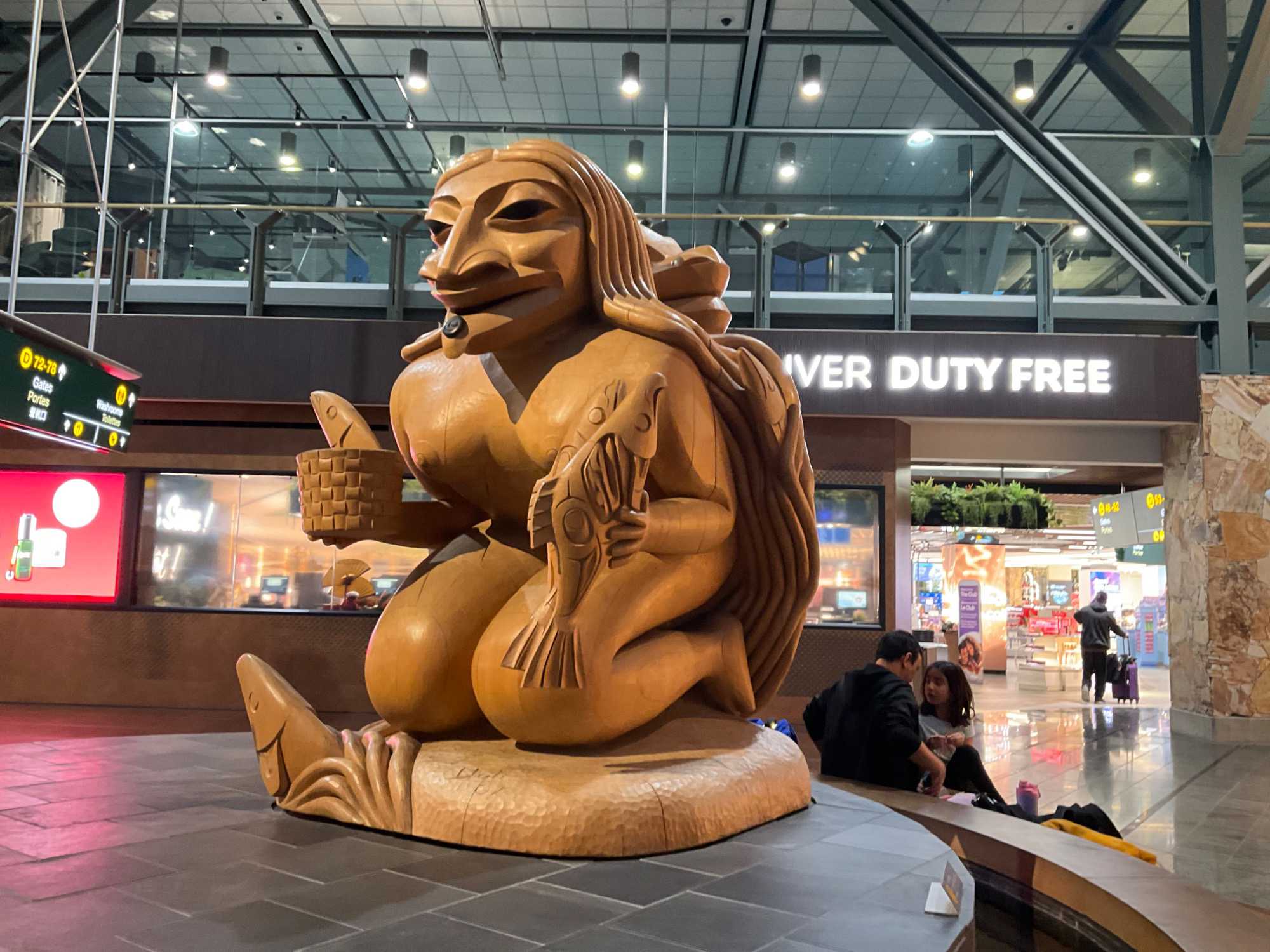 En vol, on rêve déjà à la Nouvelle-Zélande et aux sagas du « Seigneur des anneaux » et de « Bilbot le Hobbit », aux choses exceptionnelles et extrémistes qu’on y rencontrera et à son statut de contrée lointaine. Cette région à elle seule nous permettra de faire un tour du monde dans un même pays en raison de ses montagnes enneigées, de sa végétation luxuriante, de ses vallées verdoyantes et époustouflantes, de ses fjords grandioses et de ses grandes villes modernes. Mais il y a eu aussi notre passage à travers les grands espaces et les plaines des grandes prairies du Mainoba et de la Saskatchewan, ensevelies sous la neige et pour celles et ceux qui avaient le privilège d'être du côté hublot. Il y a eu ces merveilleuses montagnes rocheuses, celles dont on ne peut détourner notre regard tellement ses pics immenses nous émerveillaient. Vu du ciel, c'est un spectacle en trois dimensione d'une grande intensité et avec la luminosité dont nous bénéficions en période hivernale, le spectacle fait place à la magie. Voyez les photos et dites-moi que cette nature ne vous émerveille pas? Notre escale à l'aéroport de Vancouver nous a amplement donné le temps de visiter entre autres l'aéroport "artistique " de Vancouver. Des œuvres d'art envahissent les lieux. Et l'art des premières nations de la région est particulièrement remarquable grâce à ses sculptures.