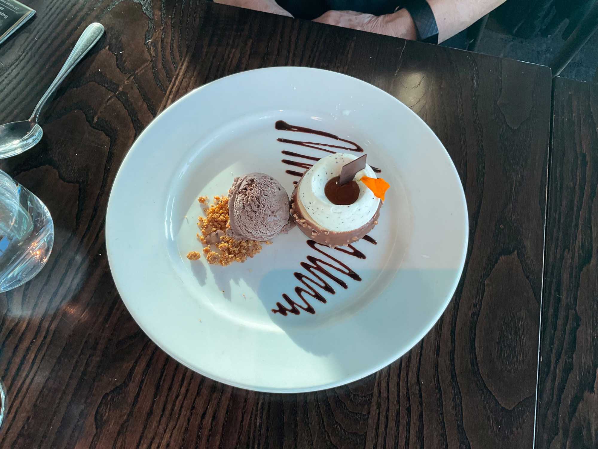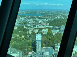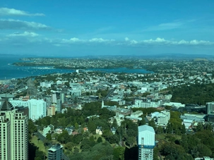 Avant même d'amorcer notre repas, on est époustouflé de la vue panoramique des lieux, la ville sous nos pieds avec ses gratte-ciels, ses espaces verts, ses plans d'eau qui dessinent la beauté de la ville. Vite vite avant même de goûter les premiers plats, on met en mémoire numérique l'élégance de la ville. Le choix des menus individuels préalablement établis par chacun de nous, nous a ravis. Que ce soit l'octopus, le Kapiti brie, les perles du pacifique (huîtres locales) on déguste ces mets des dieux maoris avec lenteur tout en tournant confortablement assis á notre table. Puis, on débute par ce qui sera par la suite une longue découverte des vins néo-zélandais, tout au cours de ce voyage au pays des hobbits. Bien sûr que certains voyageurs n'allaient pas oublier d'opter pour l'agneau de la région dont la réputation n'est plus à faire, d'autres voulaient goûter les saveurs gastronomiques "italiennes" de ce peuple avec des gnocchis, bons et copieux. Poulet et saumon Akaroa complétaient les mets principaux. On a chanté notre "Mon cher Roland c'est à ton tour..." pour lui rappeler son anniversaire dans les airs, avec un Keke Tiakarete (rien á voir avec le sport au nom similaire), un fondant au chocolat garni de pointe de mousse et de fleurs comestibles.Il faut dire qu'on a aussi "reluqué" l'Exotic Slice, qui semblait succulent avec ses teintes de citron et d'orangé. Pour ceux qui aiment le café le "Coffee Hazelnut Stone les a ravis avec ses mousses onctueuses. Un festin des dieux, en bonne compagnie, décidément, on débute en grand ce voyage au coeur de la terre!