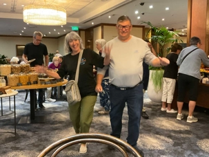 Le petit déjeuner est copieux et se compose de tous les mets américains que nous connaissons déjà mais en prime, des nouilles asiatiques, du tofu épicé, des omelettes sans pareil au dire de nos voyageurs, une gamme complète de viennoiseries et...une montagne de kiwis bien mûrs et succulents, il n'est pas dit que nous sommes venus au pays des kiwis sans en avoir goûté de leur pays d'origine.