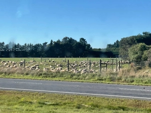 Évidemment, on ne fait que passer sans s’arrêter mais cette belle balade nous permet de prendre le pouls de la campagne néo-zélandaise avec ses moutons qui gambadent, éparpillés sur la plaine mais aussi dans les montagnes. Elles doivent avoir de bons mollets. Pour les vaches, il paraît qu'elles sont nourries de betteraves???Je ne sais pas si les vaches donnent du lait couleur violet? On a d'ailleurs vu, l'une des espèces de vaches qui dit-on, on ne voie qu'ici, c'est "la vache à ruban", blanche avec une bande rousse d'environ 40 centimètres au centre de son ventre et sur son dos.