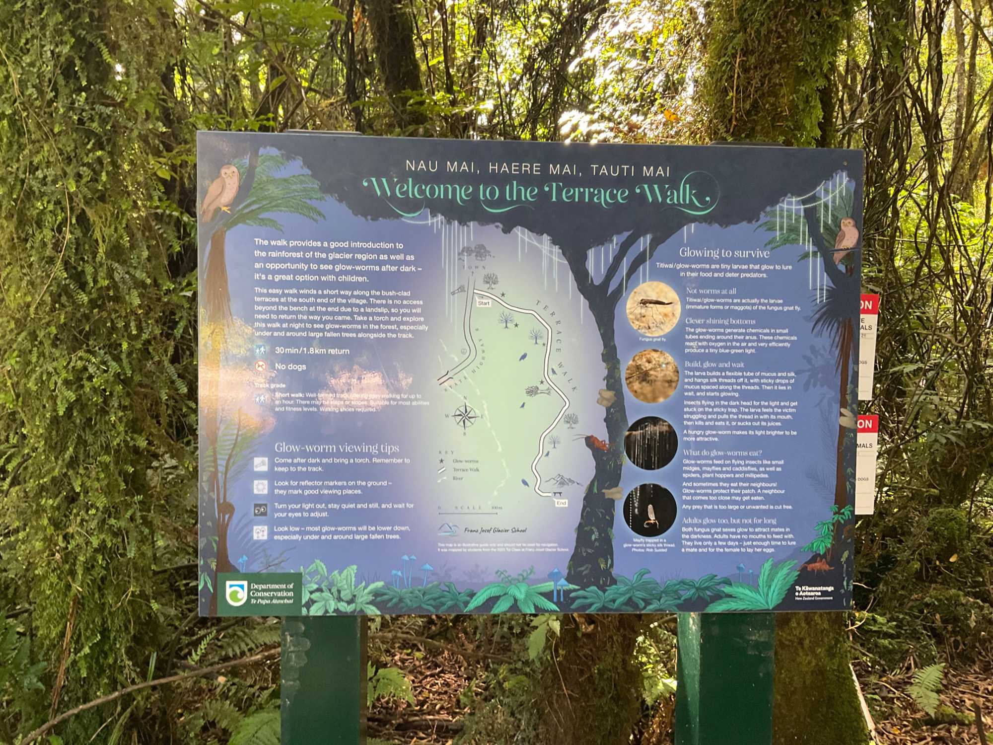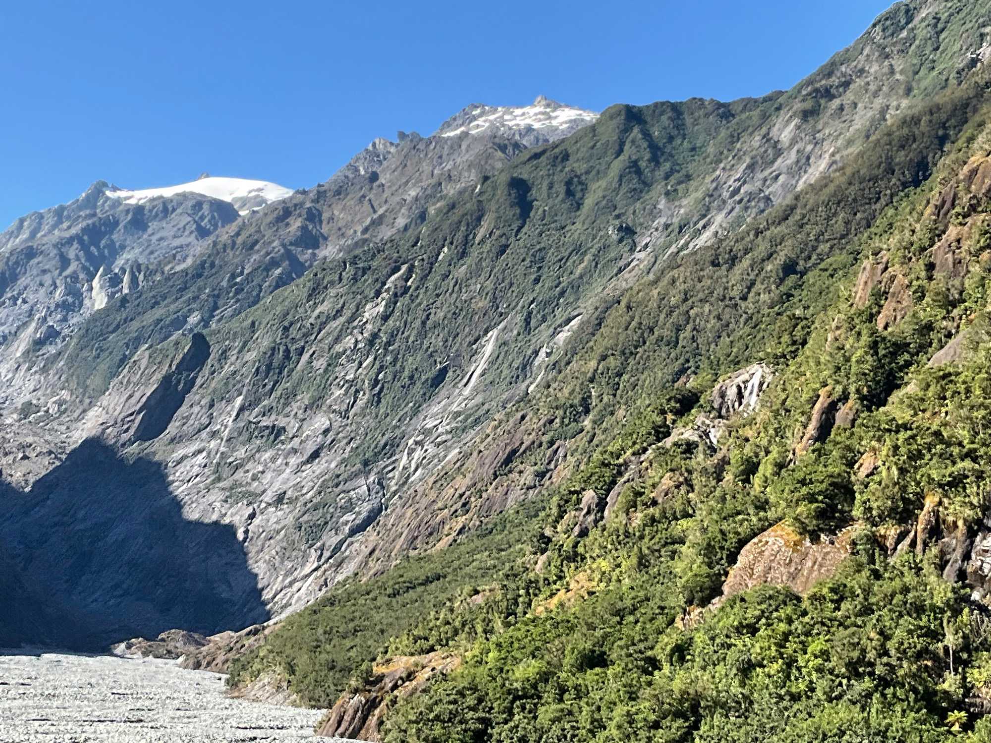 Pour mieux voir le glacier, on prend un sentier pédestre d'une petite demi-heure à travers la forêt puis nous arrivons à l'endroit où le lit de la rivière est à sec mais où le glacier trône fièrement. Claudie nous explique comment le glacier a reculé avec les années, elle y vient depuis une trentaine d'années. Puis, un second sentier nous donne un autre point de vue du glacier et des panneaux d'interprétation nous racontent une légende maorie. Nommé en 1885, par l’explorateur allemand, Julius von Haast, son nom fait référence à l’empereur d’Autriche, François-Joseph Ier. Son nom en māori est ‘Ka Roimata o Hinehukatere’ (« les larmes de Hinehukatere »), provient de la légende locale, qui dit qu’Hinehukatere, une dame, aimait grimper dans la montagne et persuada son amour, Wawe, de grimper avec elle. Wawe, grimpeur moins expérimenté qu’Hinehukatere, aimait l’accompagner jusqu’à ce …qu’une avalanche fauche ce dernier du sommet en entraînant sa mort. Et c’est ici qu’on sort les mouchoirs : Hinehukatere, la fiancée, eut le cœur brisé et ses très nombreuses larmes s’écoulèrent de la montagne et gelèrent donnant naissance au glacier. Pas très scientifique mais, quelle belle légende maorie! On en a profité pour s’imprégner de sa prestance car les scientifiques prévoient que le glacier va se rétracter de 5 km et perdre 38 % de sa masse d’ici 2100 dans un scénario de réchauffement moyen, imaginez un réchauffement accéléré si on suit la tendance actuelle.
