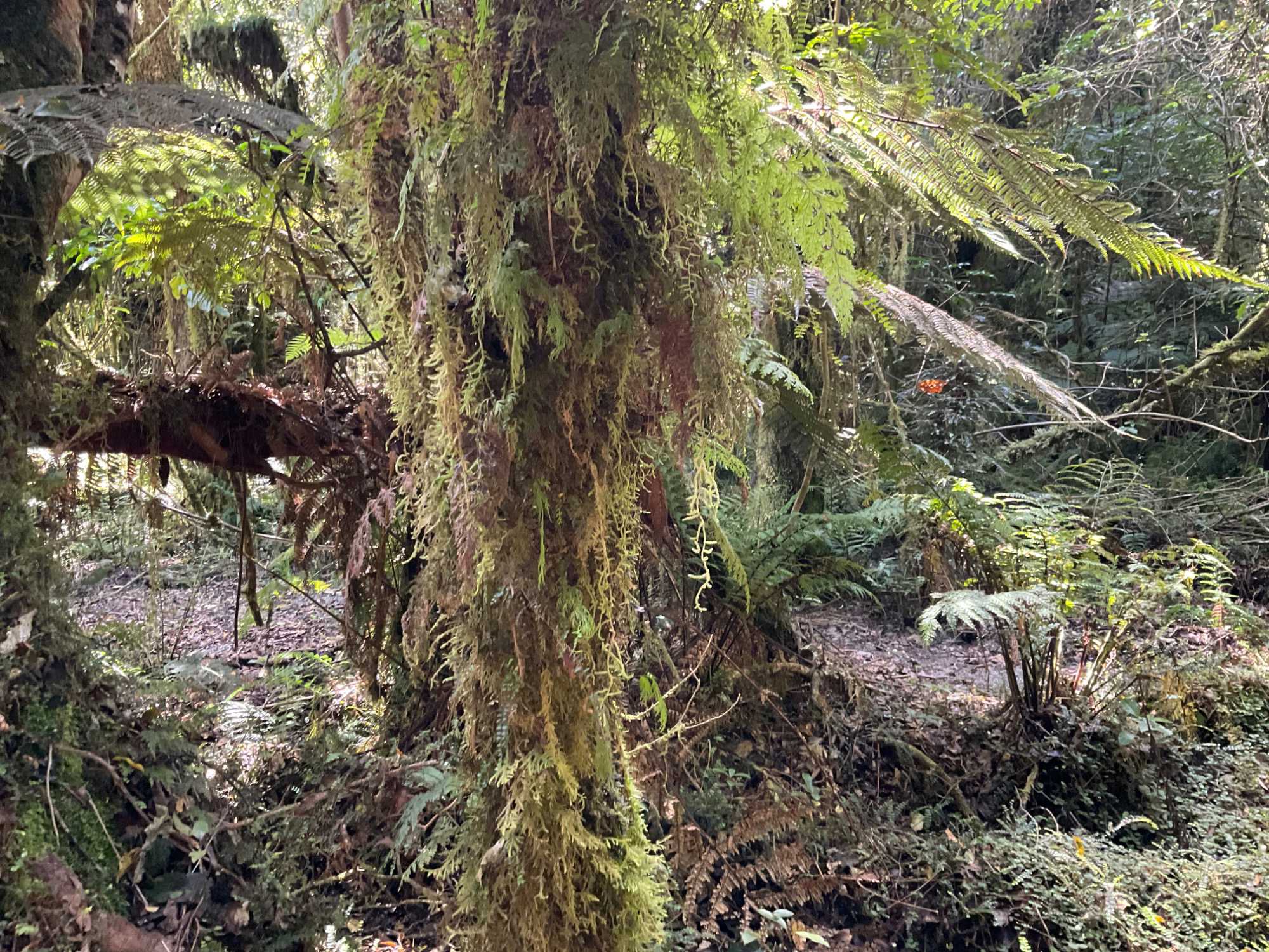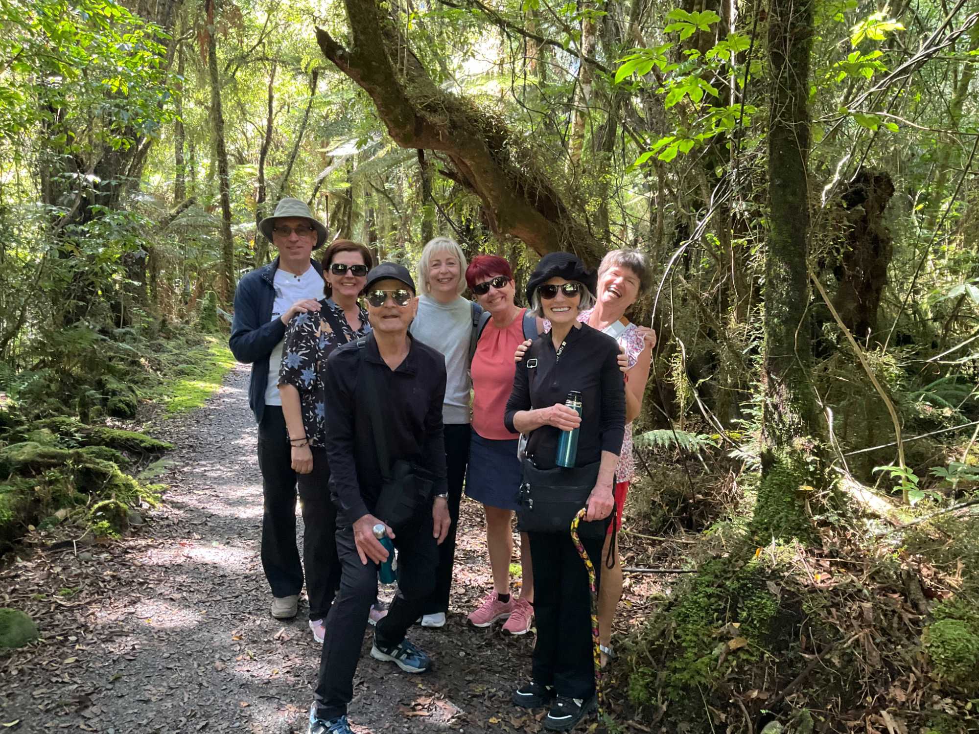 Un groupe de sept voyageurs enfilent un petit lunch et décident de découvrir un petit sentier que l'on avait remarqué au bout du village. En prenant la direction du sentier, on s'arrête voir une petite église, Tout est modeste ici, l'église aussi. On entreprend donc ce sentier appelé Terrace Walk qui s'avère être un magnifique petit bijou. De pas en pas, des surprises naturelles nous attendent. Cette section de forêt tropicale présente des arbres gigantesques ici, des lianes par là. On sent bien l'humidité des lieux qui fait la richesse de la variété forestière. On se croirait dans un film de forêt exotique. À chaque pas, de nouvelles surprises. Notre coup de cœur va une fois de plus pour les fougères géantes, symbole de la Nouvelle-Zélande. Le chant des oiseaux est différents de nos espèces ailées. Il y a bien Josée qui essaie de les attirer en sifflotant mais je lui rappelle qu'elle émet des sons de chants d'oiseaux "québécois " que les oiseaux d'ici ne reconnaissent pas. On a bien rigolé. Ici, les oiseaux sont tellement discrets qu'il est difficile de les voir mais Jean arrive à en photographier un. Au retour, derrière une seconde église, anglicane celle-là, on y prend des photos du glacier et du pont à voie unique qui fut emporté il y a deux ans, juste quelques heures aprè que Claudie soit passée avec un groupe. Les eaux de la rivière viennent directement du glacier ce qui en fait une eau claire et "farineuse" car elle est composée des débris minuscules du glacier qui avec l'absorption des rayons du soleil lui donne une teinte bleu acier, pas besoin de vous dire qu'elle est...glaciale! Aucun baigneur à l'horizon.