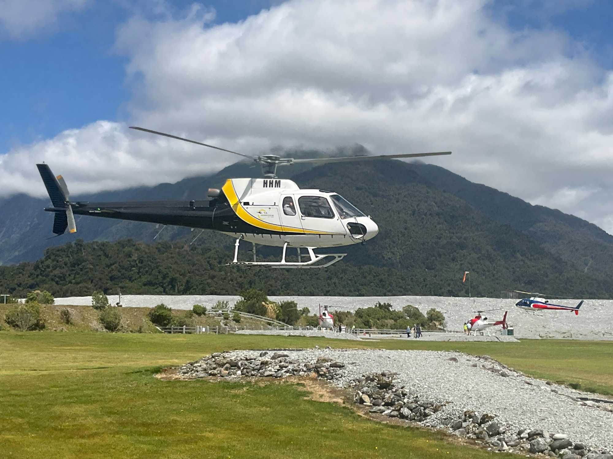 En début d'après-midi, sept de de nos voyageurs optent pour un tour en hélicoptère question de voir les lacs alpins, la forêt tropicale, les cascades de glace, les crevasses et bien sûr, le glacier de plus près et même de se déposer sur le champ de glace entre la première et la seconde chute de glace. Un tour d'une trentaine de minutes. Là, ils ont vraiment les deux pieds dans la neige mais sous un soleil radieux et chaud. Julie y fait même un ange pour goûter la sensation du froid et se pincer d'être vraiment les deux pieds sur le glacier. Tous reviennent enchantés de leur expérience. Pour le premier petit groupe, le pilote est une toute jeune dame, possiblement d'à peine trente ans qui semble aussi à l'aise dans les airs que si elle était sur terre. Tous ont trouvé l'expérience remarquable. Quel beau cadeau pour la Saint-Valentin.