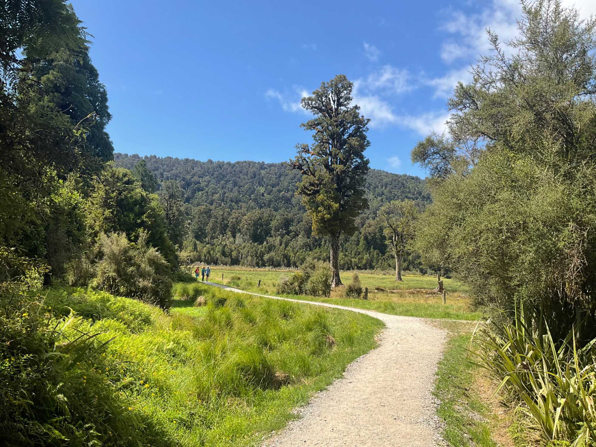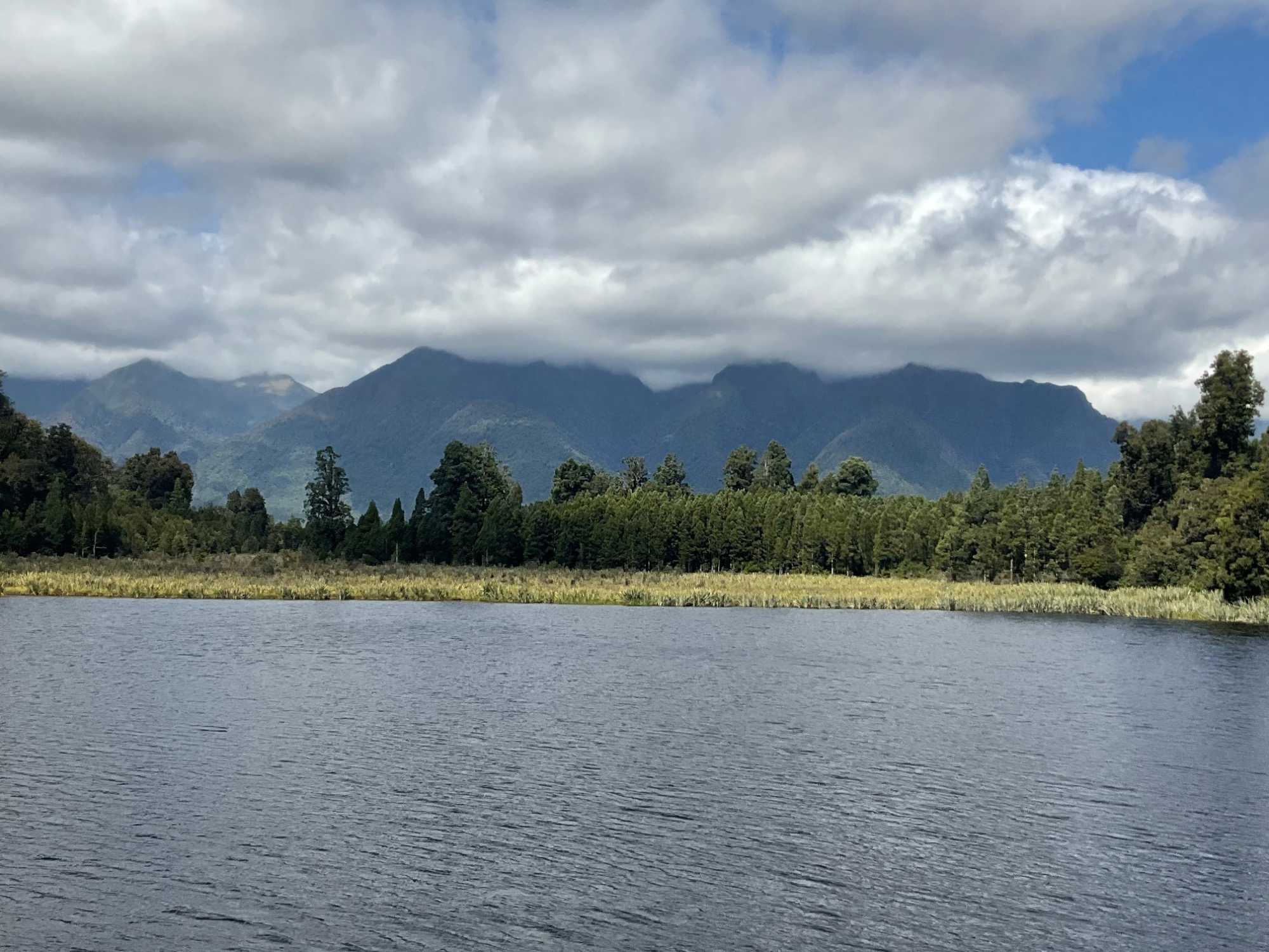 Lors du retour des voyageurs en hélicoptère, on prend la direction du lac Matheson qui se trouve à une trentaine de minutes en autocar. Quelle chance on a que la température soit de notre côté car la plupart du temps, il pleut dans cette région et les montagnes sont souvent recouvertes de nuages. Aujourd'hui, il y a bien eu un ou deux nuages juste au-dessus de nous mais rien pour nous laisser voir la magnificience de ce second glacier, appelé Fox ici. Nous entreprenons donc ce petit sentier qui longe le lac Matheson. L'ambiance est relaxante et il fait chaud. Auparavant le glacier Fox atteignait le niveau de la mer et le lac s'est formé lors du réchauffement climatique. Ce lac figure sur les timbres néo-zélandais, sur des boîtes de chocolat et sur...des bouteilles de bière.Les cimes enneigées des mont Cook et Tasman se détachent bien du paysage. Par temps clair on donne le surnom de ce lac, lac miroir.Un pont suspendu nous a permis d'atteindre un premier point d'observation. Quelques coquins du groupe faisaient bousculer le pont peut-être pour donner quelques sensations à Linda mais elle l'a traversé sans broncher, yé! Belle balade pour compléter cette journée de randonnée.