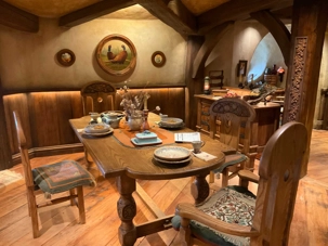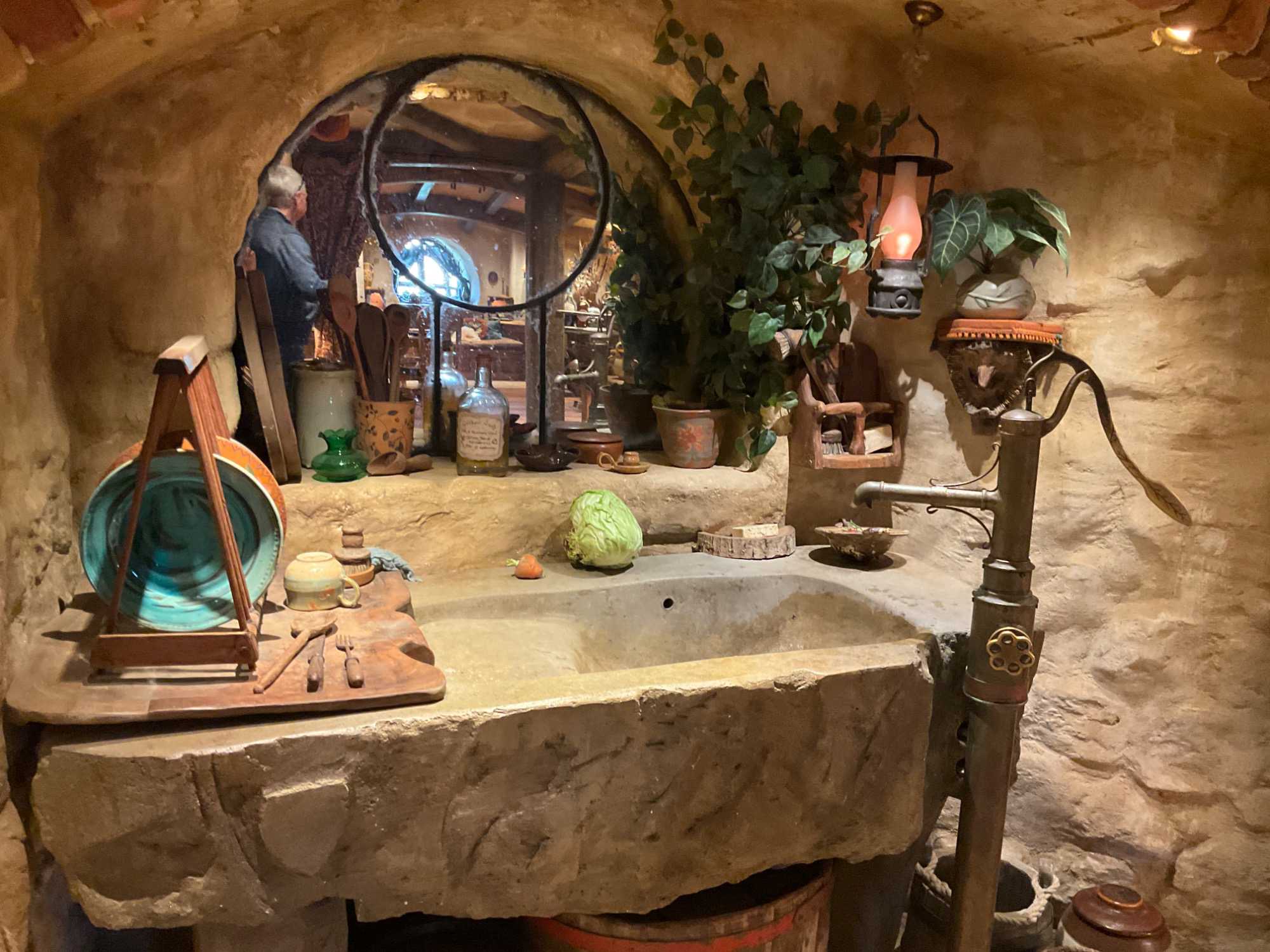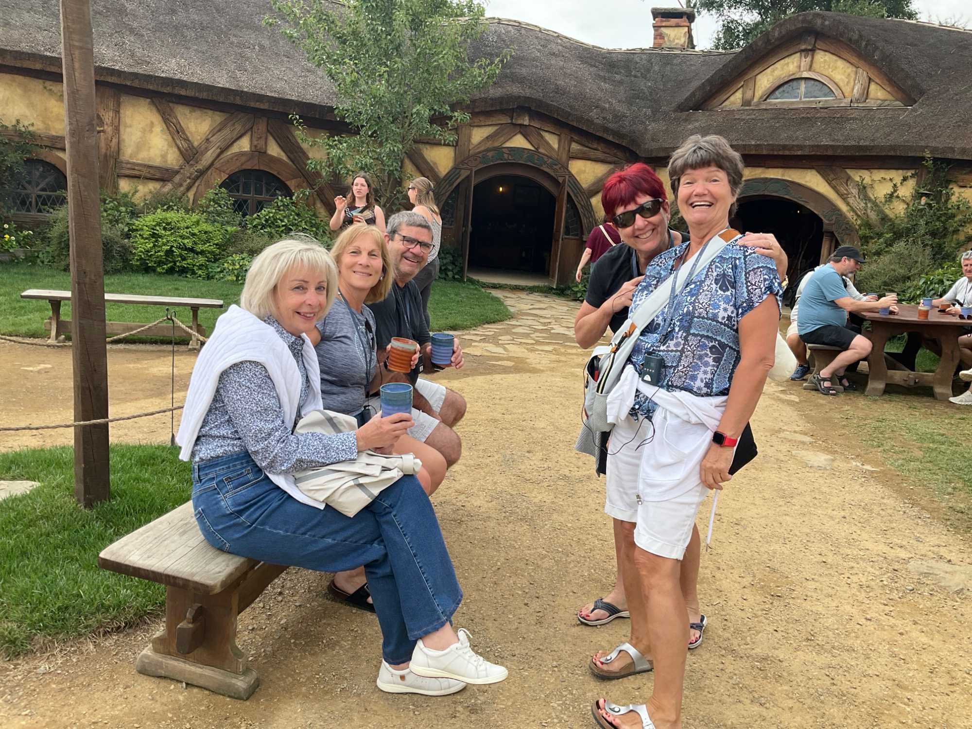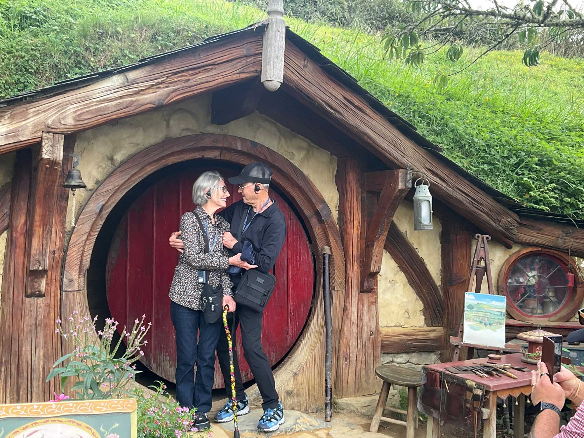 Keith nous mentionne que le décor original n'a pas été construit pour durer et a été partiellement démoli après le tournage. En 2010, le décor a été reconstruit de manière plus permanente pour Le Hobbit : Un voyage inattendu, dont le tournage a commencé en 2012. Les points forts de la visite comprenaient Bagshot Row, l'arbre de fête et la maison de Bilbo à Cul-de-Sac. Il y a maintenant 44 trous de hobbits visibles bien qu'il ne soit possible d'entrer que dans quelques-uns d'entre eux, dont certains ont de petits intérieurs inachevés aux murs de terre et certains sont des intérieurs de trous de hobbits entièrement meublés. Vous vous souvenez que les hobbits sont plus petits que les humains, certains trous plus petits ont été construits à la bonne taille des hobbits. À cela s'ajoute les effets ou trucages du cinéma qui donnent des perspectives un peu irréelles comme la photo où notre Jany a l'air d'une hobbit derrière son mari Peter qui lui semble un géant. À quelques exceptions près, la couleur de la porte d'entrée nous indiquait l'échelle ; par exemple, les trous de hobbit avec une porte bleue sont construits à l'échelle correcte pour les humains. Une réplique du Green Dragon qui figurait dans les trilogies Le Seigneur des Anneaux et Le Hobbit a été ouverte sur le plateau.