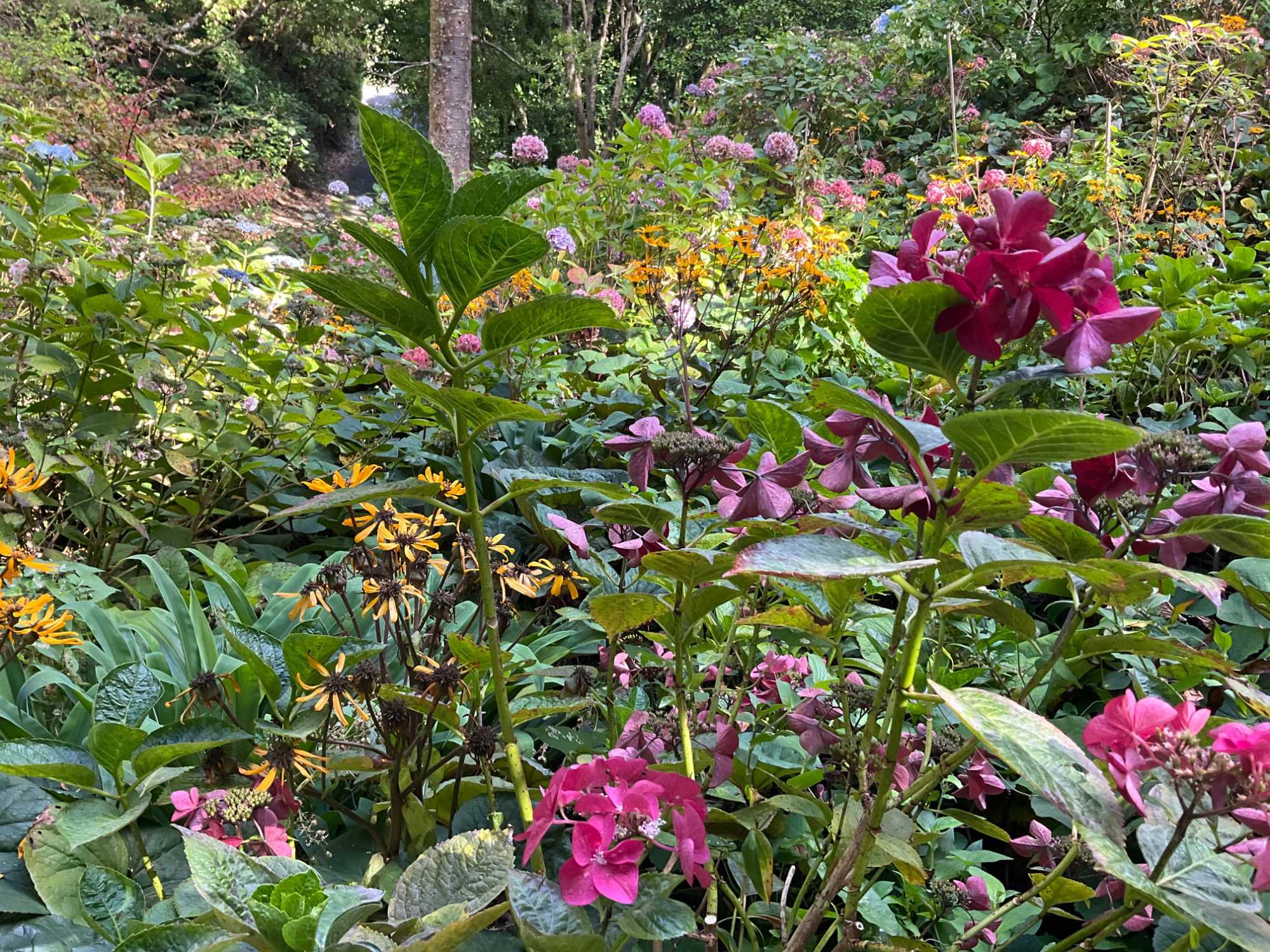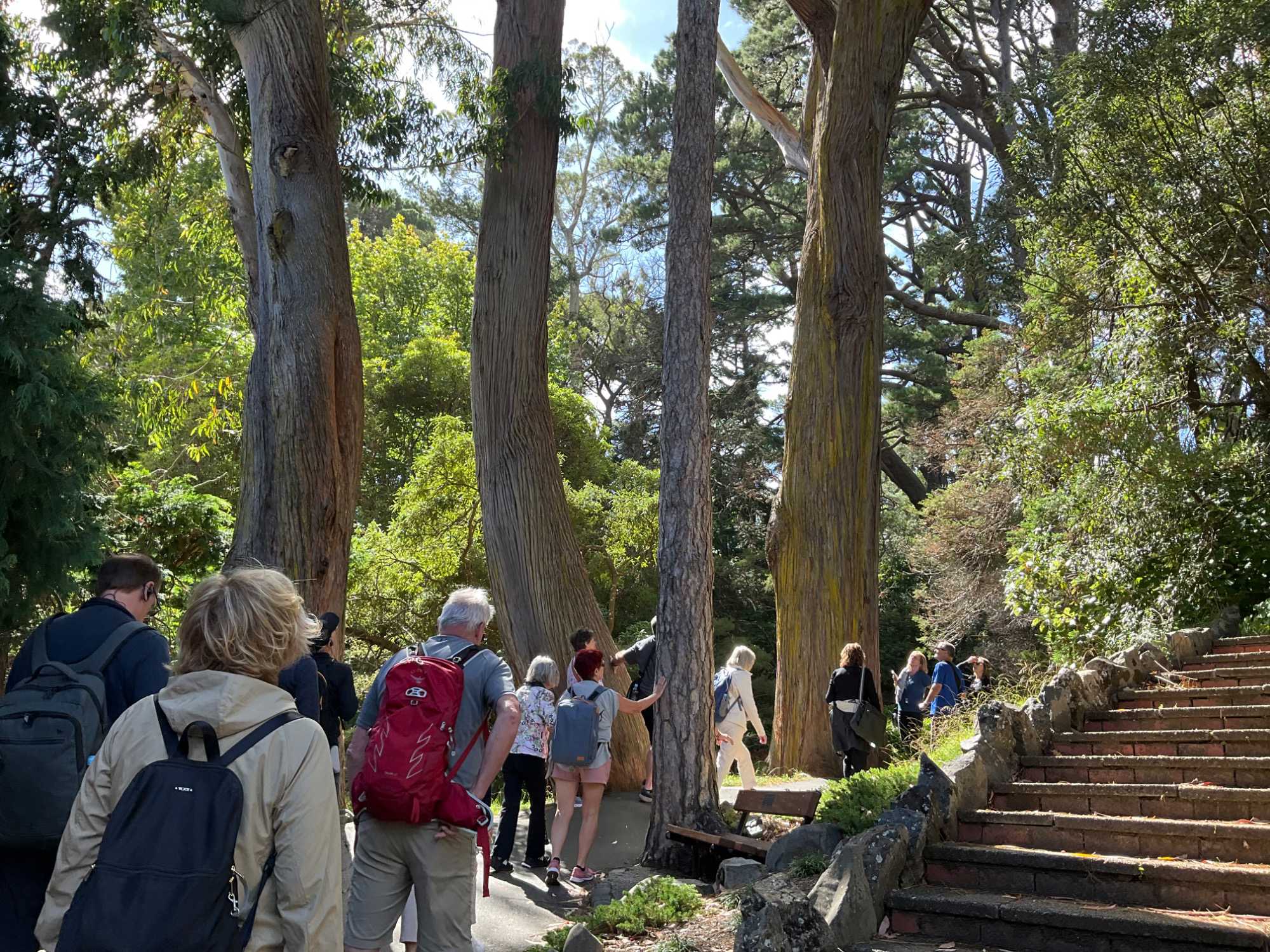 Pour le retour, Claudie a eu l'excellente idée de descendre à pied par un joli sentier en forêt. Tous nos voyageurs jubilaient de marcher un peu dans ce décor enchanteur ...et de diminuer par le fait même...notre nombre de calories. Les photographes du groupe ont joué du clic clic; un grand arbre ici, une fougère géante juste là sous la courbe pour enlever la monotonie de nos pas. Un petit trente minutes de balade sans le brouhaha de la ville et en prime les yeux remplis de découvertes de la grande variété d'essences forestières. Cette promenade s'est complétée dans le Jardin des roses de ...ce jardin botanique. Je sais, vous allez dire : encore des roses? Bien oui, c'est que les néo-zélandais ont une fascination pour cette fleur, il y en a dans chaque jardin mais ici, l'étendue des divers rosiers est vaste, leur palette de couleur; grande. Certains d'entre-nous en avons profité pour visiter les serres qui présentaient des espèces florestiques uniques. Le mieux, c'est de jeter un œil sur nos photos vous allez comprendre notre grand intérêt pour cet endroit.