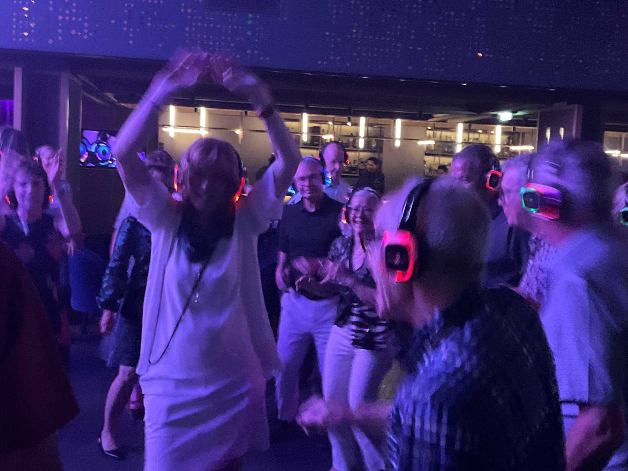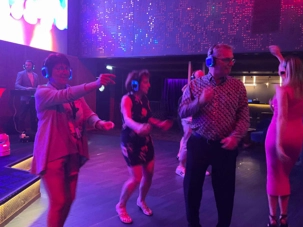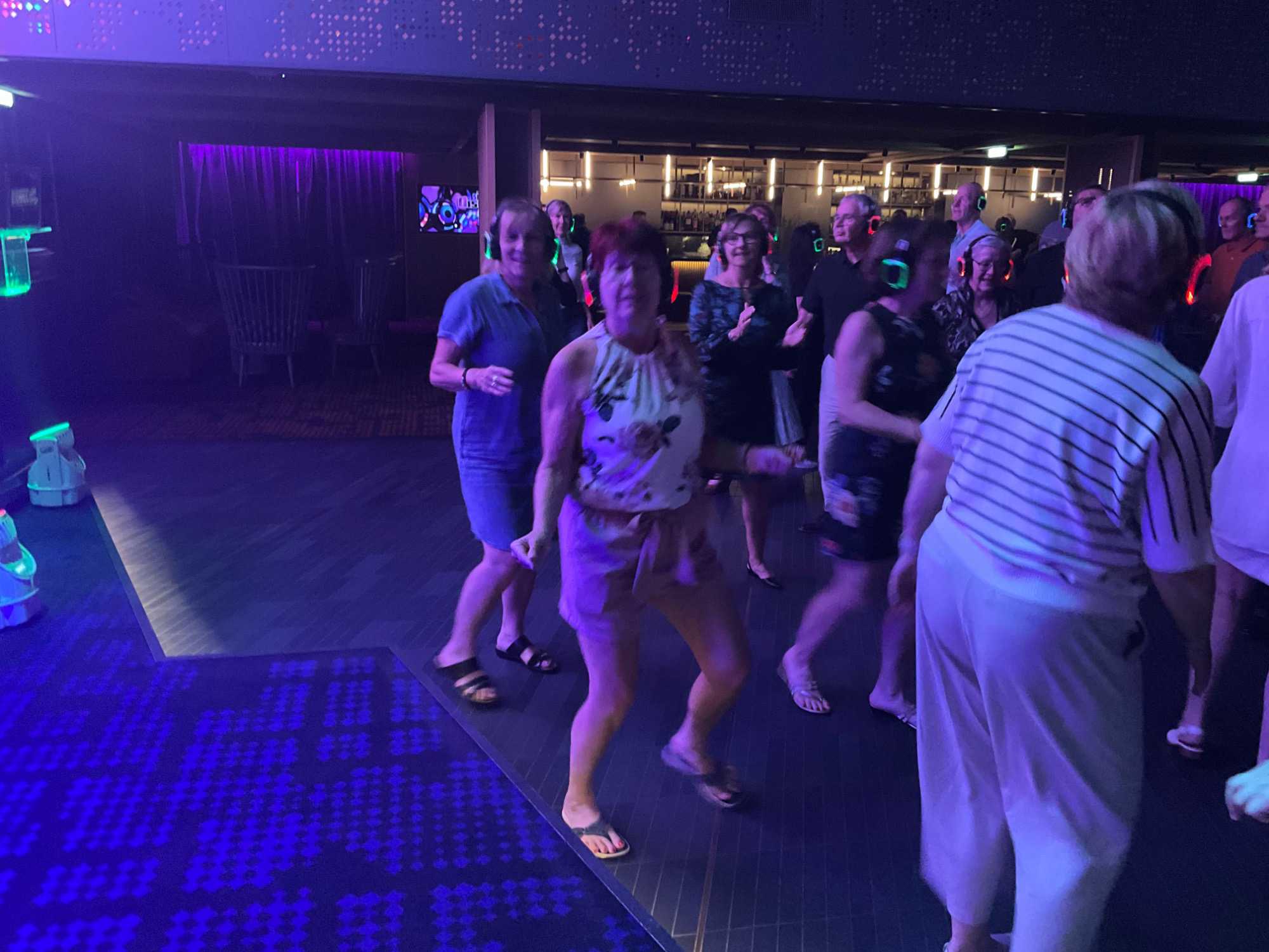 Ce soir, une quinzaine de voyageurs se sont retrouvés à la discothèque silencieuse. Chacun avec ses écouteurs sur les oreilles, son choix de trois musiques et c'est parti la danse. Les différentes sortes de danses sont permises, les mouvements s'effectuent selon que vous écoutez la musique en bleu, jaune ou vert.On ajuste les pas et en avant la musique! Ouf! Quel groupe dynamique on a ! Voyez par vous-mêmes sur les photos. Vous auriez vous aussi voulu être avec nous!