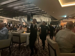 Après notre petit 5 à 6 de ce soir, on s'est retrouvé le même groupe sur une superbe table de 12 pour partager différents mets de gastronomie française et ...de homard pour certains. De beaux échanges se sont poursuivis et nous avons remercié le personnel de la salle à manger selon la coutume des croisières soit en levant nos serviettes de table alors qu'ils déambulaient autour de nous. Merci à vous de nous faire vivre des expériences culinaires sans pareil et de vos services toujours courtois, vous qui travaillez sept jours sur sept pendant sept mois avec le même sourire et surtout en vous adressant à nous avec quelques mots en français. Un énorme merci!