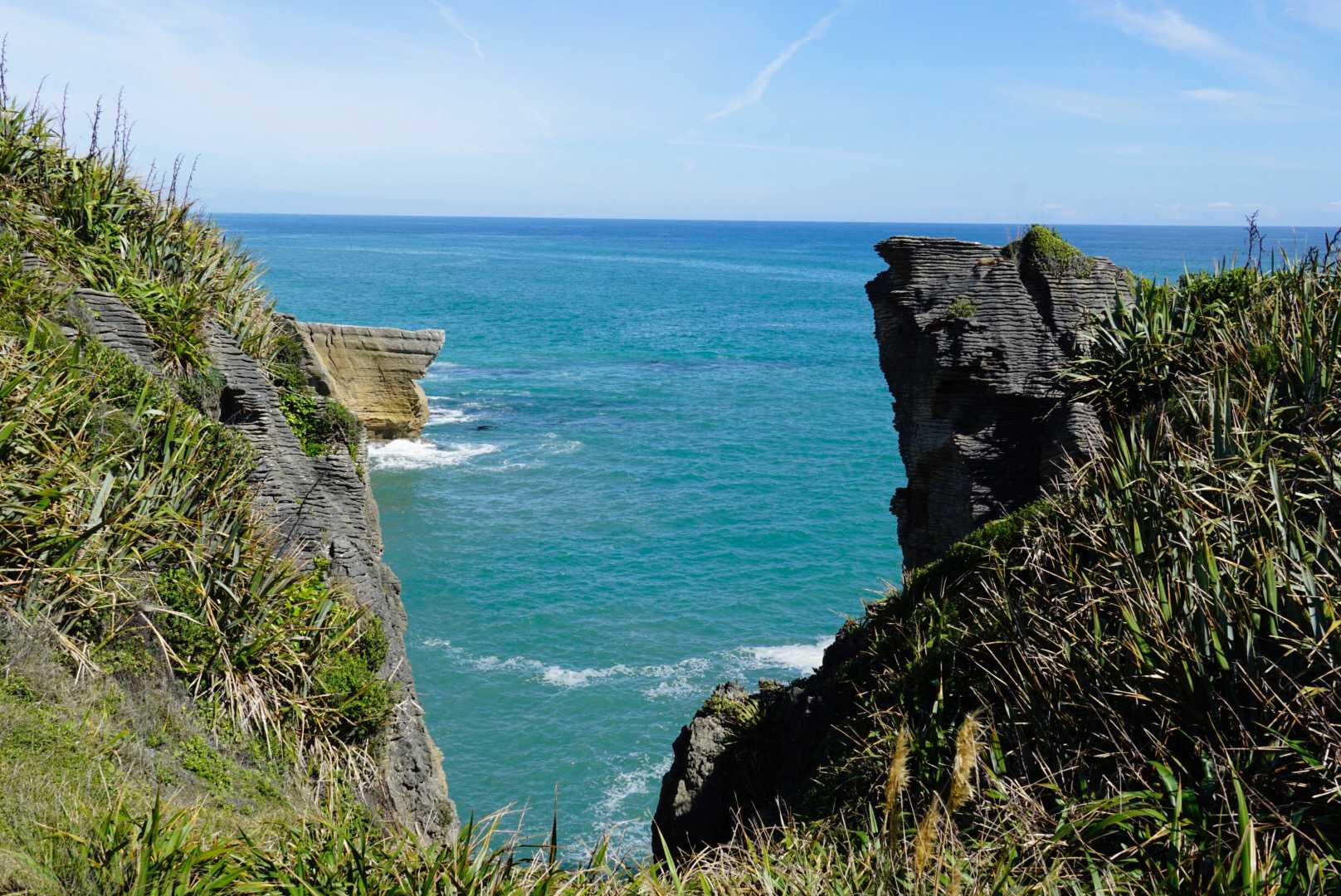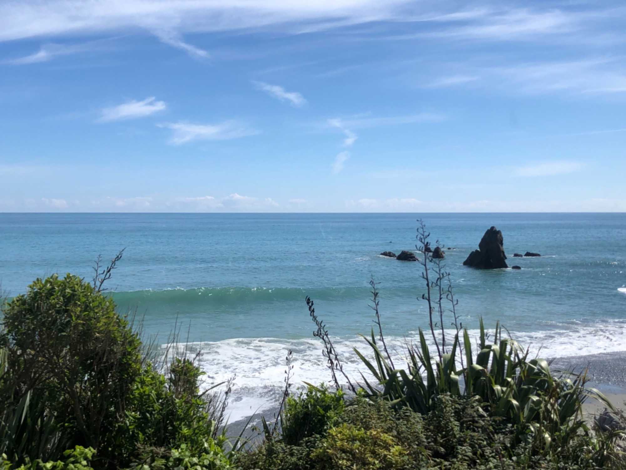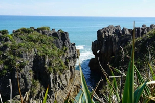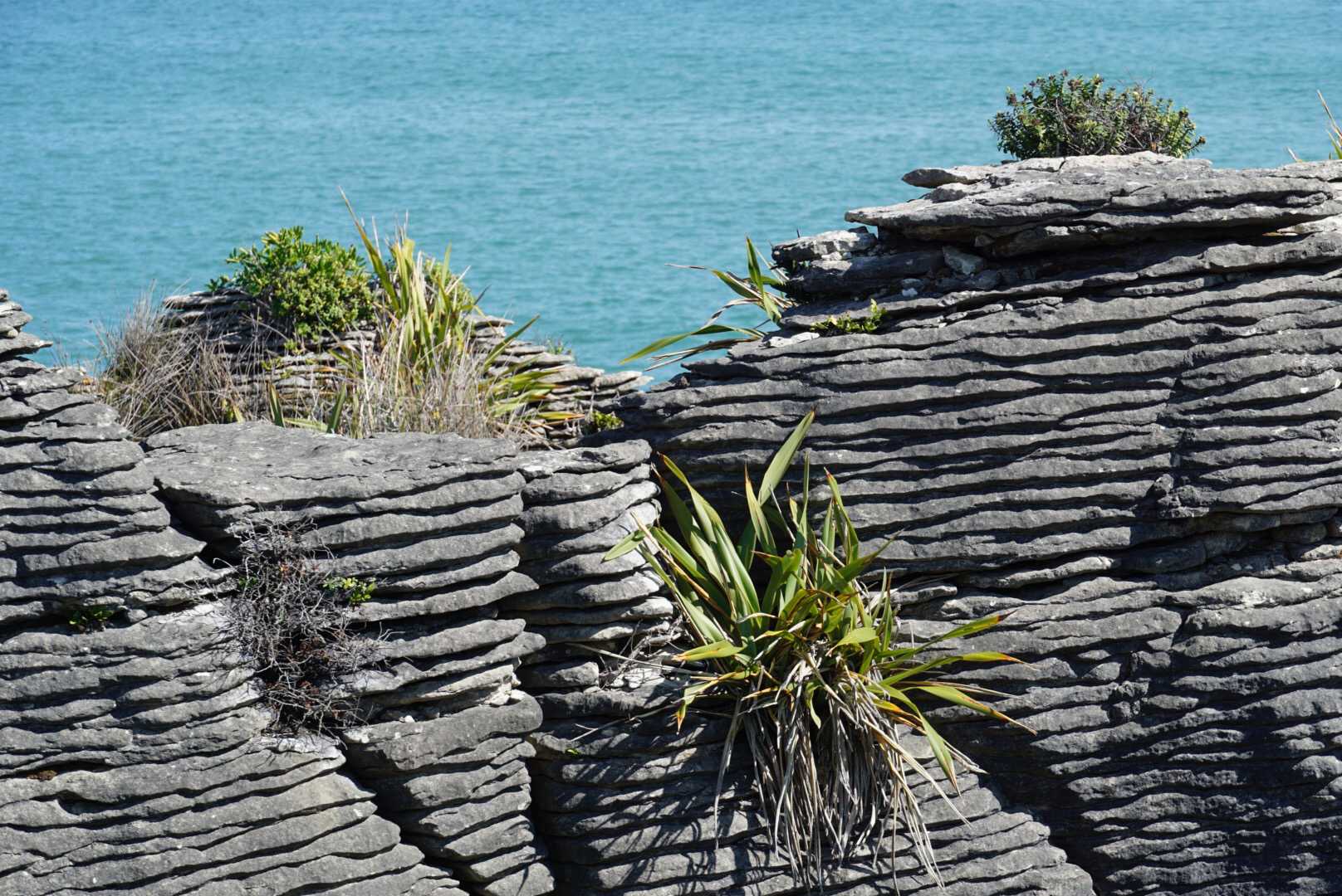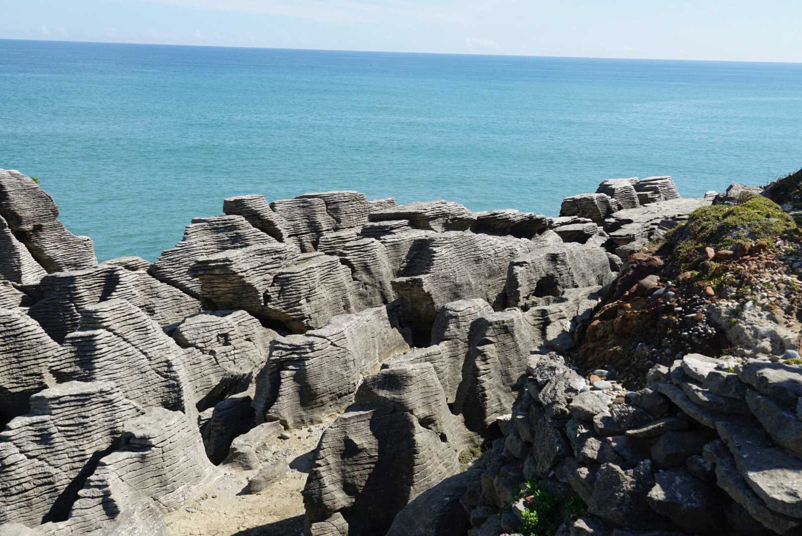 Nous pouvons admirer l’étrange relief de cette côte de l’île du Sud durant le trajet de 40 km. D’un côté de la route, la mer de Tasman, et de l’autre, une végétation dense et sauvage. Quels incroyables paysages, de toute beauté!