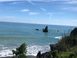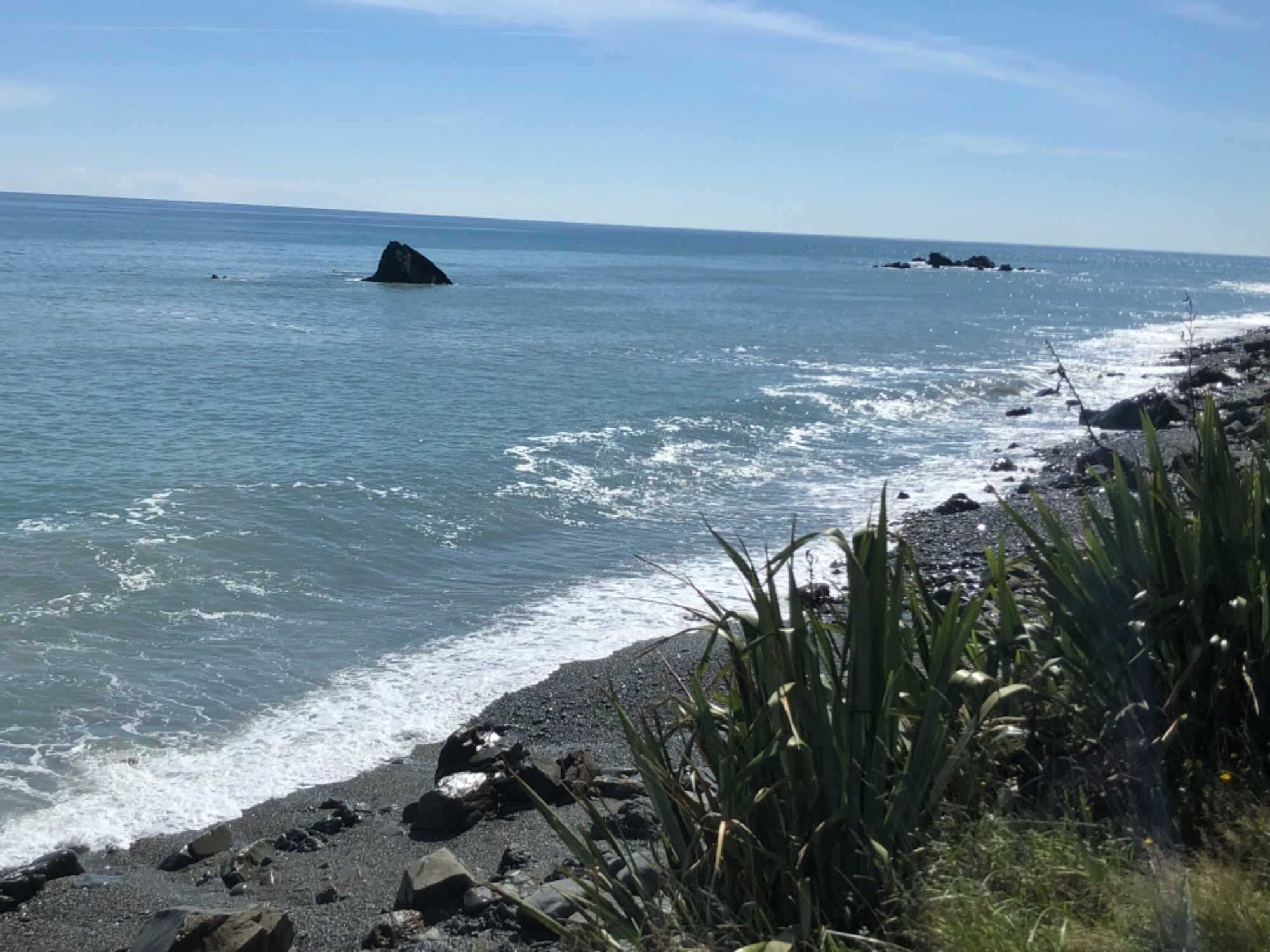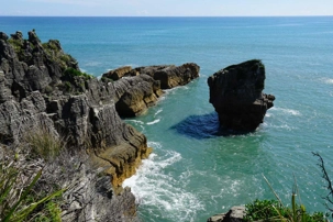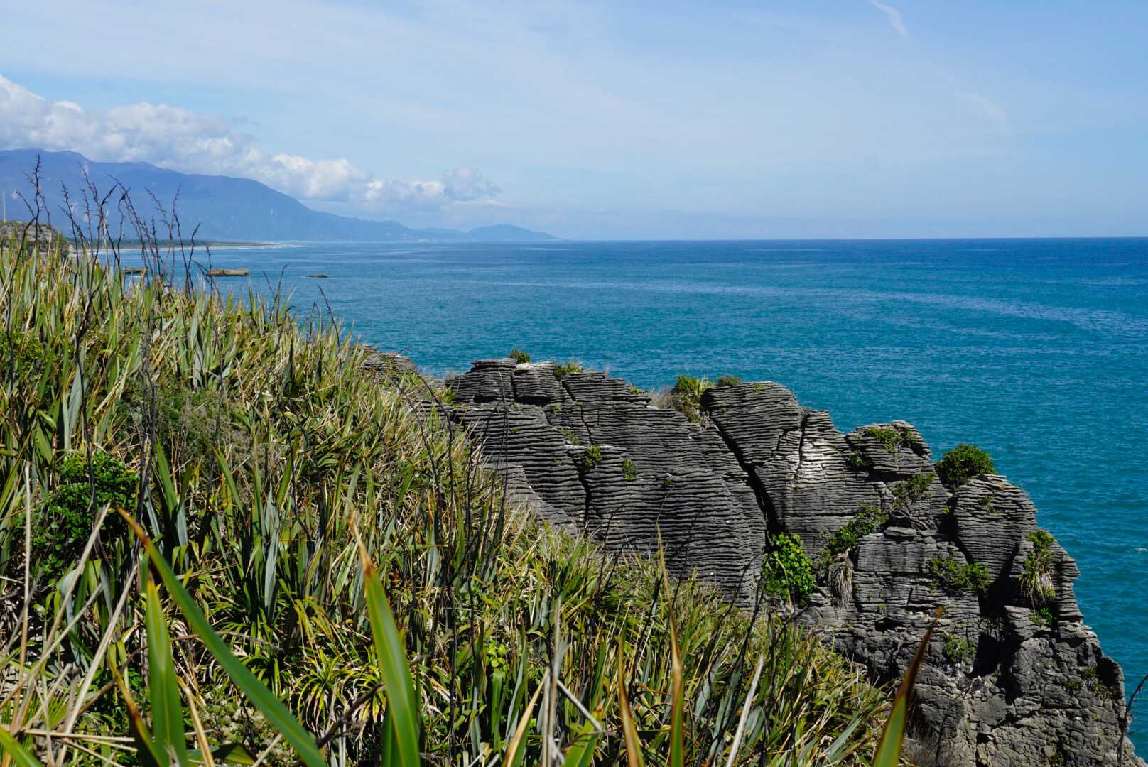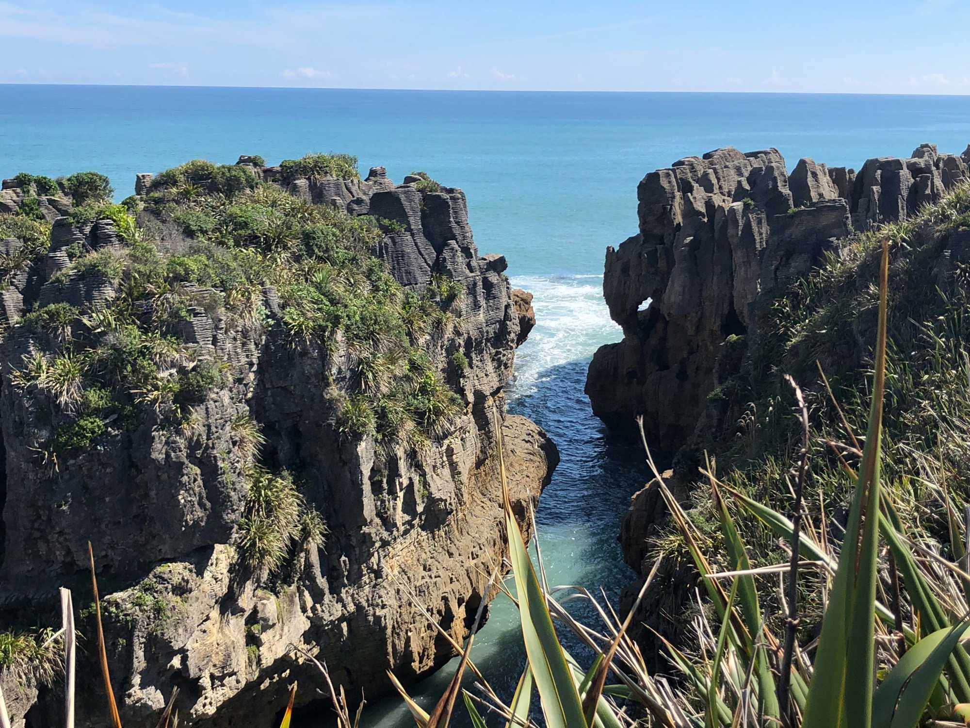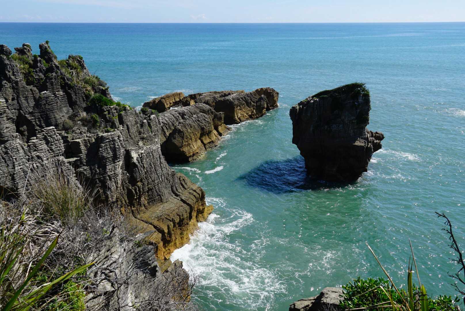 Nous pouvons admirer l’étrange relief de cette côte de l’île du Sud durant le trajet de 40 km. D’un côté de la route, la mer de Tasman, et de l’autre, une végétation dense et sauvage. Quels incroyables paysages, de toute beauté!