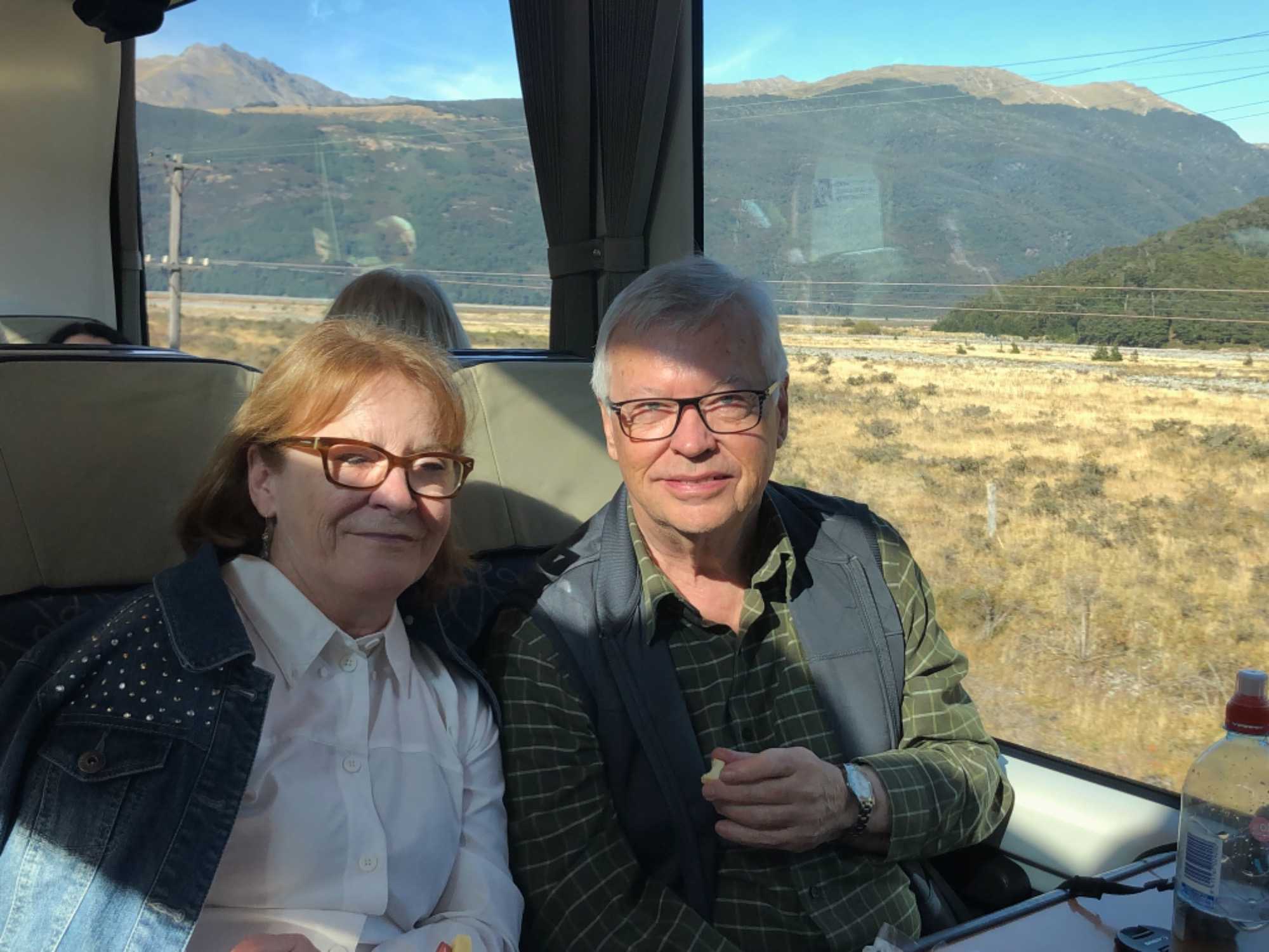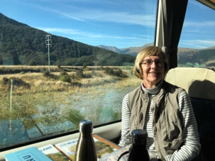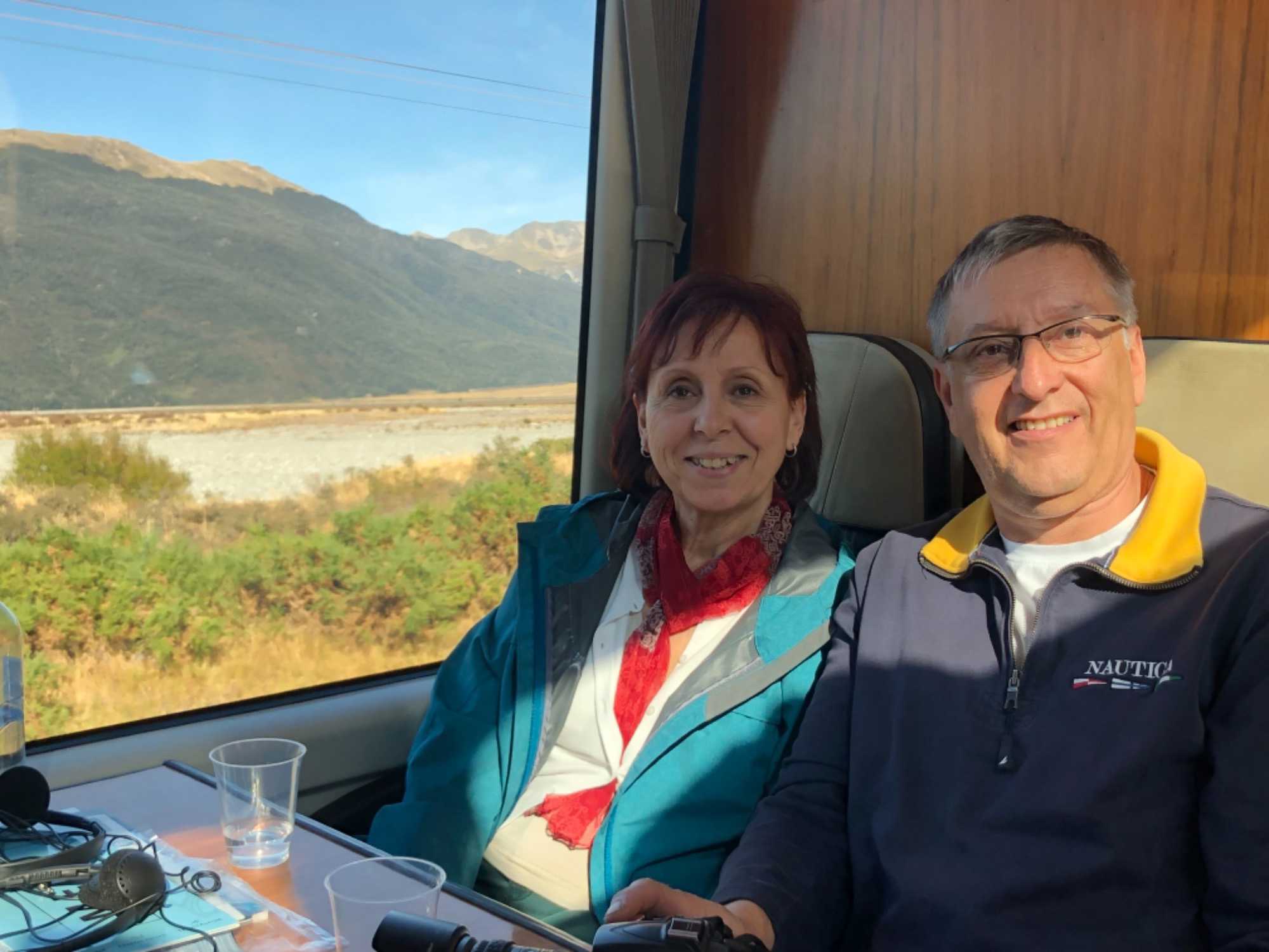 Le Tranz Alpine est incontestablement la plus belle ligne de chemin de fer en Nouvelle-Zélande. Lors du trajet, nous avons une vue spectaculaire sur les plaines de Canterbury, les gorges et vallées spectaculaires de la rivière Waimakariri. Le soleil est au rendez-vous mais nous avons, par moments, une magnifique lumière accompagnée d’une brume légère qui donne un cachet à ces belles montagnes. Nous profitons de chacun des moments et nous admirons les paysages qui défilent.