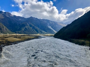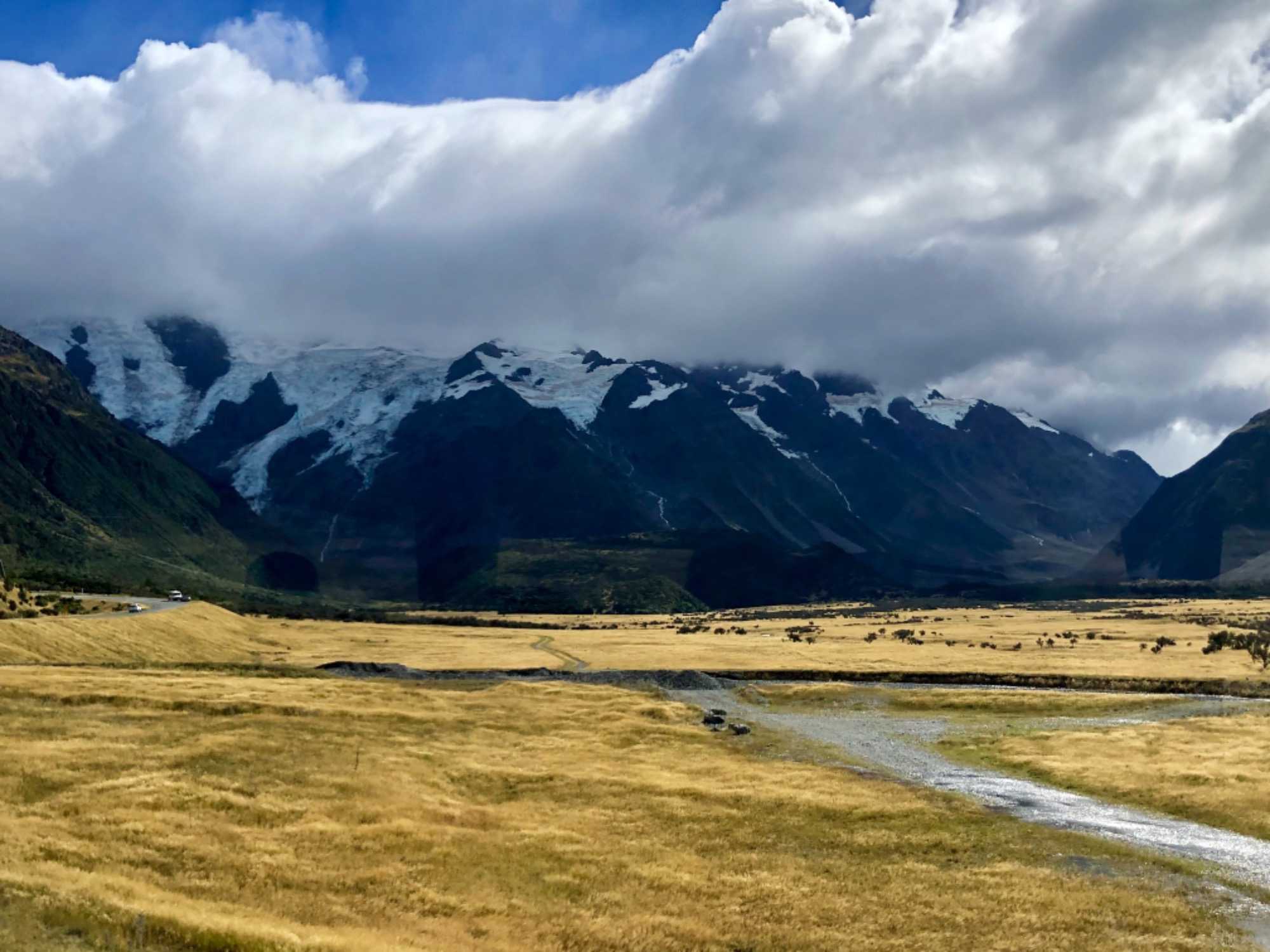Nous quittons tôt encore ce matin pour nous diriger vers le fameux Mont Cook, le plus haut sommet de la Nouvelle-Zélande. En quittant la belle ville de Queenstown, Claudia nous apprend que le pont du village de Franz Joseph où nous étions hier, a été emporté par un glacier, un bloc de glace du glacier, à cause des fortes pluies, s’est détaché du glacier et a suivi le cours d’eau. Il a ensuite heurté le pont de plein fouet pour l’emporter sur son passage. Disons que ce n’est pas super quand la route sur la côte ouest dépend de ce pont. Heureusement que c’est un peu la fin de la saison. Mais ils devront reconstruire le pont pour laisser circuler les passagers, quel travail les attend….