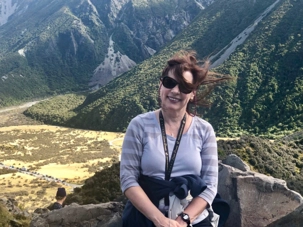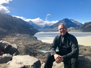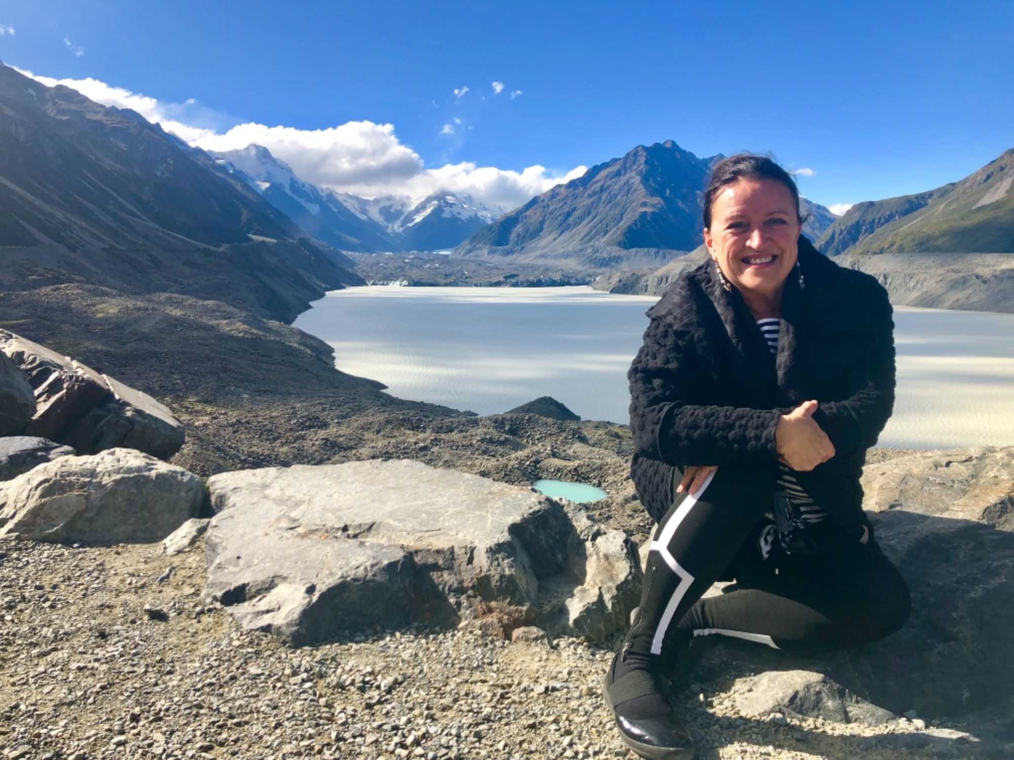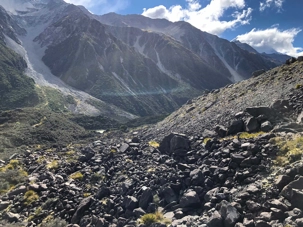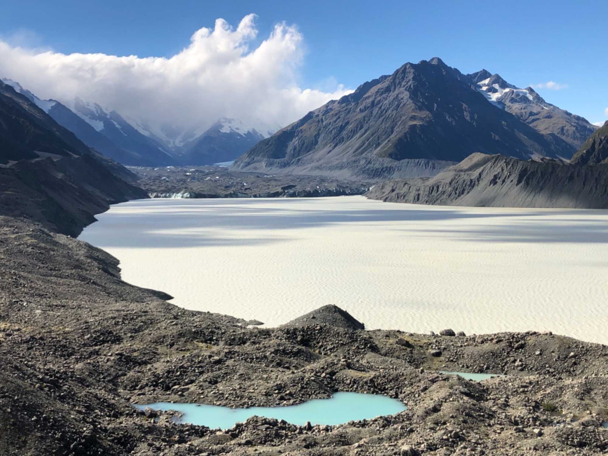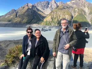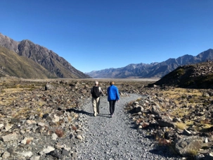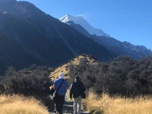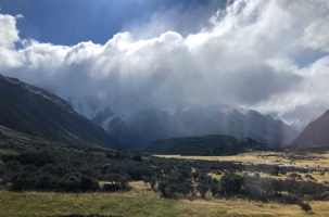 Nous arrivons à l'endroit réservé pour notre séjour. L’hôtel est très bien. Notre dîner était excellent et nous en avons profité pour relaxer avant de gagner nos belles chambres avec vue sur la Montagne. Quel beau paysage! C’était une belle surprise de se retrouver dans nos chambres avec la vue sur le Mont Cook. Nous déposons nos sacs et nous retrouvons notre autobus pour se rendre dans la vallée de Tasman où nous avons une petite marche de 30 minutes à effectuer, dans un environnement alpin de toute beauté́, afin d’atteindre les rives du lac Tasman.