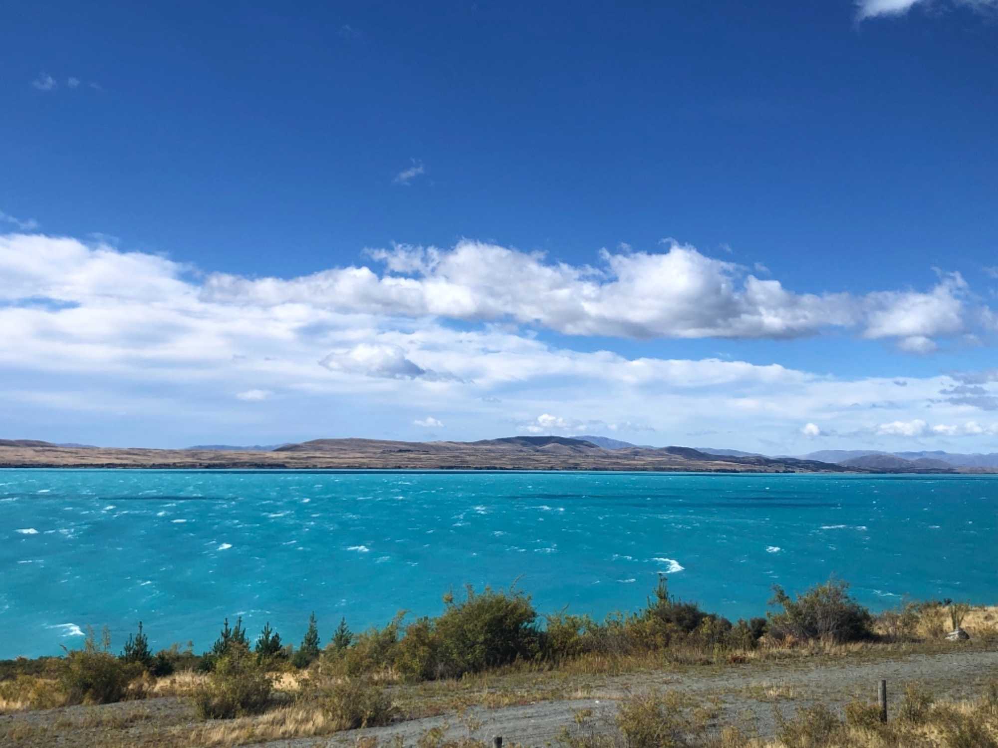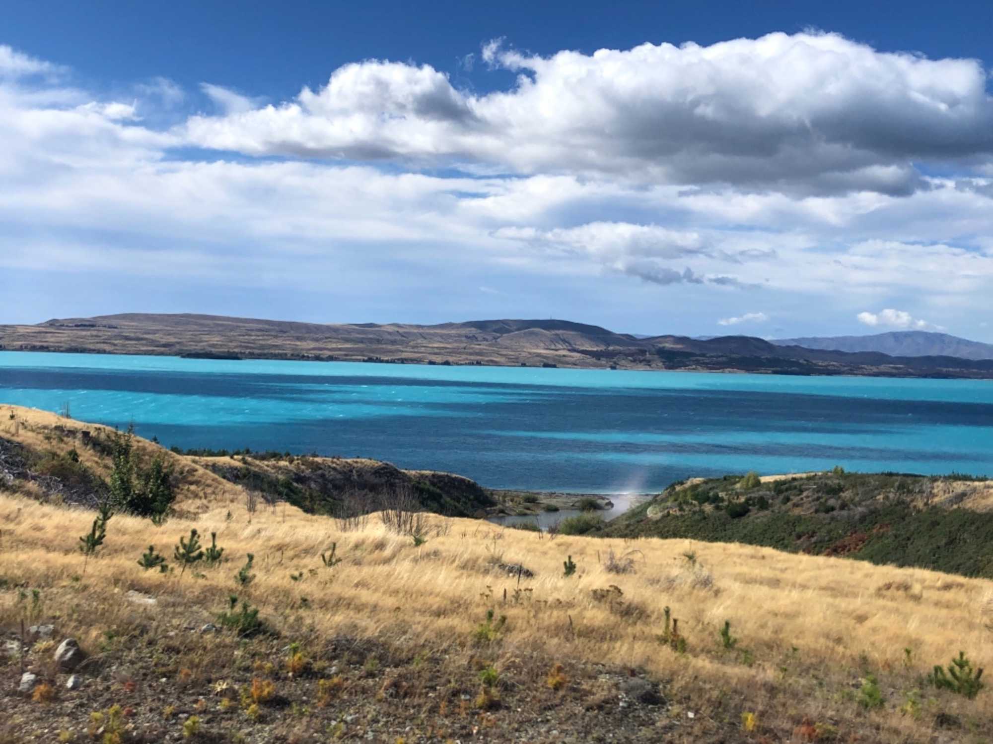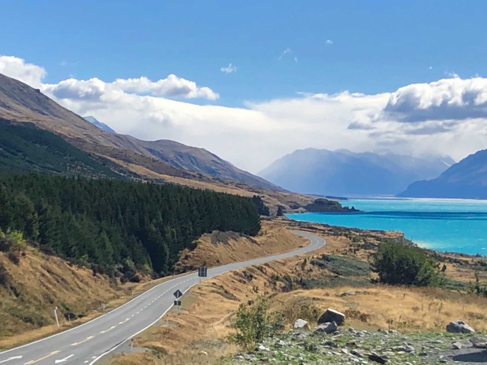 Notre découverte des beaux endroits se poursuit ce matin puisque nous longeons le lac Pukaki, d’où nous pouvons avoir une vue privilégiée sur le Mont Cook, le point culminant de la Nouvelle-Zélande, du haut de ses 3 755 m. Les couleurs du lac sont impressionnantes et nous en profitons pour faire la photo du lac Pukaki qui est splendide surtout avec ce bleu sorti des plus beaux paysages sur terre.