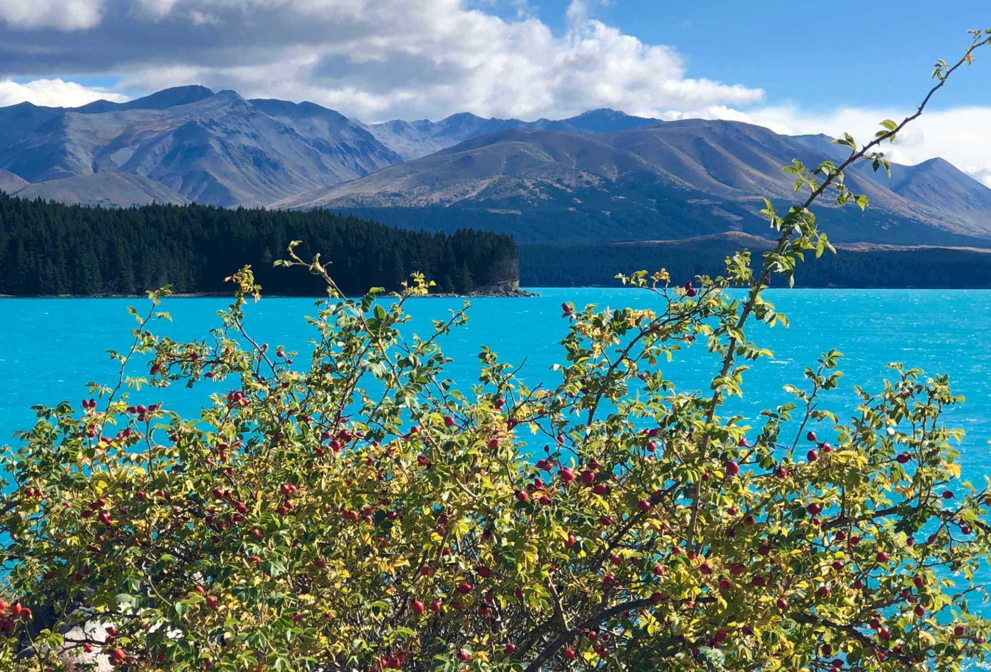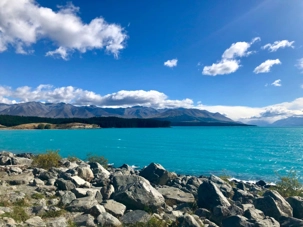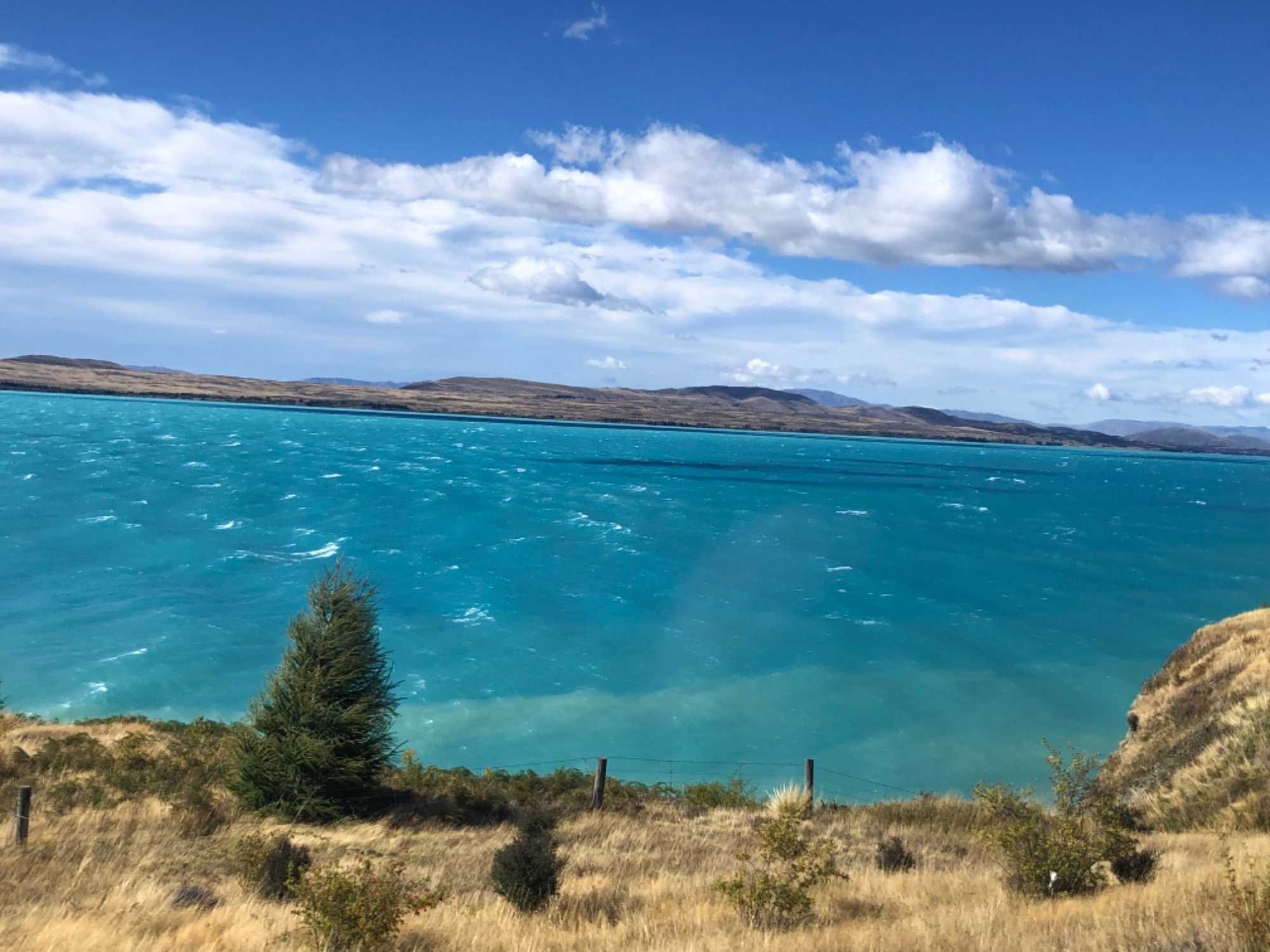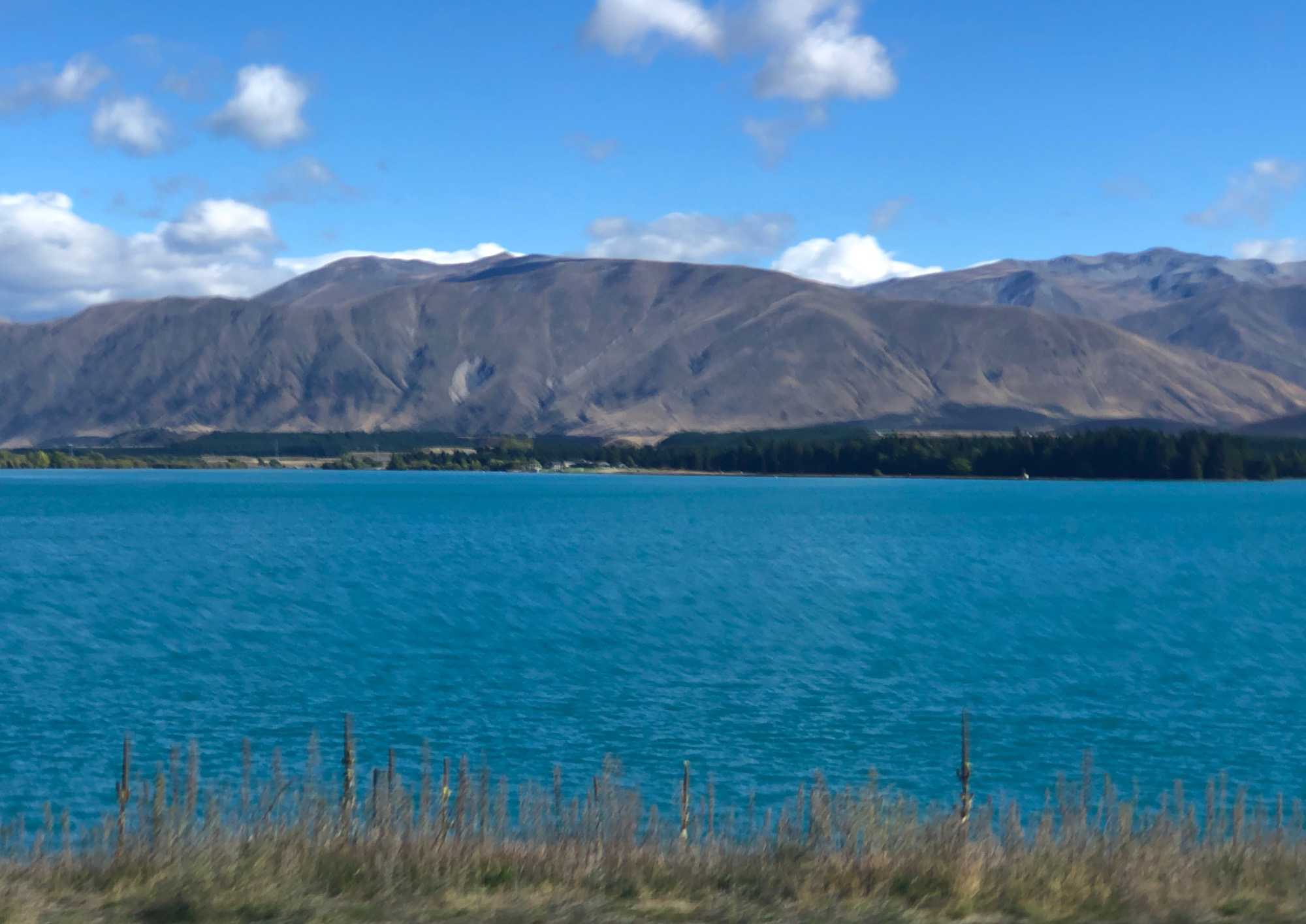 Notre découverte des beaux endroits se poursuit ce matin puisque nous longeons le lac Pukaki, d’où nous pouvons avoir une vue privilégiée sur le Mont Cook, le point culminant de la Nouvelle-Zélande, du haut de ses 3 755 m. Les couleurs du lac sont impressionnantes et nous en profitons pour faire la photo du lac Pukaki qui est splendide surtout avec ce bleu sorti des plus beaux paysages sur terre.