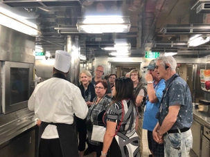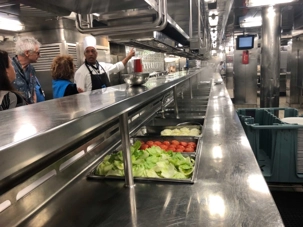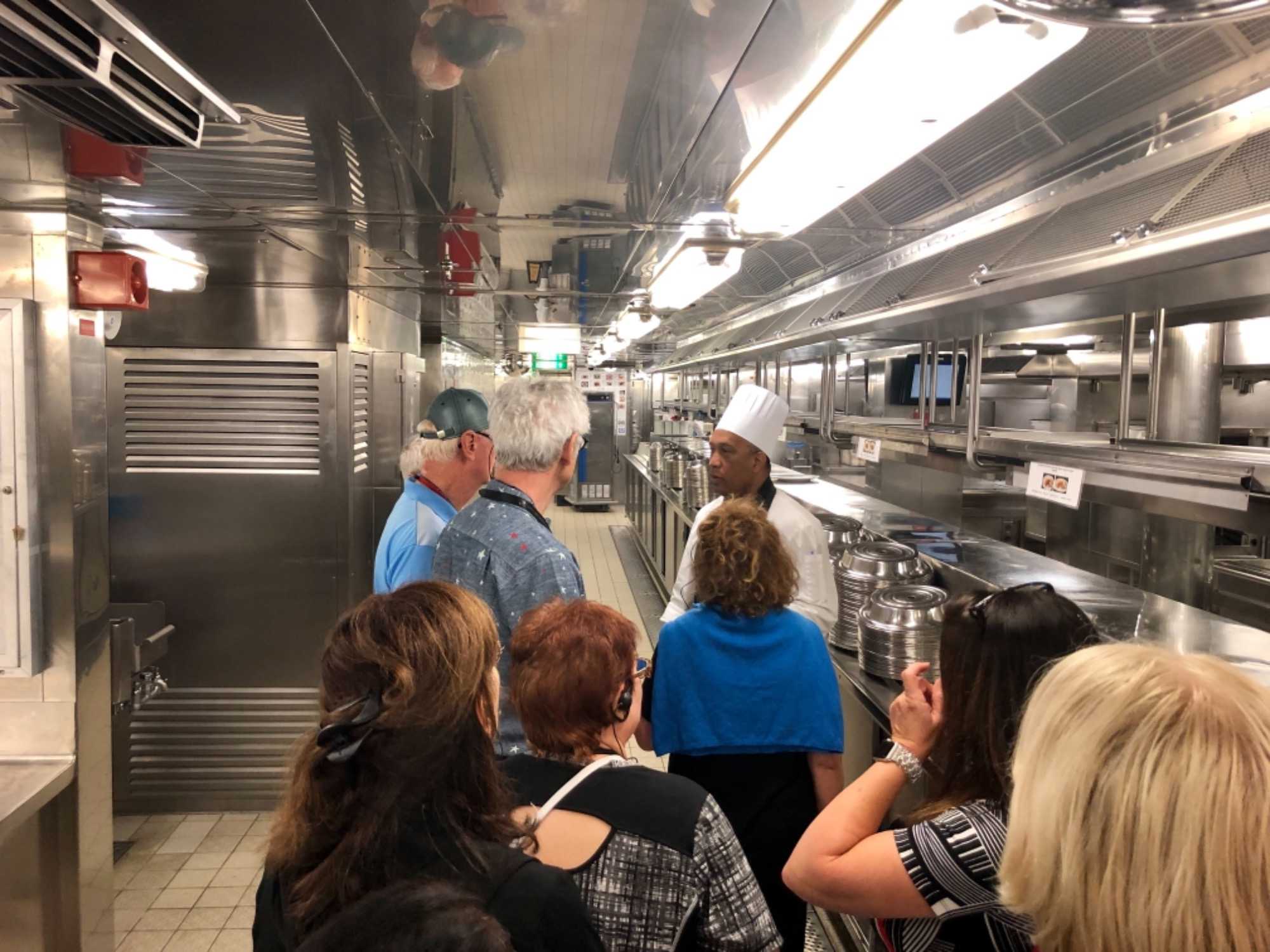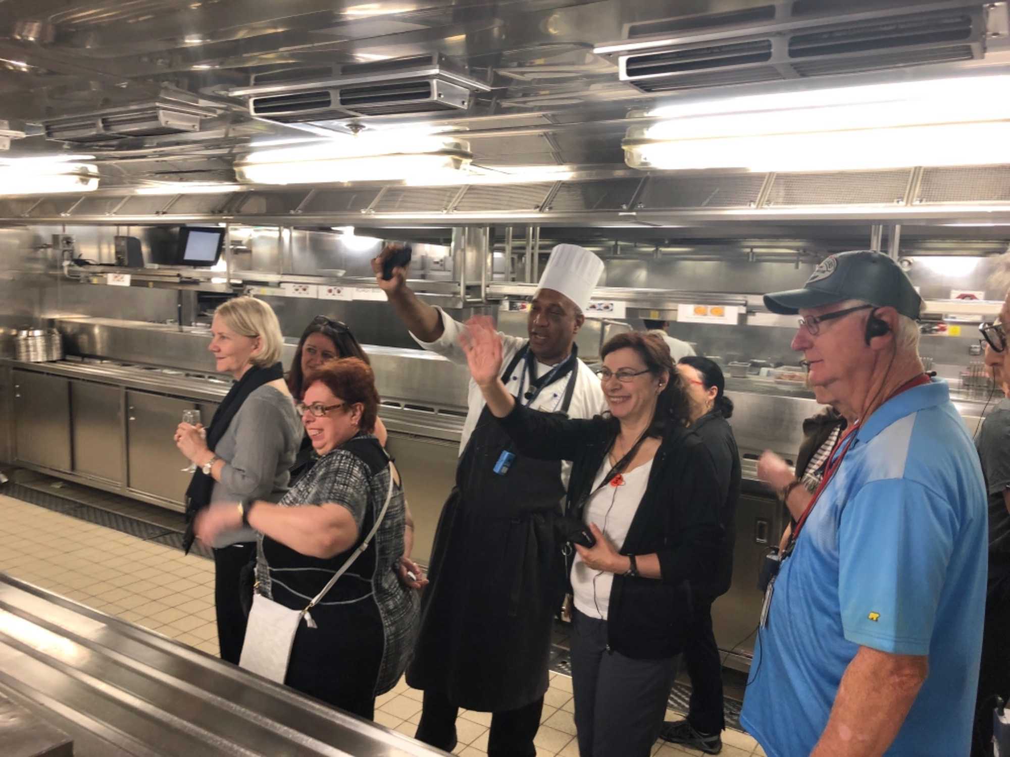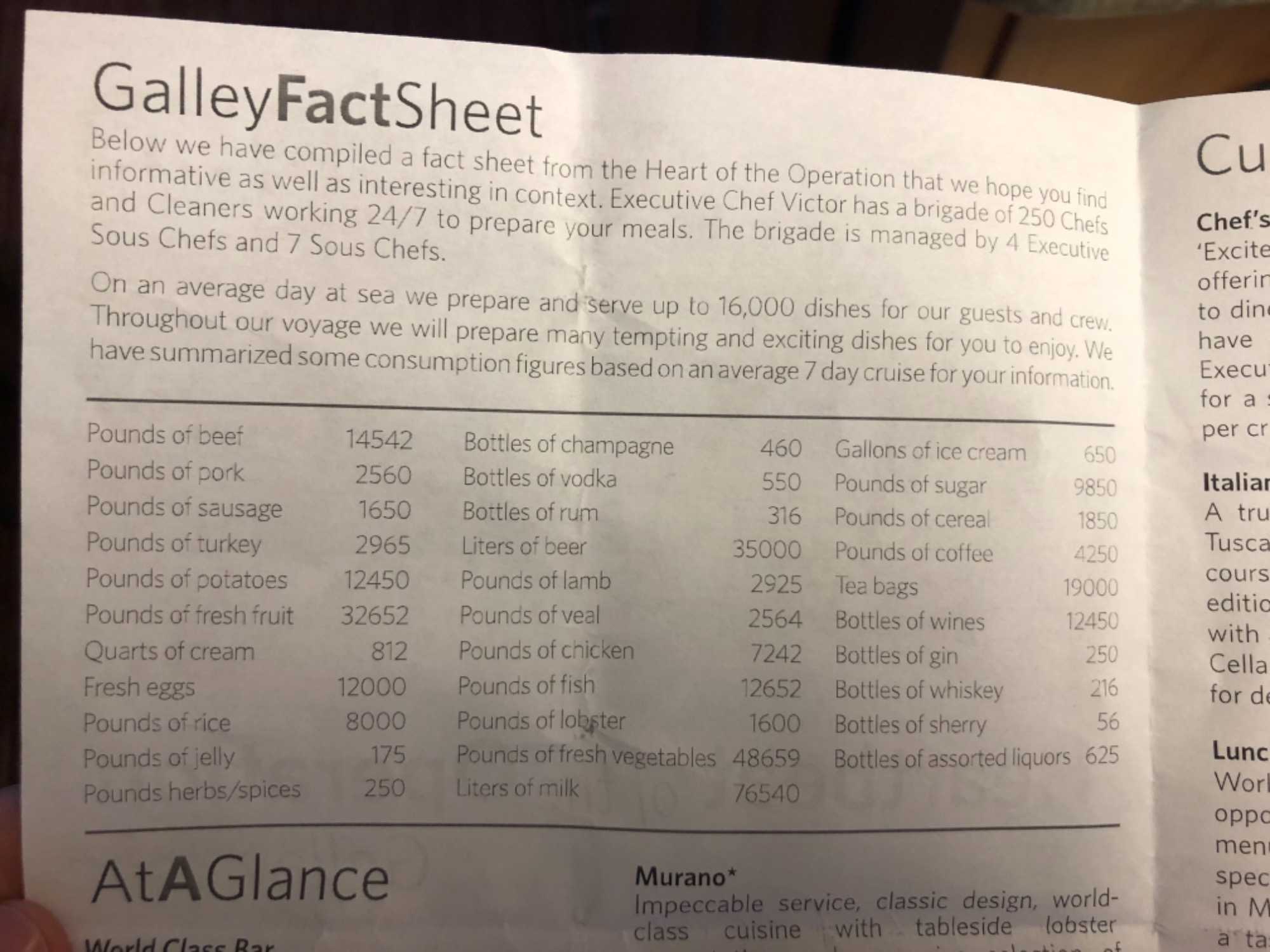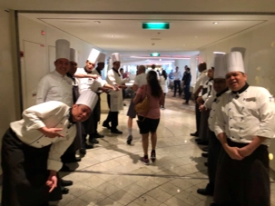 Nous avions donné rendez-vous ce matin à ceux qui désiraient faire la visite des cuisines. Il faut vous dire que c’est une très belle initiative de Celebrity que de nous présenter le travail de ceux qui nous prépareront, durant cette belle croisière, nos excellents repas. Nous avons été privilégiés car nous avons eu le premier tour sur le navire parmi les centaines de personnes présentes. J’ai certains avantages avec eux et ils me donnent souvent ces petits cadeaux. Nous étions donc seuls en premier avec un charmant mauricien, chef pâtissier, Dominic qui nous a donné toutes les explications sur leur travail. J’ai ajouté une photo des informations qu’ils nous ont donné sur les quantités de plusieurs produits utilisés pour préparer nos repas. Impressionnant!