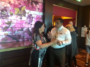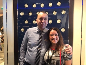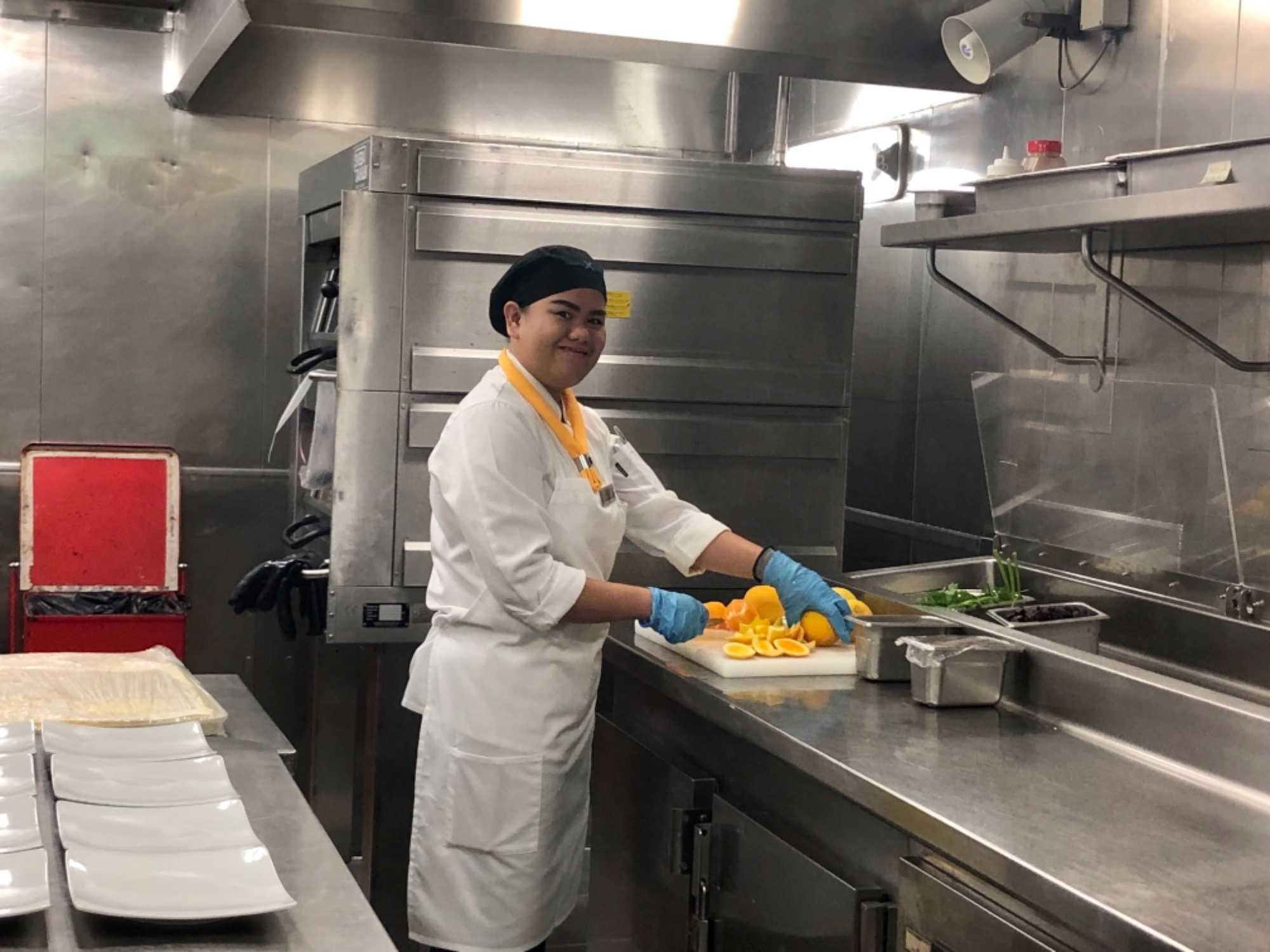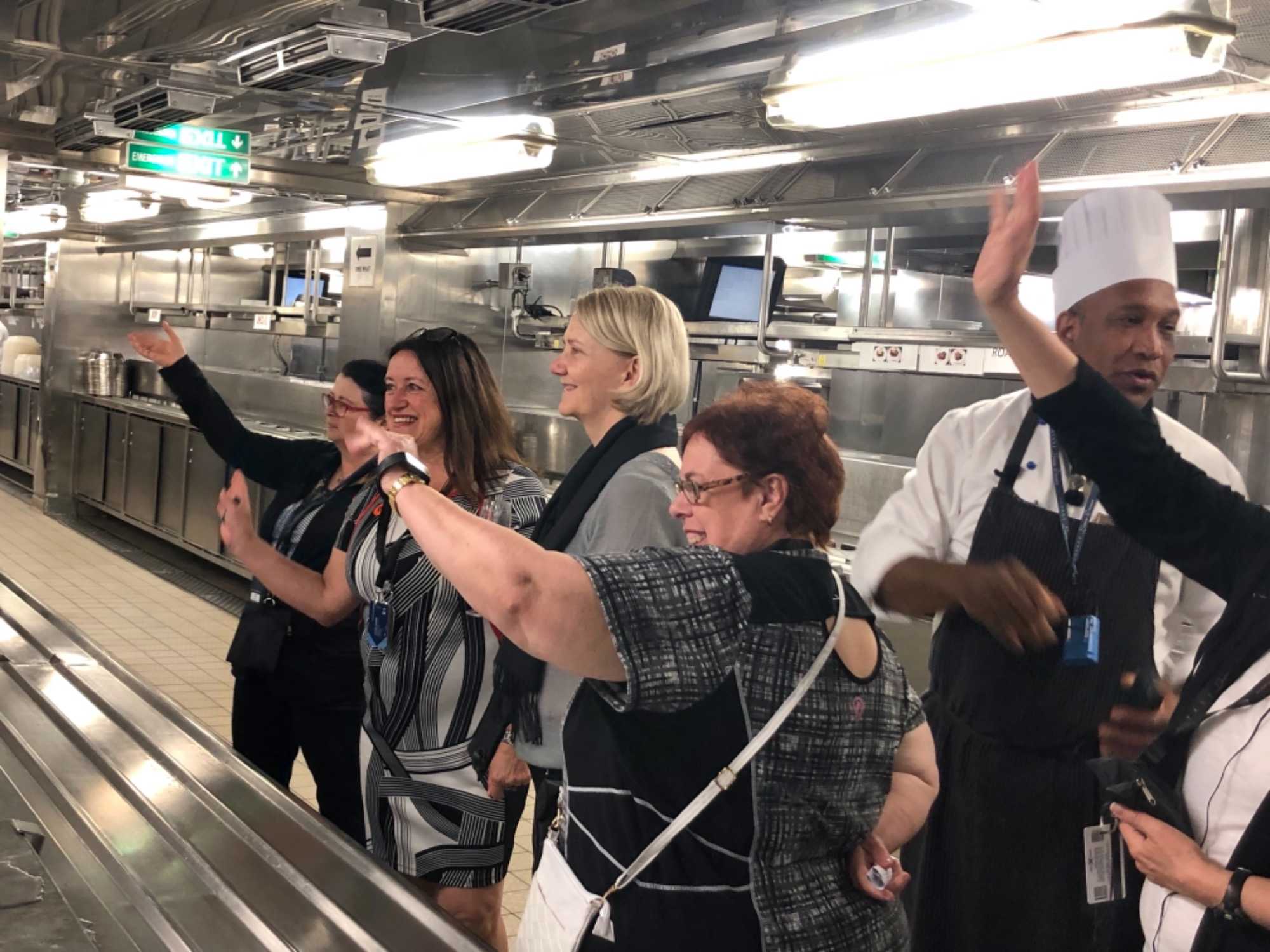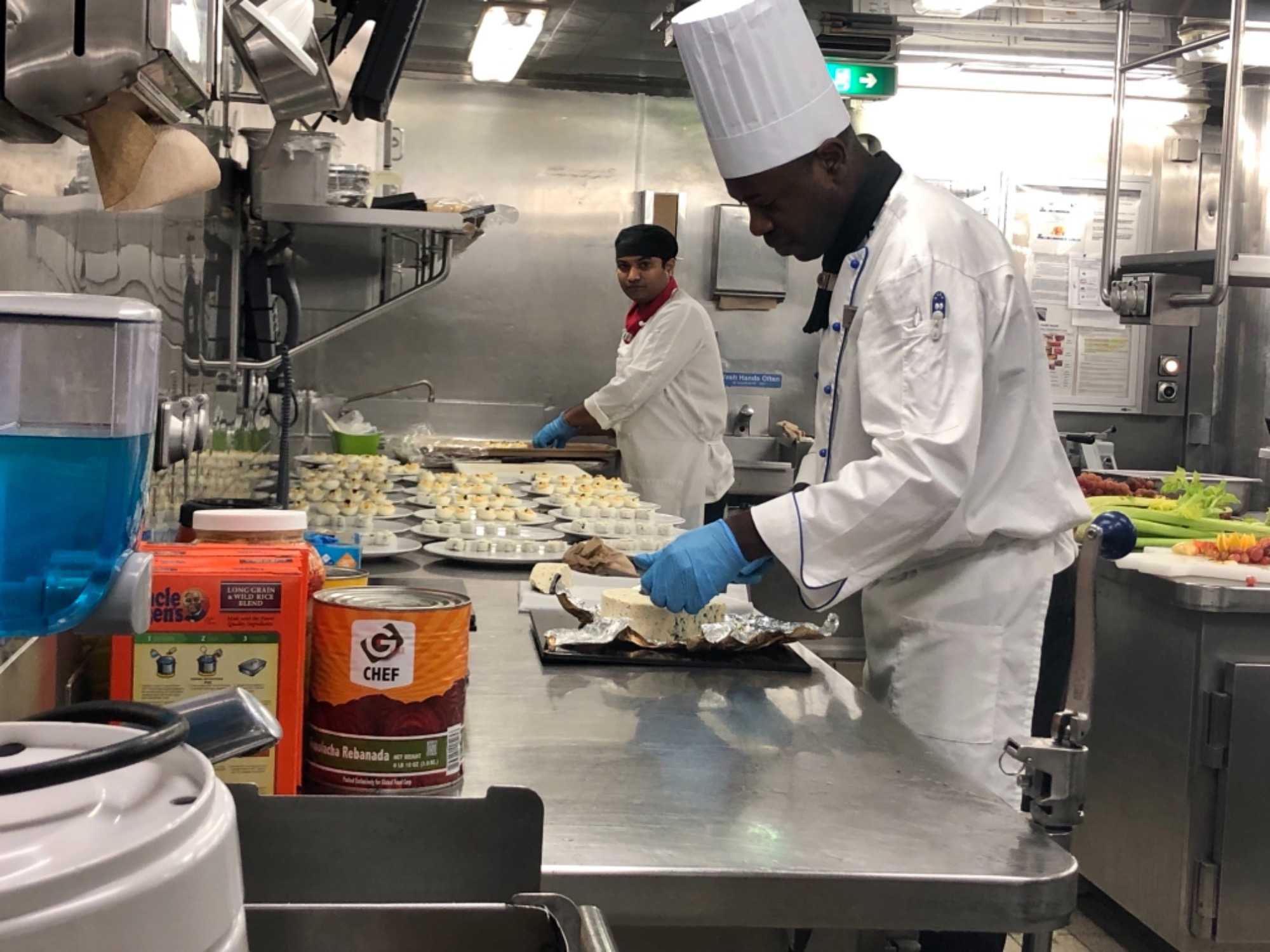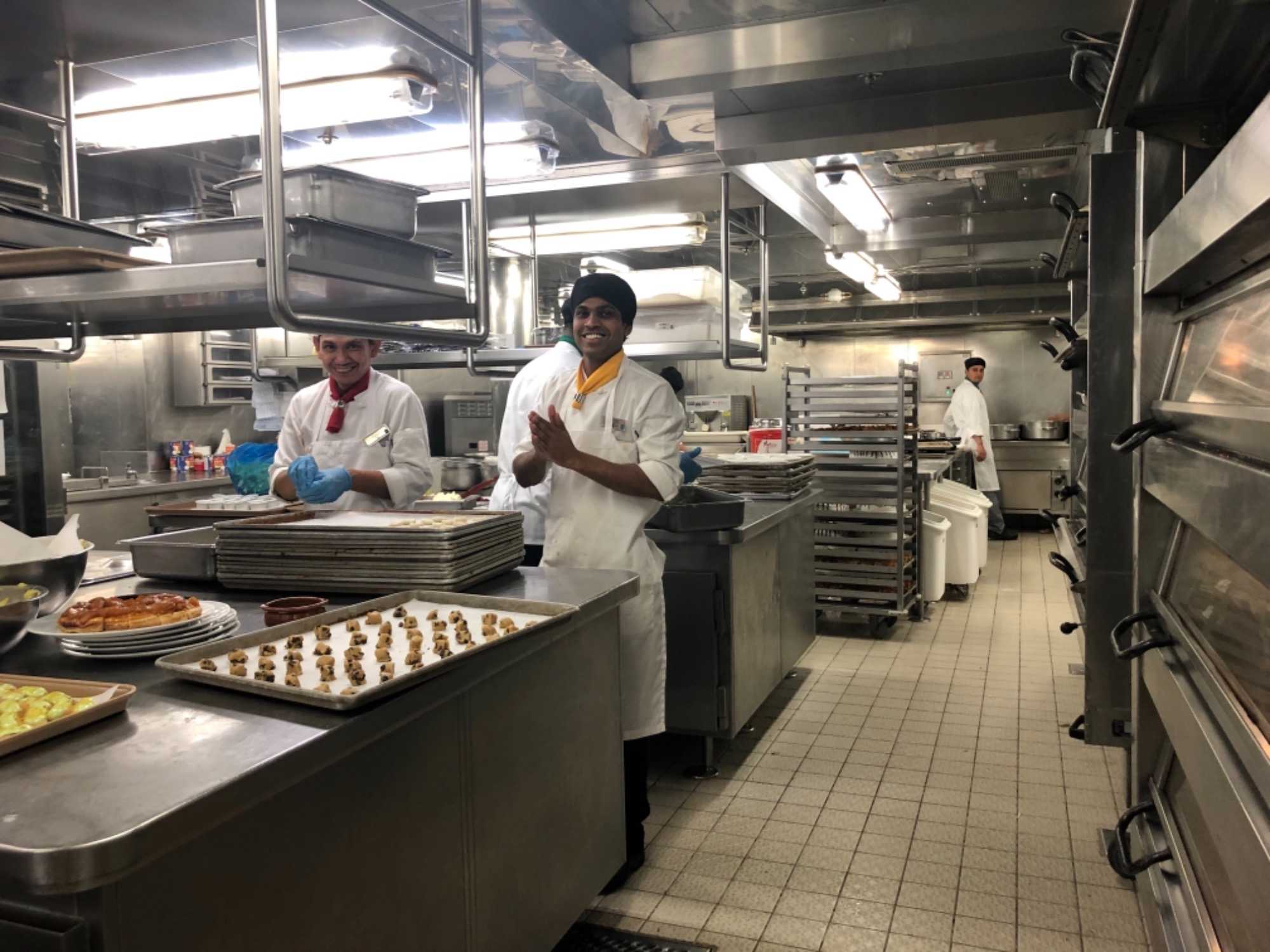 Nous avions donné rendez-vous ce matin à ceux qui désiraient faire la visite des cuisines. Il faut vous dire que c’est une très belle initiative de Celebrity que de nous présenter le travail de ceux qui nous prépareront, durant cette belle croisière, nos excellents repas. Nous avons été privilégiés car nous avons eu le premier tour sur le navire parmi les centaines de personnes présentes. J’ai certains avantages avec eux et ils me donnent souvent ces petits cadeaux. Nous étions donc seuls en premier avec un charmant mauricien, chef pâtissier, Dominic qui nous a donné toutes les explications sur leur travail. J’ai ajouté une photo des informations qu’ils nous ont donné sur les quantités de plusieurs produits utilisés pour préparer nos repas. Impressionnant!