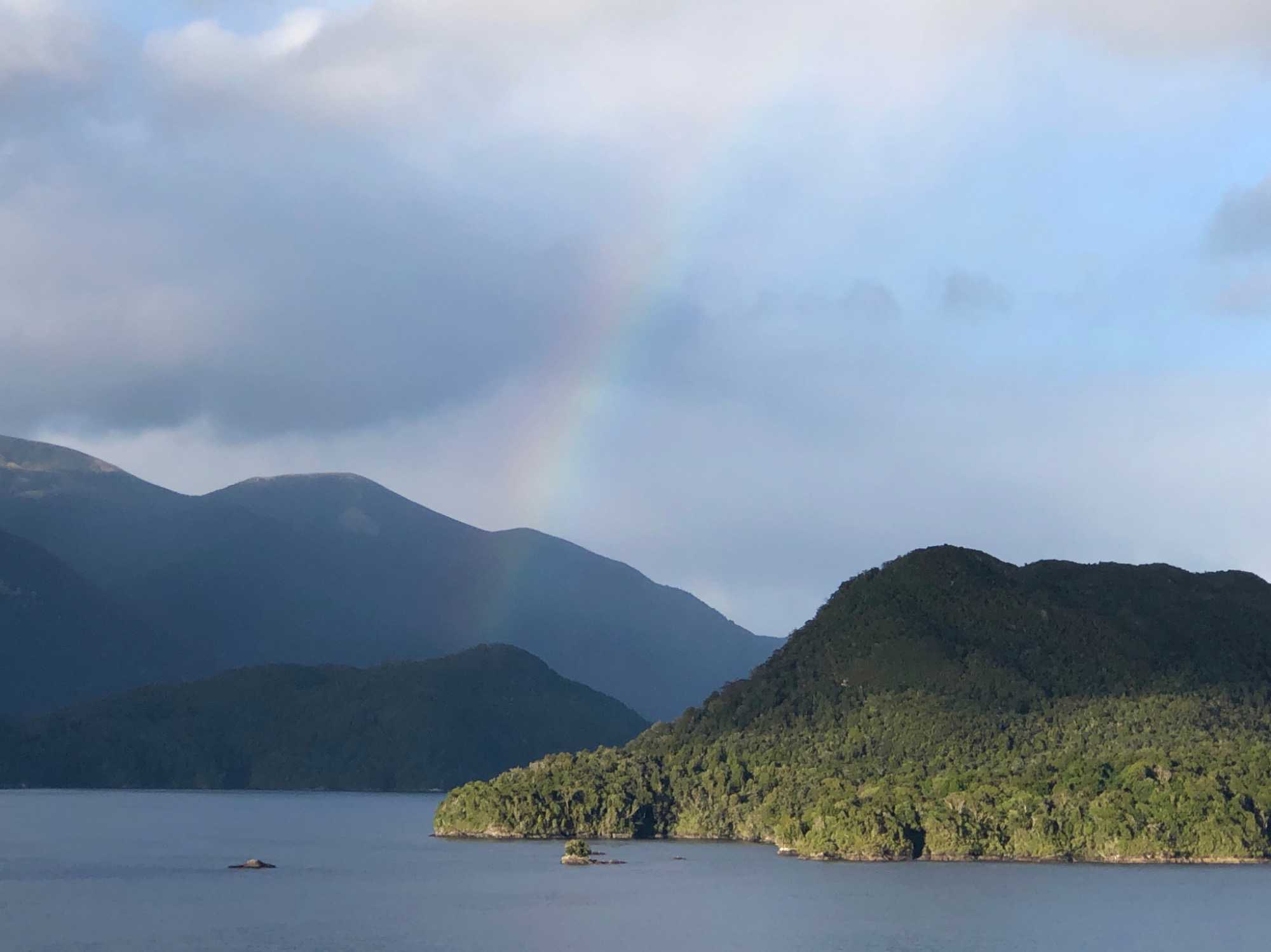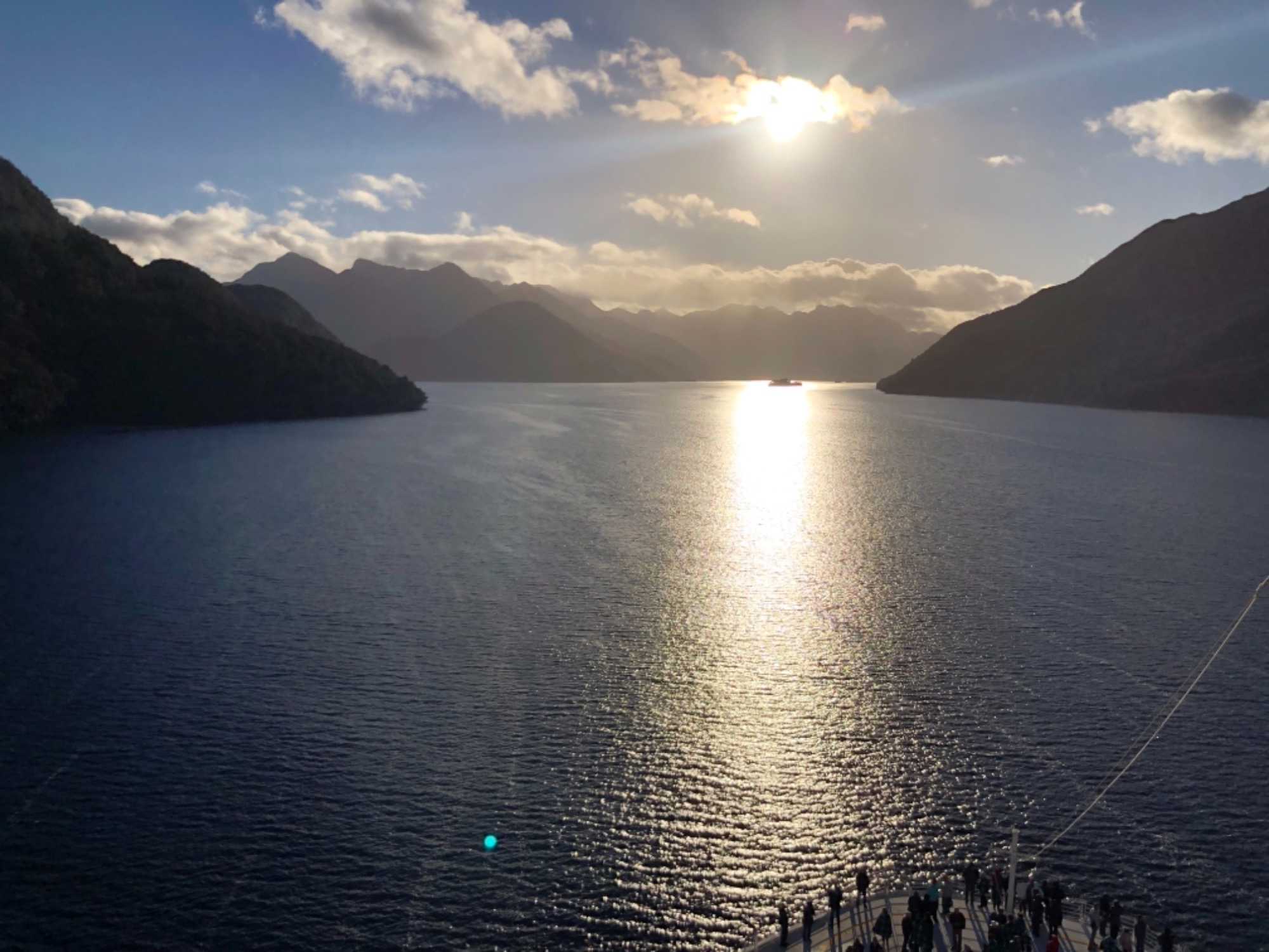 Notre navire a donc fait son entrée sous un ciel éblouissant par le Dusky Sound, le plus long fjord de Nouvelle‐Zélande, est également l'un des plus beaux, avec de nombreuses îles boisées et bras de mer. Il a reçu son nom du capitaine Cook, qui est passé par le fjord lors de son premier voyage en 1770, alors que la nuit tombait. Les endroits plus élevés de l'endroit sont abrupts et le haut taux de précipitations dans la région amène ces centaines de chutes qui se dirigent vers ce point d'eau, la saison des pluies venue. Nous étions à la recherche de la faune sauvage aquatique, comme les dauphins et les phoques et encore ici les jolis dauphins ont escorté le navire en s’amusant pour notre grand bonheur. Le soleil était au rendez-vous et les paysages étaient vraiment spectaculaires. On devait par moment être bien habillés car oui, le vent était un peu froid mais dès que le vent était bloqué par une montagne le soleil était très chaud.