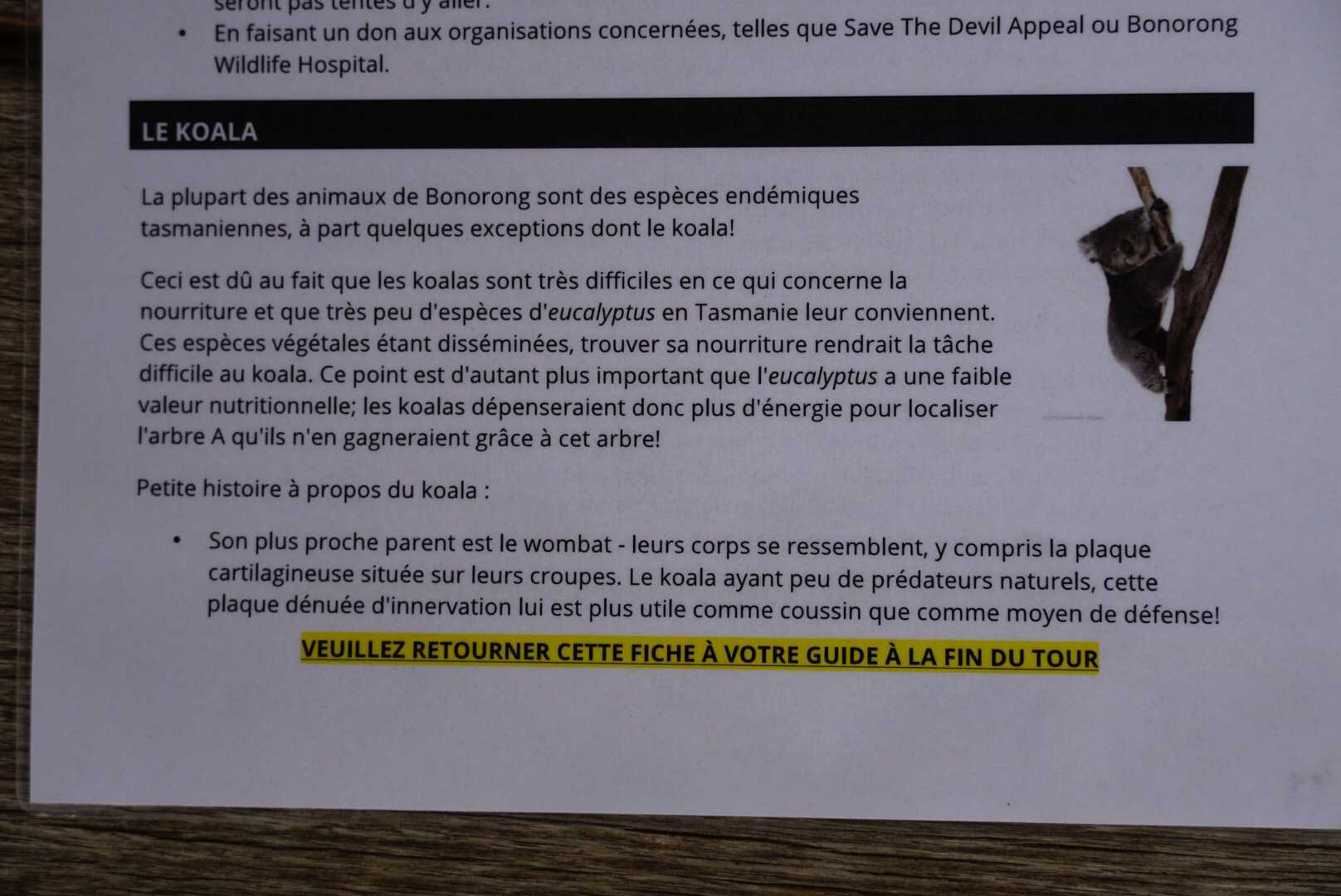 D’autre part, la Réserve finance des efforts de conservation tels que le programme de sauvetage animalier 24h/24 ou celui de reproduction du diable de Tasmanie, du chat marsupial et de la grenouille arboricole tasmanienne, tous trois en danger de disparition. Nous étions le premier autobus à y arriver ce matin pour notre grand bonheur. Nous avons débuté la visite avec notre guide qui faisait la traduction de ce que les préposés au parc nous expliquaient lors de notre passage. Nous avons beaucoup appris sur les monstres que sont les diables de Tasmanie. Vraiment pas sympathique ces diables: ils portent bien leur nom. Nous avons pris du temps pour les observer. Malgré qu’ils ne sont pas trop gros la pression de leur mâchoire est 4 fois plus forte qu’un pitbull...