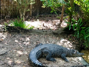 Plus loin, nous nous trouvons entre la forêt tropicale et la grande barrière de corail, que nous pouvons apercevoir d’un côté et de l’autre de la route… Deux beautés naturelles inscrites au Patrimoine de l’Humanité de l’UNESCO. Cette belle route nous amènera à Port Douglas et comme premier arrêt, Hartley’s Crocodile Adventures…où, vous vous en doutez, nous en apprendrons plus sur les crocodiles! Le parc est très bien fait et tous ont beaucoup appris sur les crocodiles. Hartley’s Crocodile Adventures est en fait le meilleur endroit pour voir les crocodiles et la faune locale. Nous avons pu aussi admirer des oiseaux tropicaux, des reptiles, des insectes et d’autres animaux endémiques. Des présentations sur différents animaux d’Australie étaient également disponibles. Nous avons tout d’abord pris un bateau réservé pour notre groupe seulement qui faisait une jolie balade sur un plan d’eau hébergeant plus de 50 crocodiles de toutes les grandeurs. Nous avons compris pourquoi le bateau avait des fenêtres et que nous ne pouvions pas sortir nos bras dehors…. Ils sont vraiment impressionnants ces monstres. Le plus gros que nous avons vu pesait 450kg, mesurait 4,5 mètres et était âgé de 50 à 60 ans. Il s’appelait Sultan et je peux dire que c’est le plus gros que j’ai vu dans ma vie. Notre conducteur les attire avec du poulet et c’est là que nous avons la chance de prendre de belles photos.