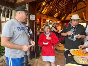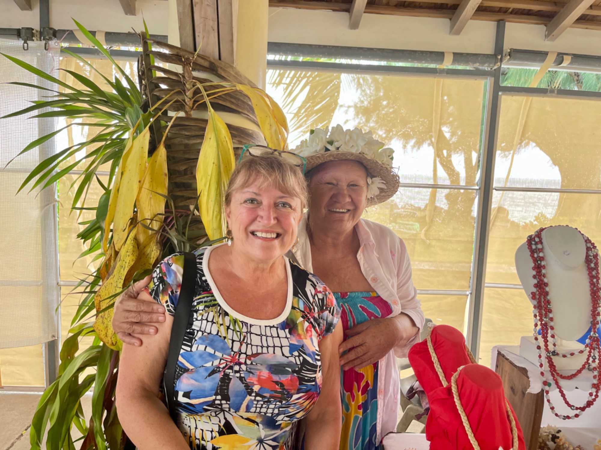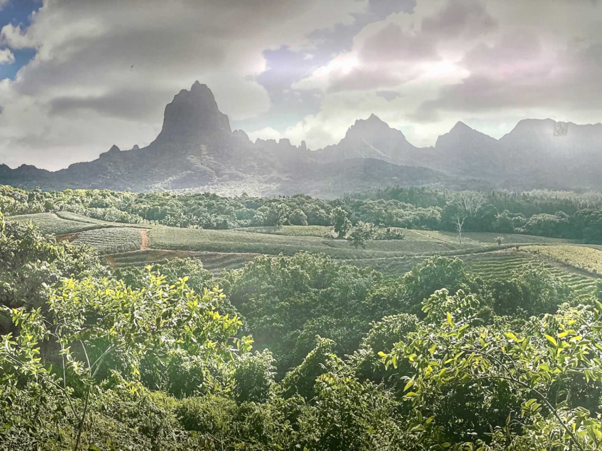Ce matin, nous avons un peu de crainte sur la température. Les nuages semblent menaçants… nous verrons bien avec un peu de chance si nous pourrons passer entre les gouttes. Nous avons une belle demi-journée de visite de Moorea : l’île au fil de nos Ā’amu (légendes) polynésiennes, de quelques anecdotes filmographiques ou artistiques et ce programme est prévu avec une superbe guide, Yvette. Un petit bout de femme très colorée et natives des Marquises, sera notre guide. Yvette une très grande passionnée. Nous avons appris sur la faune, la flore et les coutumes des habitants de l’Ile au milieu de sites magnifiques : les majestueuses baies de Cook et d'Opunohu, vestiges du volcan ainsi que le fameux plateau de tournage du film Les Révoltés de la Bounty. La pluie tombait et ensuite arrêtait ce fût cela pendant tout notre tour de l’île. Yvette nous a fait débuter le tour par un arrêt à la rencontre des artisans locaux qui étaient installés sur le quai car le navire du Paul Gauguin était en ville. Nous avons ensuite pris la direction du Belvédère ou nous avons pris quelques photos du point de vue panoramique du Belvédère. Nous avons fait un arrêt au domaine de l’unique lycée agricole de Polynésie avec ses plantations de fruits tropicaux suivi d’une visite de la fabrique Rotui où l’on savoure jus de fruits et alcool produits sur l'île. De retour à notre hôtel sous une pluie torrentielle, nous avons profité de cet après-midi pour nous reposer ou pour lire confortablement installés sur le balcon de nos pilotis. Merci à ma coloc, Marie-Michele pour son petit snack improvisé que nous avons dégusté sur notre patio accompagné d’un bon verre de rosé. Ce soir, la pluie avait cessé à l’heure du souper pour notre grand bonheur. Le souper était encore à la hauteur de la chaîne Sofitel et de leur cuisine locale et française. Un pur délice et surtout de choisir ce que l’on désire sur la carte c’est exceptionnel.