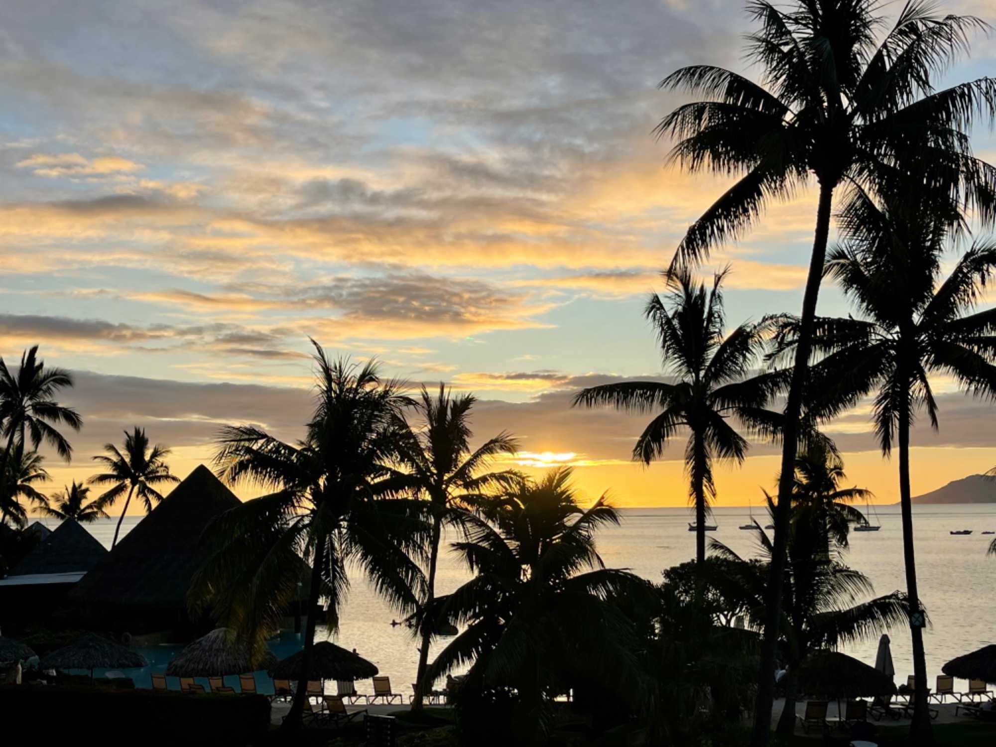 Eh oui il fait encore et toujours un soleil radieux à notre réveil encore ce matin. C’était notre dernière nuit sur des pilotis dans ce décor de rêve. Ce matin, nous aurons notre transfert par bateau de l’hôtel à l’aéroport afin de prendre notre vol vers Tahiti. Nous avions rendez-vous au débarcadère pour prendre notre bateau à 11 h 00. À Bora Bora pour les hôtels du lagon nous devons nous déplacer par bateau ce qui ajoute au charme de se sentir seul au monde. Quelques dernières photos qui souvent semblent irréelles lorsque la mer et le ciel prennent la même couleur. Ce fût notre plus long vol, mais il était de moins d’une heure seulement. Nous arrivons donc à nouveau à l’aéroport de Tahiti et nous sommes à nouveau accueillis par notre chauffeur qui nous amène à notre dernier hôtel en Polynésie, l’Intercontinental de Papeete. L’accueil à notre hôtel fût des plus agréable par deux jeunes filles charmantes qui se sont occupées de notre enregistrement. Encore une fois nous sommes chanceux car nos chambres sont prêtes malgré notre arrivée hâtive. Pour la première fois de notre voyage nous logerons les pieds sur terre et non sur des pilotis. J’avais opté pour des chambres panoramiques et ce fût un excellent choix. De très belles chambres et surtout un superbe balcon pour admirer les magnifiques couchers de soleil avec en toile de fond la belle île de Moorea. Plusieurs voyageurs se retrouvent à l’une des deux piscines pour profiter de cette belle journée ensoleillée. En soirée, les voyageurs se retrouvent au restaurant de l’hôtel à l’heure qui leur convient pour prendre à nouveau un excellent repas. Le soir la température est très agréable et nous n’avons jamais besoin de chandail chaud. Quel bonheur ce climat. Une belle nuit de sommeil nous attend encore une fois.