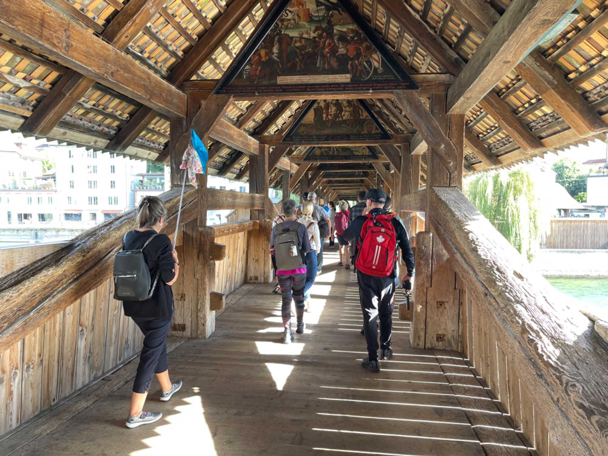 Après avoir chaussé de bons souliers, nous sommes allés découvrir ce que la ville de Lucerne nous réservait comme trésor. Naturellement, nous avons marché sur le célèbre pont de la Chapelle plus connu sous le nom de ( pont de Lucerne ) emblème de la ville.