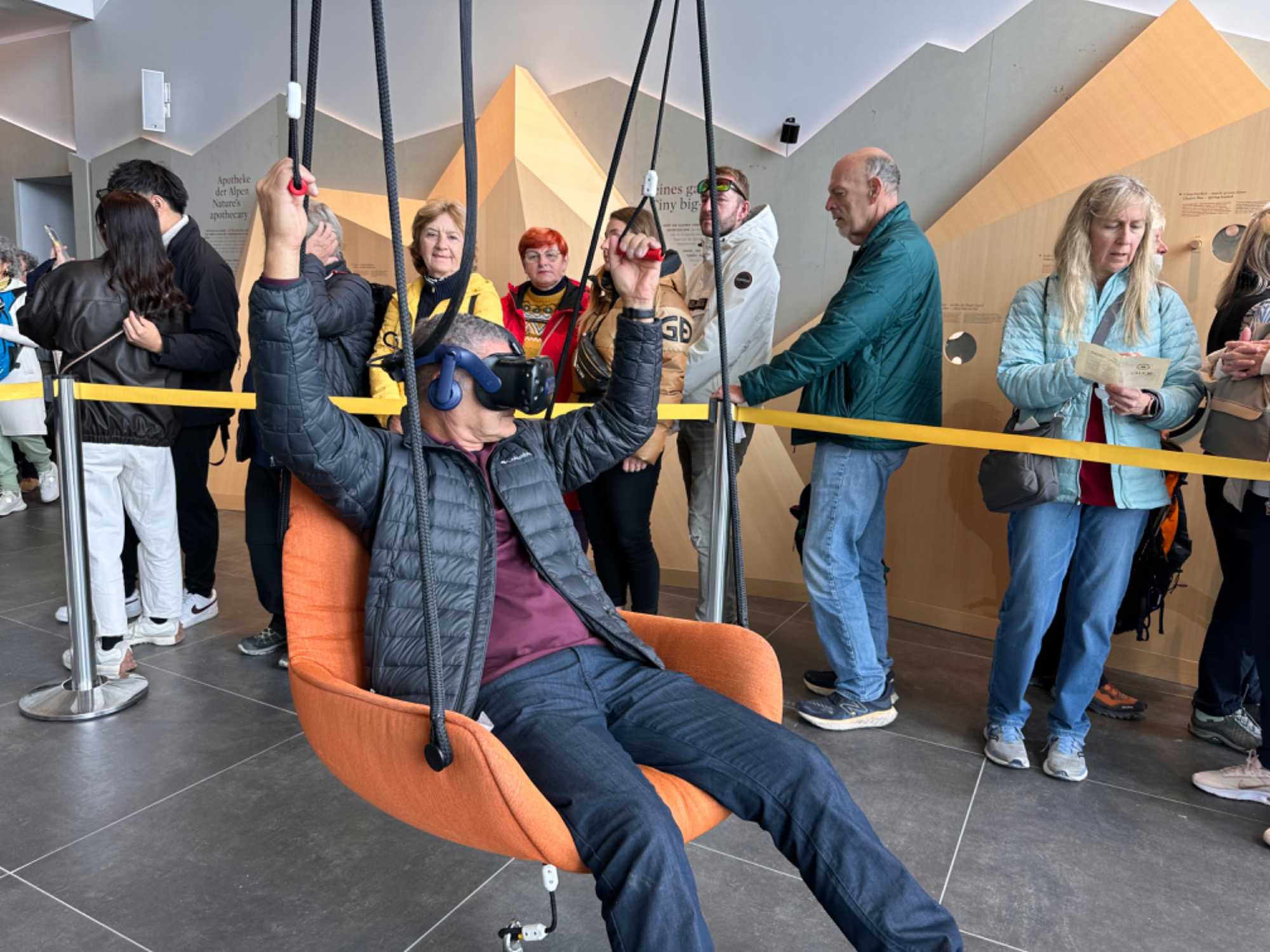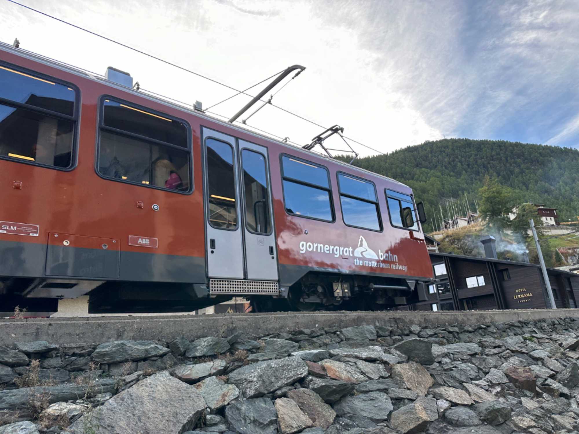 Nous avions rendez-vous à 9 h 30 pour se rendre au départ du train à crémaillère du Gornergrat. Le Gornergrat (3'089 m) figure sur la liste des incontournables de la région. Le panorama alpin ainsi que la vue unique sur le Cervin s'avèrent inoubliables et nous avons été privilégiés aujourd’hui d’avoir la chance de le voir dans toute sa splendeur car elle est bien timide cette jolie montagne. C’était notre jour de chance et en plus la température était bien agréable et clémente sans le vent froid venu des glaciers qui entourent plusieurs arrêts pour les points de vue. Grâce à sa plateforme panoramique ensoleillée et accessible toute l'année, le Gornergrat, à 3'089 m d'altitude, figure depuis 1898 sur la liste des plus belles excursions de Suisse. Le Gornergrat Bahn était le premier train à crémaillère du monde. Aujourd'hui, ce train moderne et durable se déplace grâce à un mécanisme de rétroaction qui récupère l'énergie, garantissant des trajets sobres. Grâce à cette méthode, l'énergie pour une à deux nouvelles montées en montagne est gagnée par trois descente. On lui donne le titre du « Train à crémaillère vers le ciel » car il est le train à crémaillère le plus haut d'Europe en plein air qui peut transporter ses passagers 365 jours par an de la gare de Zermatt (1'620 m) au sommet du Gornergrat. Le trajet dure 33 minutes et franchit un dénivelé de 1'469 mètres. Nous n’étions pas seuls ce matin car personne ne veut manquer cette activité lors de leur passage à Zermatt. Sur 9.4 km de voie il passe par des ponts impressionnants, des galeries ainsi que des tunnels et longe des forêts de mélèzes et d'arolles, des gorges et des lacs de montagne. Nous avons fait le trajet jusqu’au premier point de vue et nous sommes débarqués du train pour faire nos premières photos. Ensuite nous avons repris le train jusqu’au sommet. Comme la vue était belle et le temps si clair pour y prendre des superbes photos. Plusieurs sont allés faire du parapente virtuel, ils ont adoré, d’autres ont visionné le film sur les 4 saisons à Zermatt et ont aussi beaucoup apprécié. Pour d’autres c’était le temps de contempler et de profiter des paysages qui nous entouraient. Nous avons pris le chemin du retour pour notre lunch à un autre des points d’arrêt du train. Après le lunch le groupe s’est séparé et plusieurs ont suivi Barbara et Sophie en randonnée jusqu’à Zermatt. Quelle merveilleuse journée nous avons eu et surtout quelle chance!