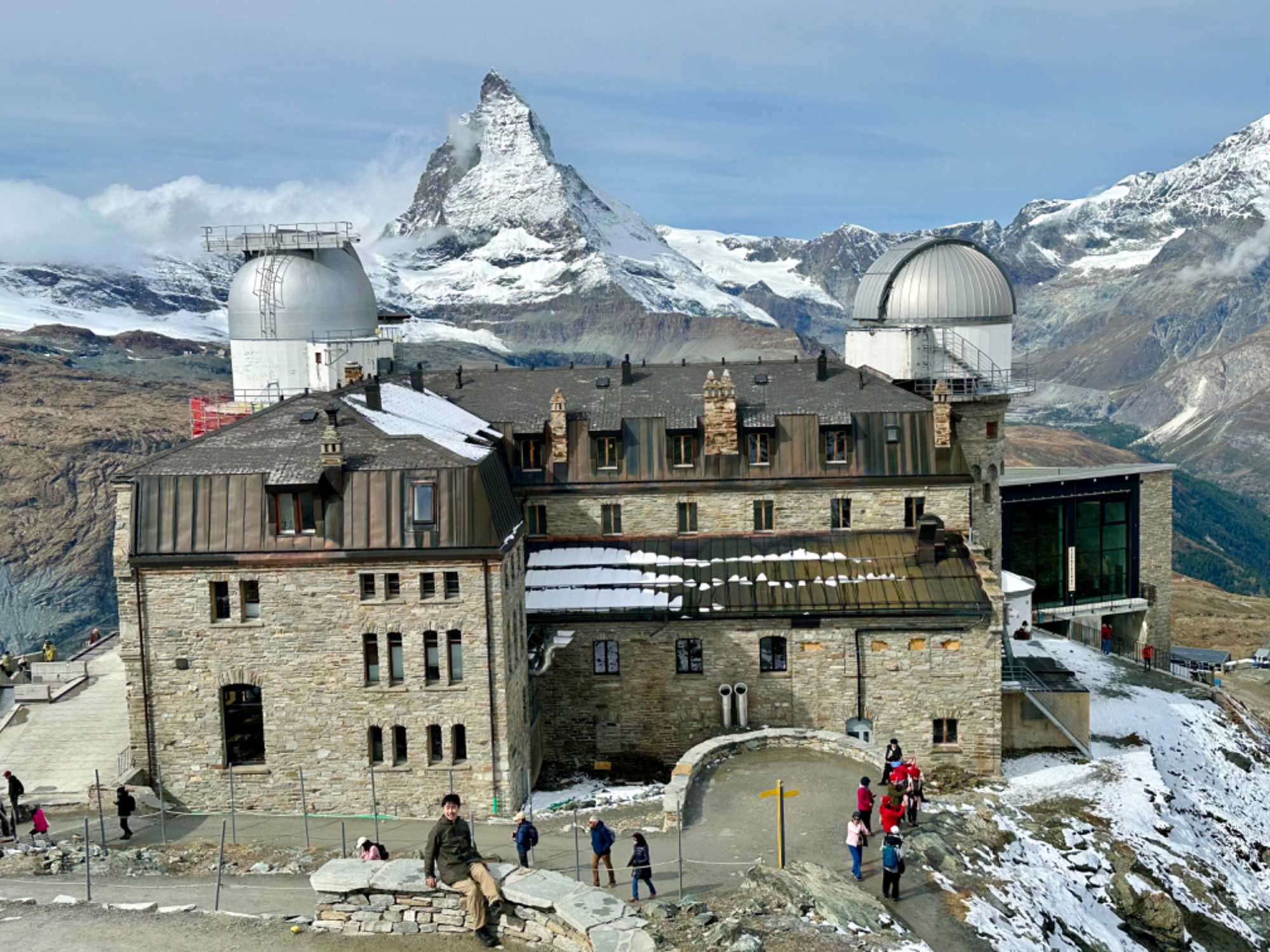 Un bon petit déjeuner à notre très bel hôtel ce matin avant de quitter pour notre journée de découverte de montagnes entourant Zermatt. Zermatt est le village de montagne des superlatifs. La région autour de Zermatt, Täsch et Randa est la plus ensoleillée de Suisse. MétéoSuisse l'a également confirmé. Peu de nuages pénètrent dans cette région entourée de 38 sommets dépassant 4 000 m, ce qui procure à Zermatt un climat sec et ensoleillé. La destination située au pied du Cervin peut en effet se targuer de nombreux records. Dans le top 10 des stations les plus prisées au monde, Zermatt jouit d'un domaine skiable sans équivalent : 350 kilomètres de pistes à dévaler en tutoyant les plus hauts sommets des Alpes. Une expérience unique. À Zermatt, 1 620 mètres d'altitude, les sommets jouent dans la cour des grands, des très grands même : 34 des plus de « 4 000 », sur les 58 que compte la Suisse sont à portée de vue du domaine. Son allure de pyramide élancée, qui rappellera à certain une autre icône suisse, le Toblerone, a coûté la vie à plusieurs centaines d'aventuriers qui ont tenté de le gravir. On le reconnaîtra maintenant si on mange une tablette de chocolat, Toblerone! Je me suis réveillée ce matin avec la belle lumière qui s’abattait sur le célèbre Cervin, la montagne la plus photographié lorsque nous sommes à Zermatt. C’était tout un spectacle de voir changer la lumière et de le photographier sous tous les angles. Il faisait frais mais nous pouvions être en robe de chambre sur notre balcon. Il faut dire que ma petite sœur Sophie qui est venue nous rejoindre est une passionnée photos et pour elle le froid n’est pas un obstacle pour prendre la meilleure photo. Quelle patience elle a mais nous en profitons tous.