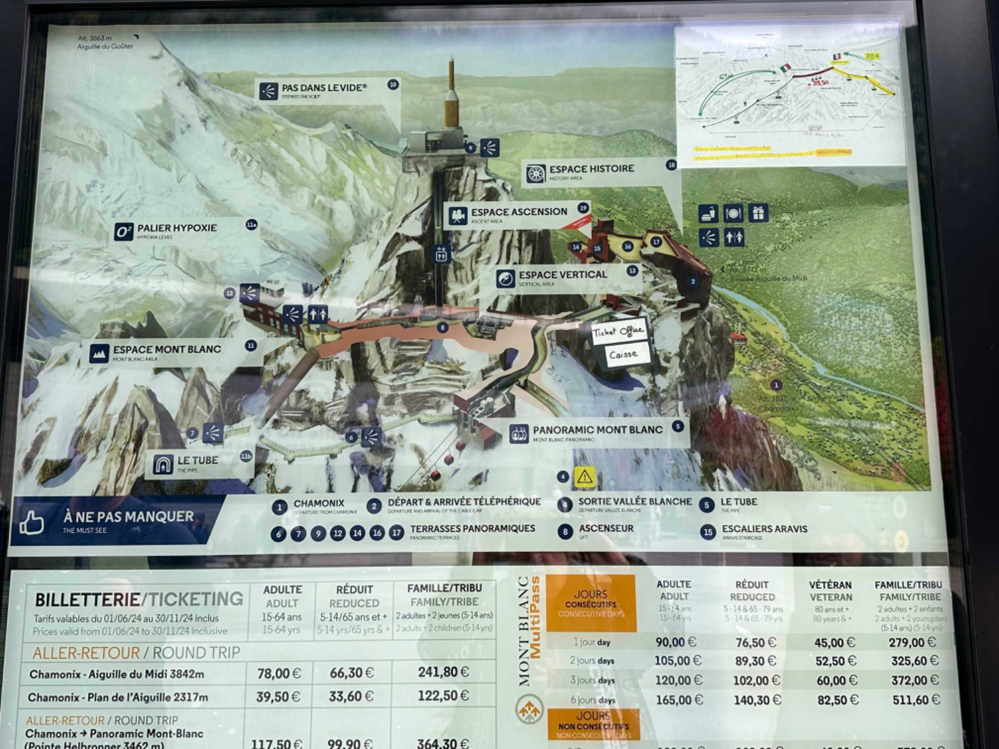 Après une bonne nuit de sommeil nous quittons pour notre visite d’aujourd’hui à l’aiguille du midi. Nous retournons vers Chamonix pour arriver en avance car nous avons une heure précise de réservation pour monter tout en haut de l’aiguille du midi. Le soleil est au rendez-vous mais nous n’avions pas prévu que le vent pourrait nous empêcher de faire cette activité mais ce fût le cas. Ils nous ont tout d’abord repousser l’heure pour le départ vers le premier pallier pensant que le vent tout en haut de la montagne cesserait. Nous en avons tous profité pour faire une belle promenade dans Chamonix et manger un petit lunch car nous devions le faire en haut du sommet. À midi ils nous ont informé que nous ne pourrions pas accéder en haut du sommet et que notre activité serait annulée. Comme j’ai un super groupe personne n’a fait de remarques et tous étaient bien compréhensifs car le risque de monter et de ne pas redescendre n’était pas dans nos projets.