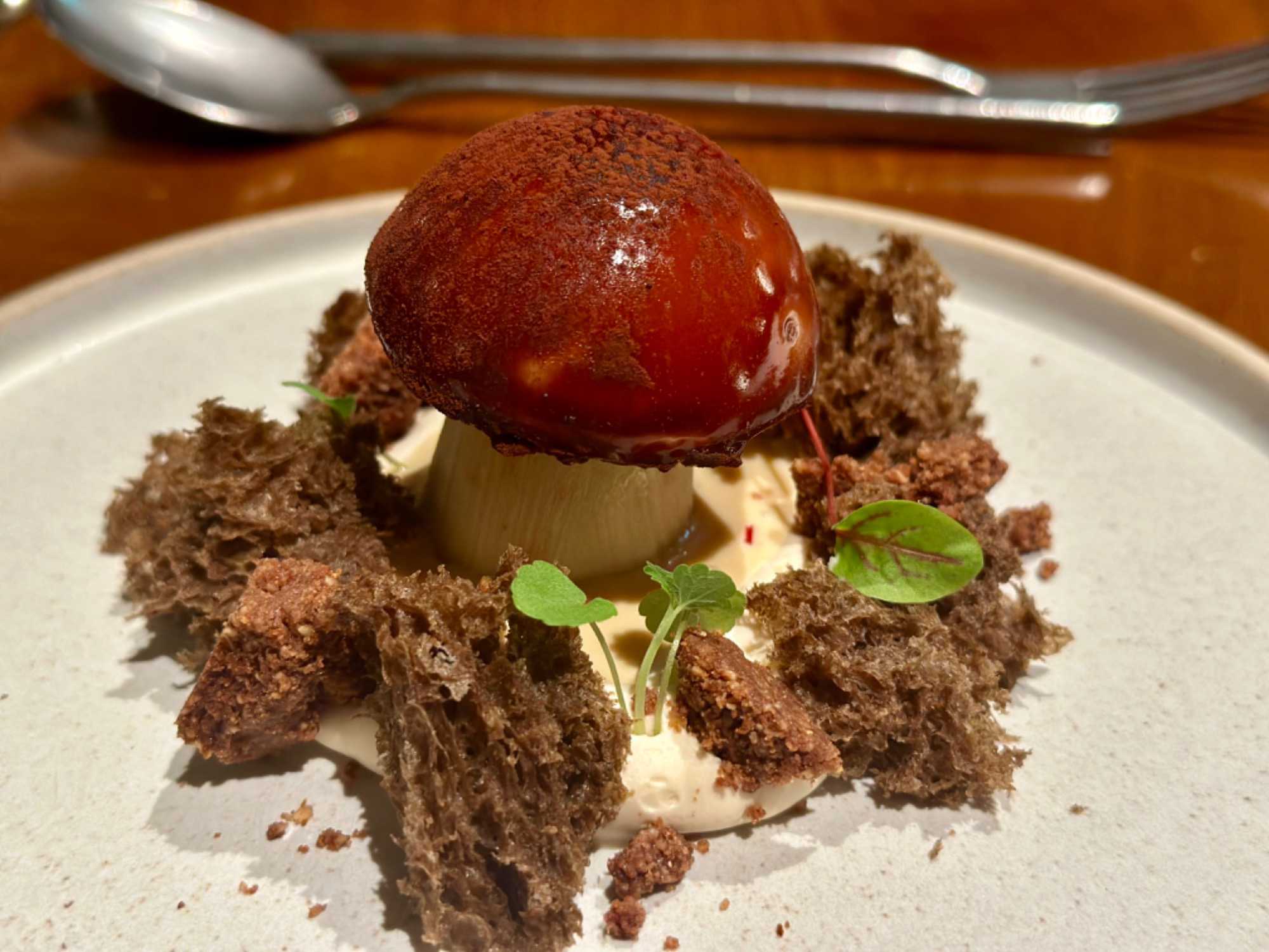 Ce soir nous étions attendus pour un souper gastronomique dans un très ancien restaurant de la ville. Nous avions ce soir un repas à base des produits de la chasse. Ce fût un excellent souper en entrée une spécialité locale de bouchées au fromage, avec une brochette de chevreuil, cerf et sanglier sauce au champignons sauvages. Mais le clou de la soirée fût notre dessert a la saveur de bolet (champignon) une œuvre d’art dans cette présentation d’un bolet entouré de gateau caramel, chocolat blanc et noir. C’était un délice pour les yeux et pour le palais. La photo est très représentative de ce dessert exceptionnel et unique.