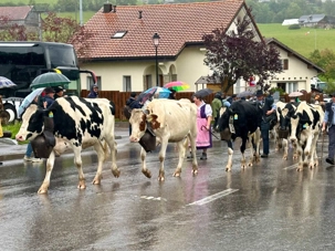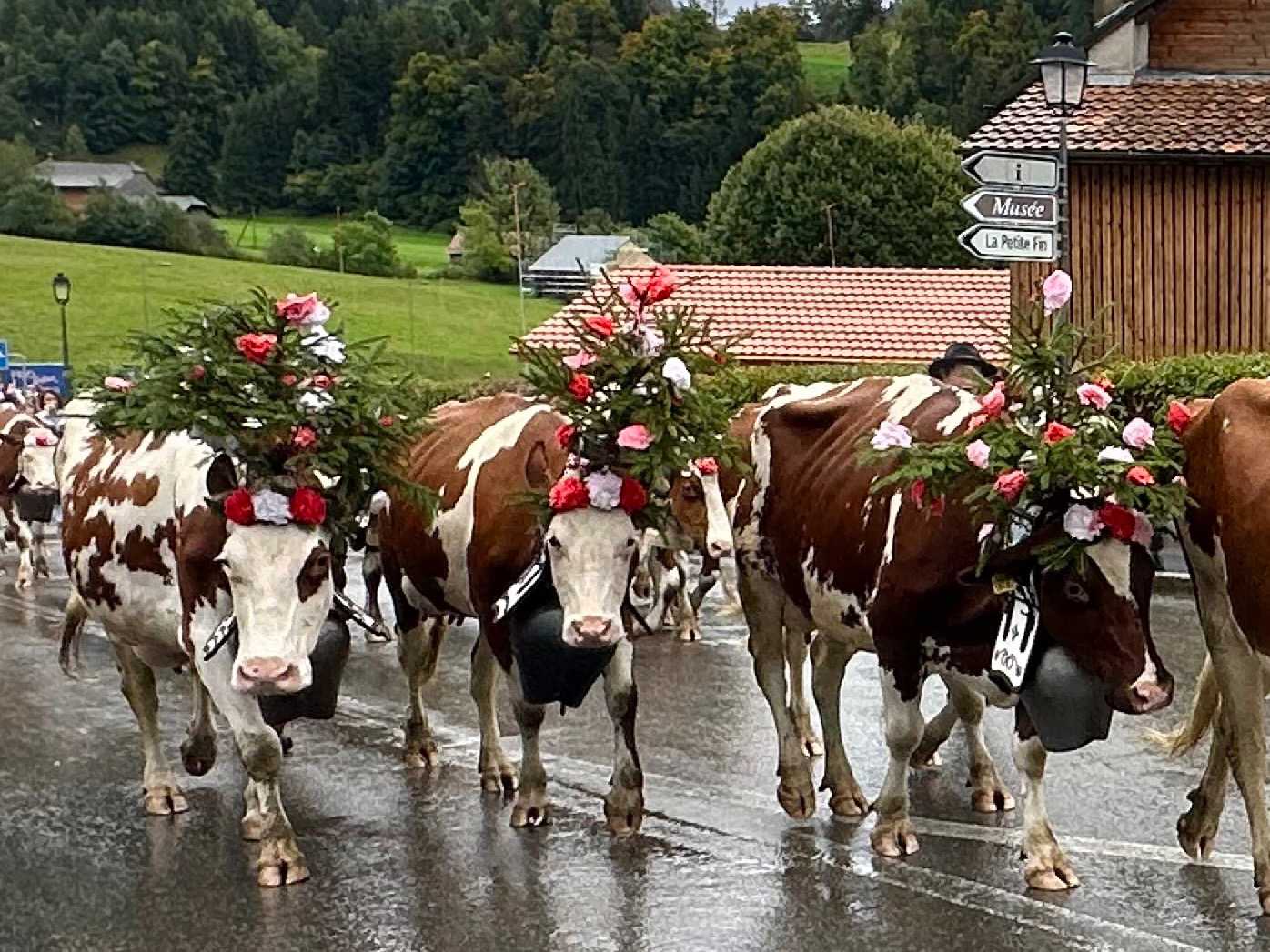 La vie au chalet, ses tâches d’entretien, impliquent une connaissance intime de l’environnement montagnard et du troupeau. L’équipe des armaillis est en effet responsable de l’entretien de l’alpage (épierrage, fumure, lutte contre les broussailles, entretien des bâtiments et des installations, chemins d’accès et clôtures…) ainsi que de la préparation du bois nécessaire à la fabrication du fromage. Les conditions de cette dernière – et les compétences qu’elle exige – diffèrent de ce que l’on rencontre dans les fromageries de plaine : chauffage du lait au feu de bois, fluctuations de la qualité du lait selon les jours, le temps et les pâtures, entretien des cultures lactiques d’exploitation, sortie et pressage du fromage à la toile font partie du quotidien de l’alpage, tout comme l’utilisation d’outils manuels ou d’équipements simples. Nous attendons patiemment la descente des premiers troupeaux prévus vers 11 h 00. Nous sommes arrivés vers 8 h 30 car ici on ferme les routes si les vaches sont durant leur descente. Nous l’avons bien vérifié car après notre matinée nous avions un repas prévu à Gruyère et nous avons suivi un des troupeaux descendus des alpages pendant près d’une heure. Un spectacle oui mais un peu long, ça ne marche pas vite une vache. Dommage nous sommes sous la pluie mais on se console en regardant arriver les premiers troupeaux accompagnés par les familles locales habillés en costume traditionnel lorsque nous nous sommes habillés de plusieurs pelures et nous n’en n’avons pas de trop. La pluie est dérangeante mais c’est la vie et on ne peut rien changer.
