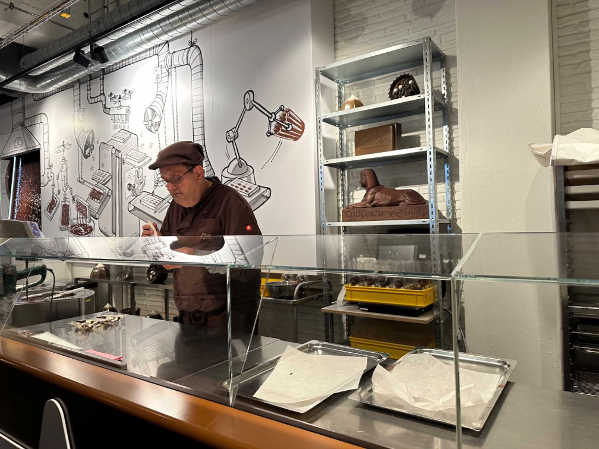 Aucune autre crème n’arrive à la cheville de la double crème de la Gruyère et surtout lorsqu’on l’accompagne avec des délicieuses meringues. C’est un dessert qui ne laisse pas indifférent. Après ce bon repas il était venu le temps de se diriger vers la maison Cailler. La Maison Cailler fait partie des incontournables à visiter. Entourés de douces effluves, nous avons plongé dans les secrets de cette usine de chocolat. Le chocolat Cailler est un symbole de La Gruyère. Produit avec du lait de la région, il sort de la célèbre fabrique Cailler depuis 1898. Lors de notre visite, nous avons débuté l’expérience chocolatée par un itinéraire historique ludique et interactif. Nous avons également découvert, l’histoire de la famille Cailler et des autres grands noms du chocolat en Suisse.