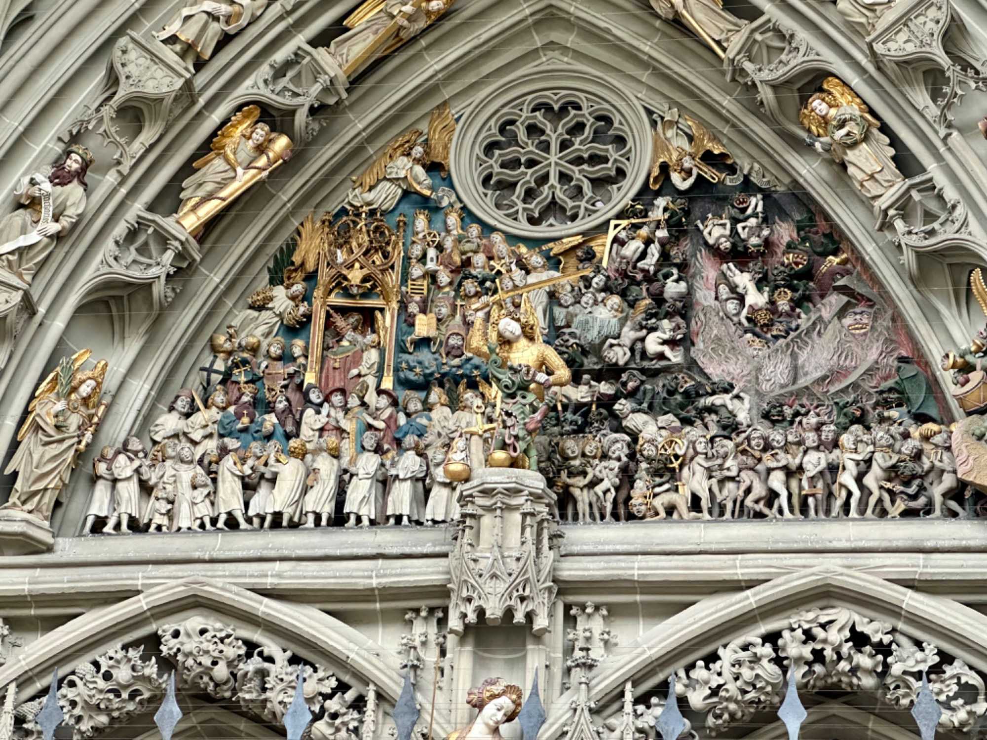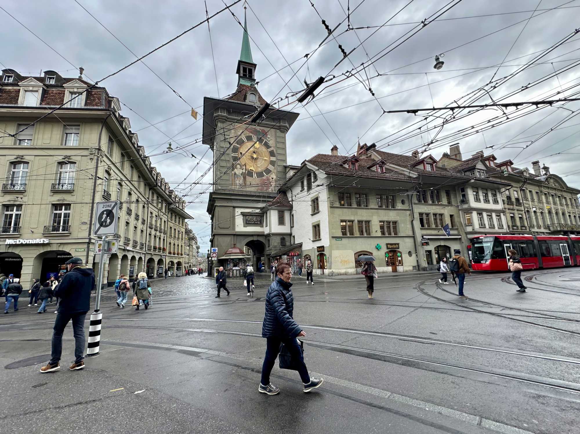 Sur la rive de l’Aar, le paysage se déploie aujourd’hui entre l’ancienne fosse aux ours faisant face à la vieille ville et le fleuve en contrebas. Coup de chance les 3 ours sont souvent bien occupés à dormir et ne sont pas très sociable mais ce matin ils sont bien présents et se laissent photographier pour notre plaisir. Nous reprenons notre autobus pour faire un tour panoramique avant de descendre dans la vieille ville. La vieille ville de Berne, inscrite au patrimoine mondial de l'UNESCO, est construite sur une presqu'île, baignée par l'Aar, et offre un impressionnant panorama alpin. Elle doit son caractère romantique et sa beauté à l'unité architecturale de sa vieille ville. Elle possède 6 kilomètres d'arcades, des fontaines ornées de personnages de la Renaissance, la collégiale, des façades en grès bien conservées ainsi qu'une mosaïque unique de toits caractérisent l'image de la ville de Berne. Fondée en 1191, c'est l'un des témoignages les plus exceptionnels de l'architecture des villes au Moyen Âge en Europe. Nous suivons Hector qui nous explique tous ces beaux bâtiments très anciens. Nous sommes impressionnés par toutes les arcades qui nous permettent de marcher à l’abri de la bruine qui s’arrête et recommence. Quelle belle idée d’avoir construit la ville de cette façon. C’était souvent des caves à vins qui se succédaient sous les arcades. Nous avons terminé notre tour de ville à l’Horloge et à l’heure du midi qui nous a donné la chance d’assister à son petit spectacle.