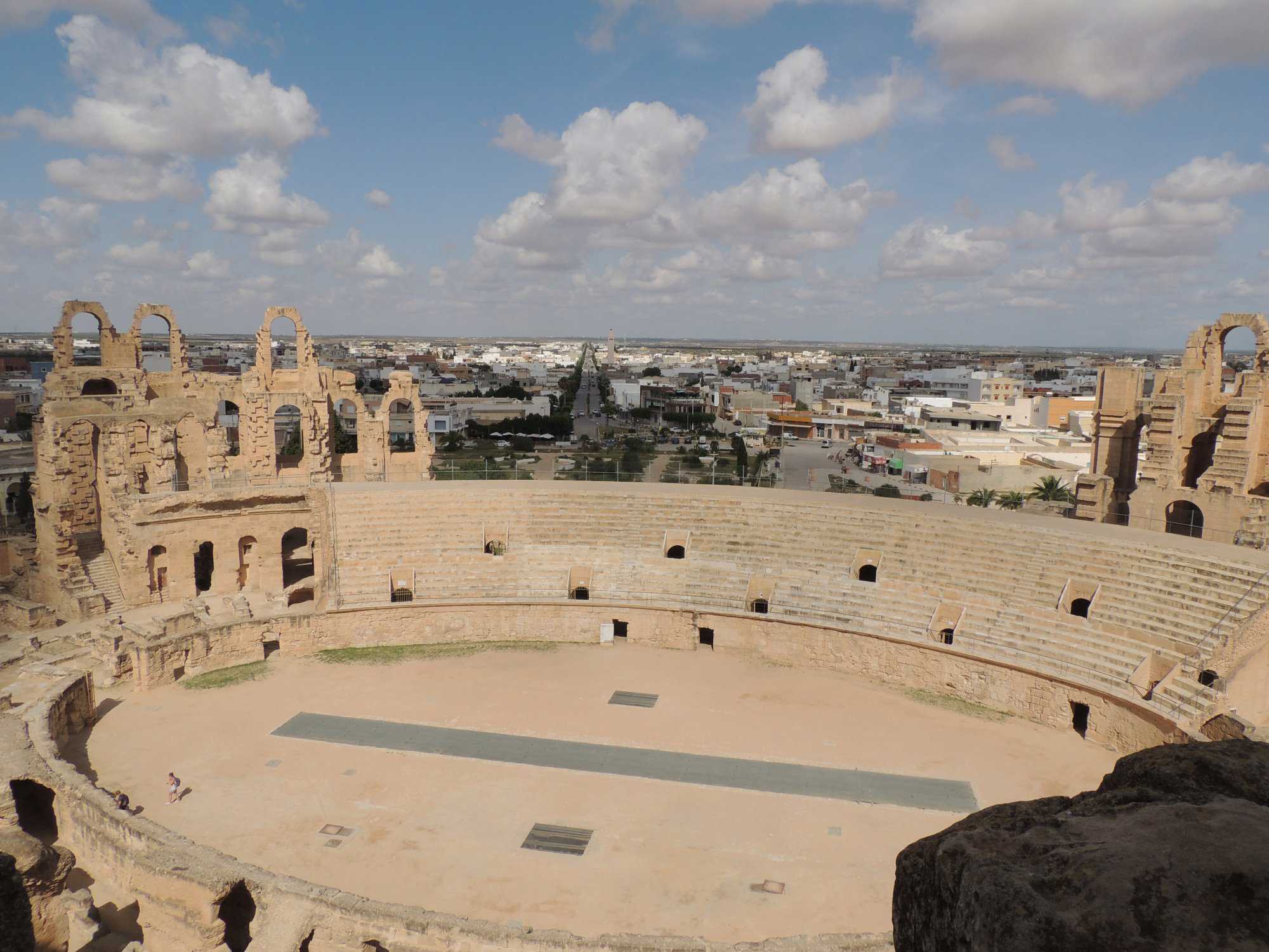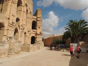 Sur la route entre Hammamet et Djerba, nous avons pris le temps de nous arrêter pour visiter le magnifique amphithéâtre romain situé à El Djem, une ville située aux portes de la région du Sahel (Désert du Sahara). Cet amphithéâtre, le plus grand de l’Empire romain (entre 27 000 et 30 000 spectateurs) après le Colisée de Rome (45 000 spectateurs), accueille chaque été depuis 1985 le Festival international de musique symphonique d’El Jem (écrit ainsi, aussi).