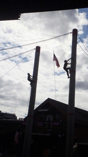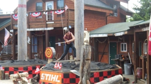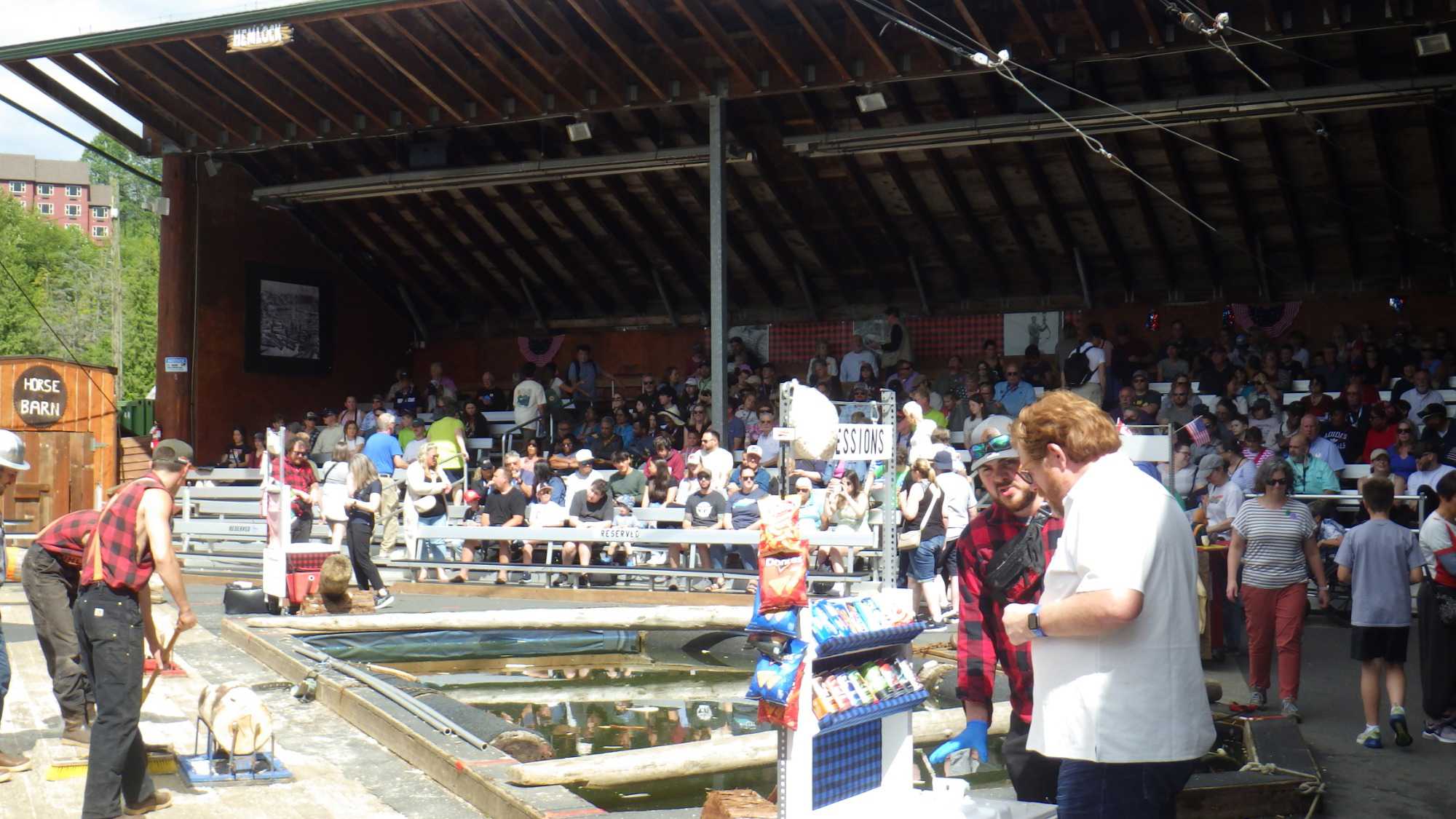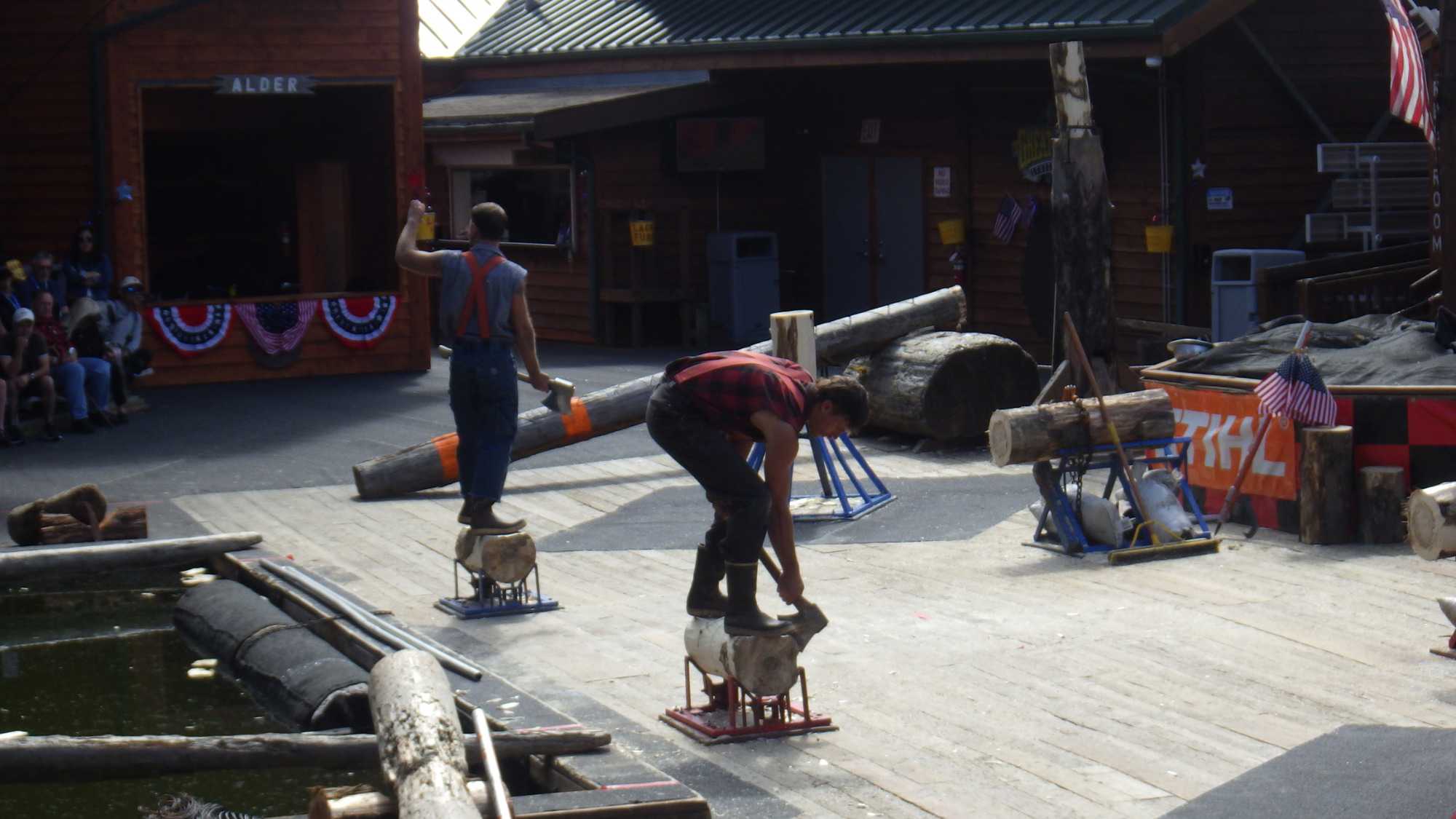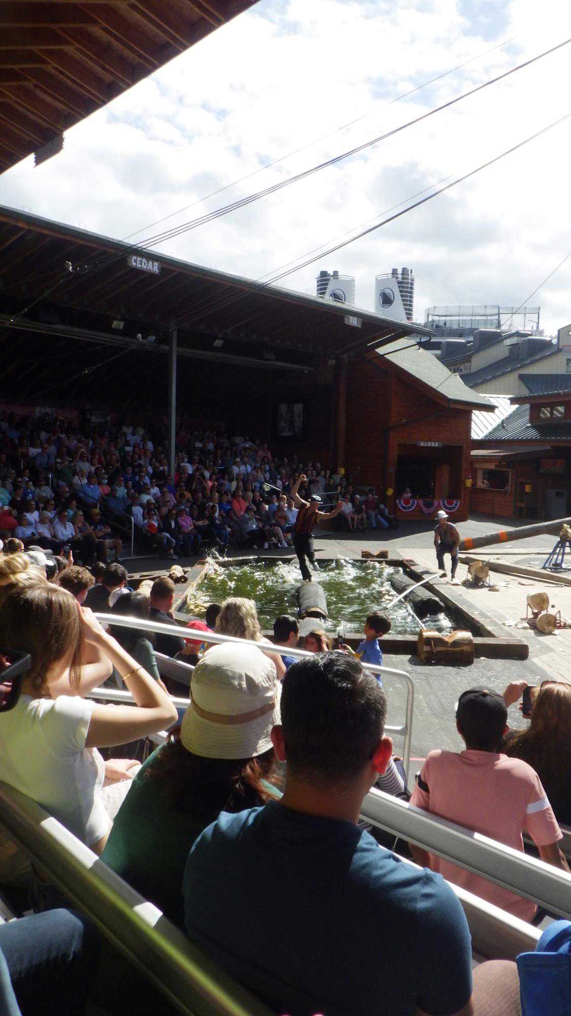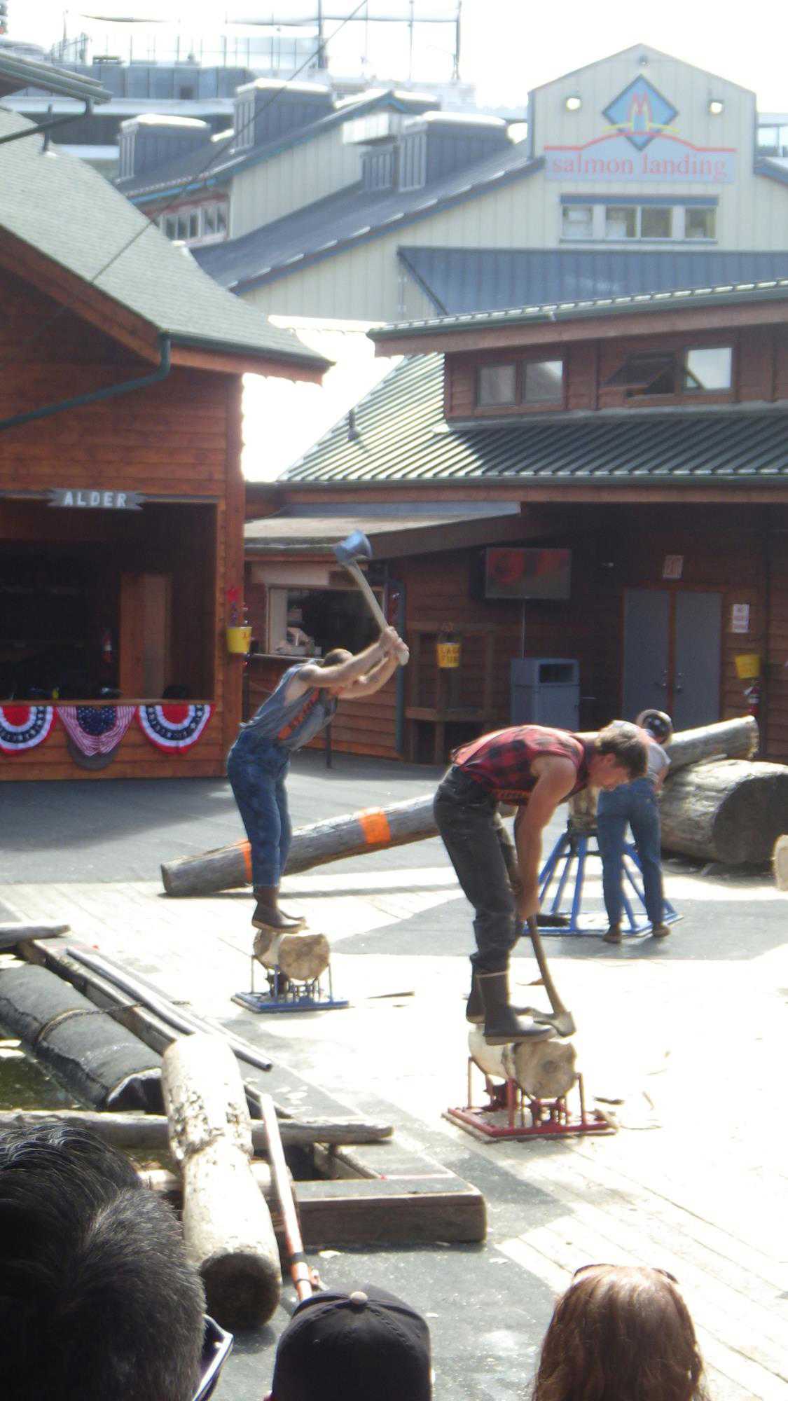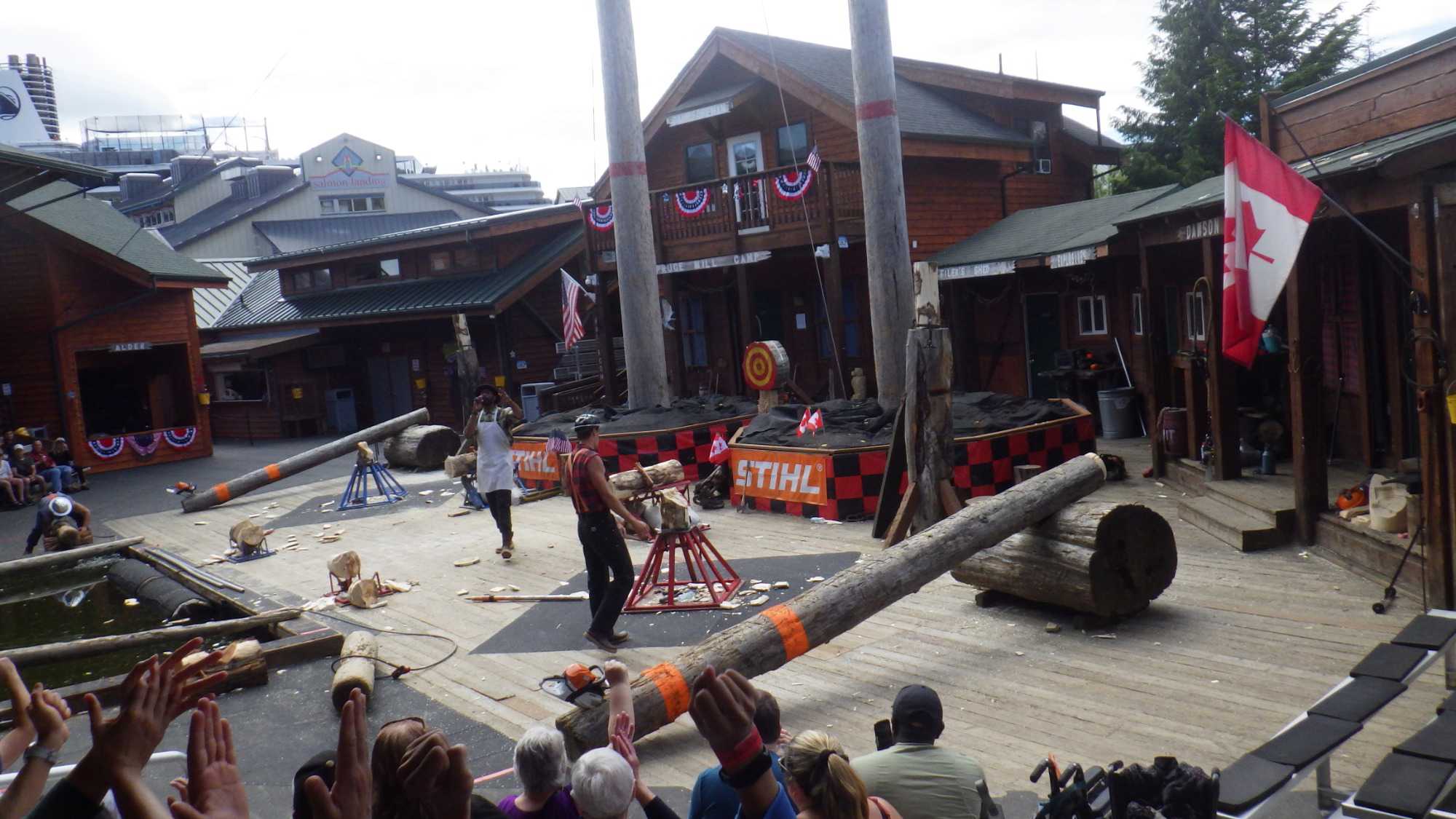 Je peux vous dire que le spectacle des bûcherons était enlevant et qu’il faisait chaud, autour de 24 degrés. Nous avons eu tellement de plaisir et en prime, l’équipe du Canada a gagné contre l’équipe des É.-U.! Ce spectacle s’appelle «The great Alaska Lumberjack Show» et met en compétition des hommes qui savent manier autant la scie que la hache. On peut y voir de jeunes draveurs en action et des spectateurs qui s’émoustillent face à la dose de testostérone et aux performances de ces bûcherons. La compétition consiste à couper le plus rapidement possible des bûches à la hache, à la sciotte. Puis, les compétitions s’enchainent : la montée dans un arbre, le duel de la gigue sur la «pitoune» dans l’eau et bien d’autres, le tout animé de manière humoristique par un chef cuisinier… humoriste. Ce fut vraiment une superbe activité que ce spectacle de bûcherons, surtout que j’avais avec moi Léo et Roger qui avaient déjà touché à ce métier.
